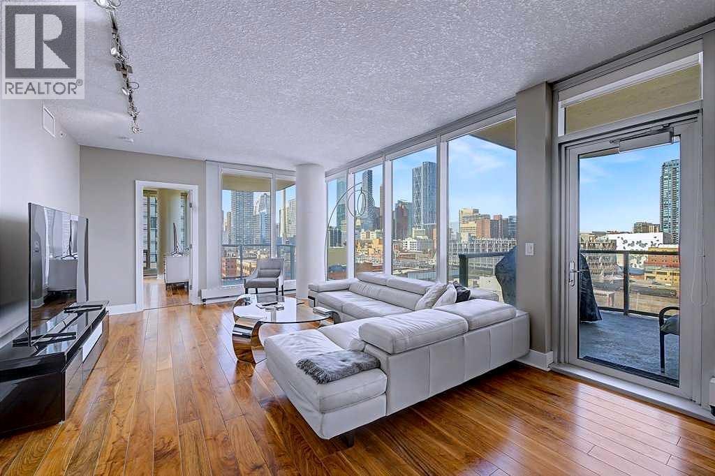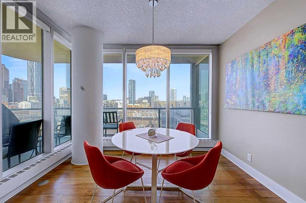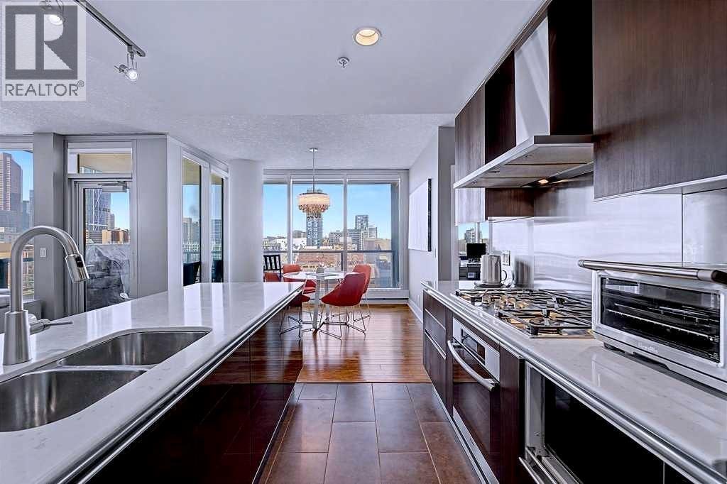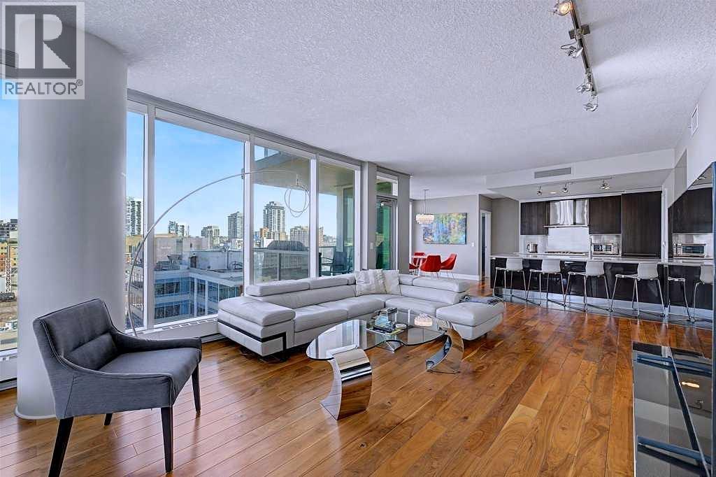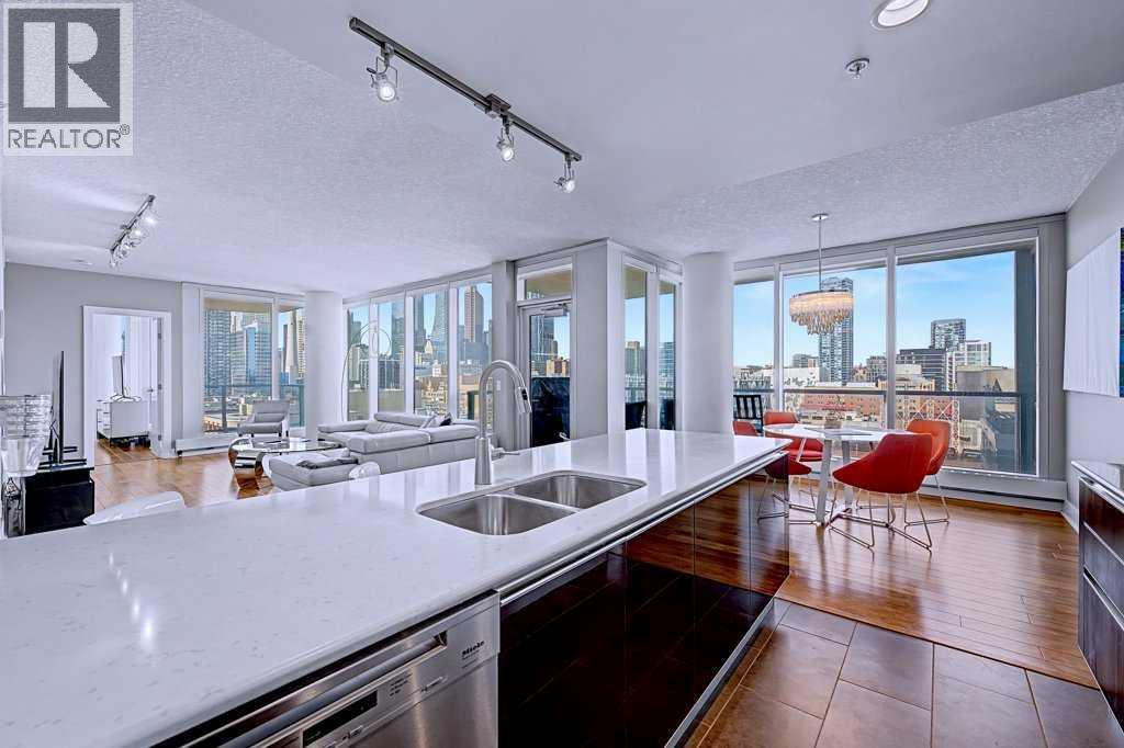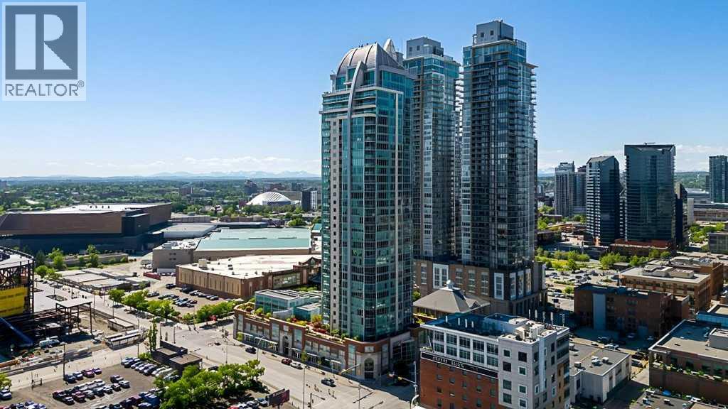 Welcome to Arriva, one of Calgary’s premier high-rise addresses. Prime corner location on the 10th floor with northwest exposure, this beautifully appointed residence offers over 1,200 square feet of refined urban living and spectacular downtown and city views. Offering 2 bedrooms, 2 full bathrooms, 2 titled underground parking stalls, assigned storage, and central air conditioning.The open-concept living, dining, and kitchen area is bright, spacious, and designed for comfortable everyday living and easy entertaining. Floor-to-ceiling windows make an immediate impression, flooding the home with natural light and showcasing the skyline from every room. Rich hardwood and tile add warmth and sophistication throughout.The contemporary Snaidero kitchen is both stylish and functional, featuring quartz counters, a large island, generous pantry space, and a premium Miele appliance package including a 5-burner gas cooktop. The primary bedroom offers excellent space, a custom walk-through closet, a 4-piece ensuite with separate shower and soaker tub, and access to one of two private balconies. The second bedroom is flexible and thoughtfully designed, ideal as a guest room, office, or both, complete with a built-in Murphy bed/storage dresser.With two separate balconies, a stunning lobby, full-time concierge/security, guest suites, and an outstanding location close to downtown, new convention center and arena, restaurants, fitness, and entertainment, this is an exceptional opportunity to own a beautifully finished home in one of Calgary’s most sought-after buildings. (id:53676)