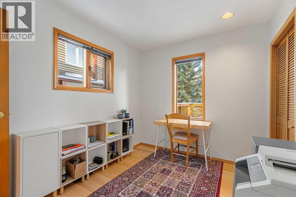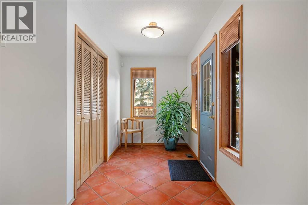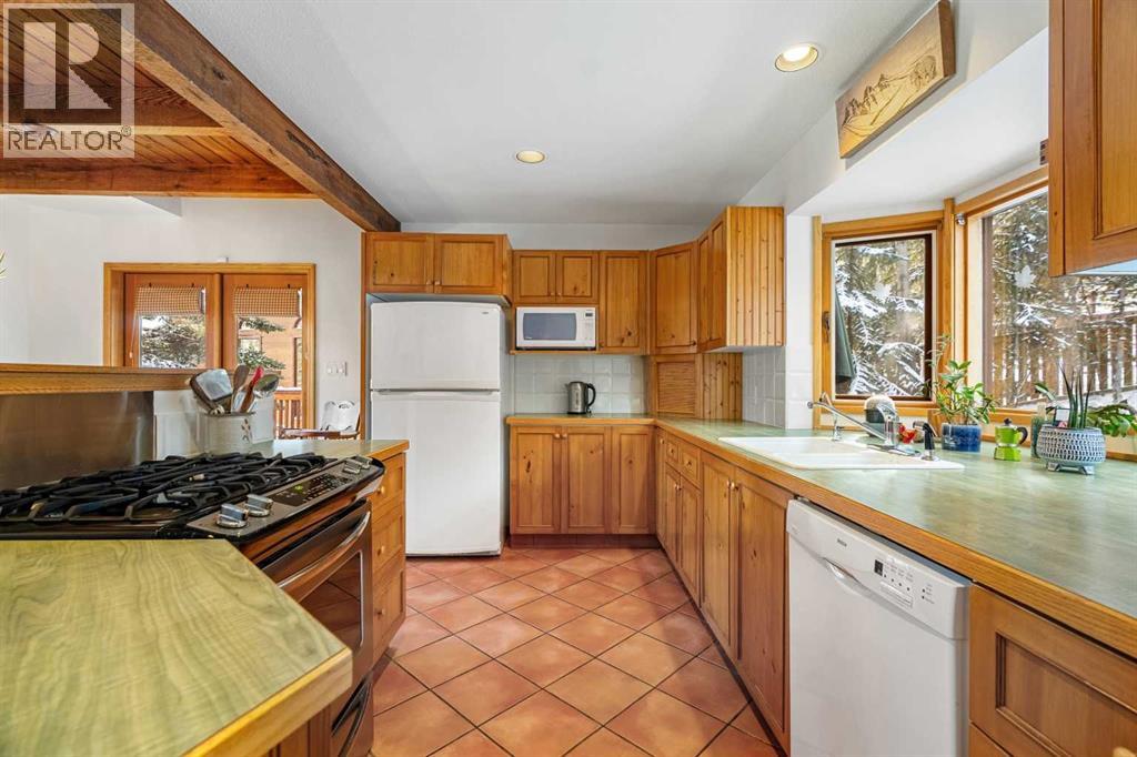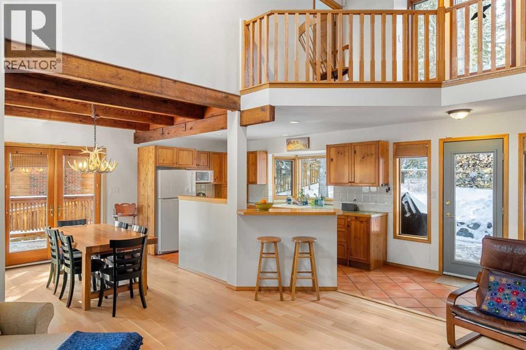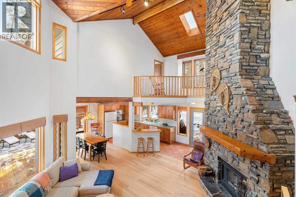 Tucked into one of Canmore’s most sought-after neighbourhoods, Rundleview offers quiet streets, mountain views, and easy access to Quarry Lake and the Nordic Centre—just a 1.5 km walk to downtown. This established enclave is known for its larger lots, mature trees, and direct connection to trails, making it a favourite for those who value both privacy and proximity. With an alpine feel and nearly 3,000 sq ft of living space, this home features 4 bedrooms, a walkout basement, expansive decks, and seamless outdoor access from all three levels. An extra-long driveway provides ample parking, including space for an RV, in addition to the attached garage. Designed to embrace its surroundings, enjoy morning sun from the northeast-facing front deck, then follow the light as it wraps around the side and into the backyard. End the day with a soak in the hot tub après-ski, surrounded by mountain air. Step into the heart of the home where a dramatic two-storey stone fireplace anchors the great room, framed by windows and natural light. The open layout creates effortless flow between living, dining, and kitchen spaces—ideal for everyday living and entertaining. The kitchen overlooks a cozy dining nook with patio doors leading to a wraparound side deck, perfect for BBQs and gatherings. A main-floor office or guest bedroom offers flexibility for visitors or work-from-home needs. Upstairs, two additional bedrooms with private balconies and a loft area provide separation and space for family or guests. The tiled lower-level entry is designed for practical mountain living, complete with a drop zone for gear, a fourth bedroom, and direct garage access. The fully developed walkout level also features a generous rec room with a cozy gas fireplace and plenty of space to entertain. Mechanical systems have been updated, and the durable metal roof adds long-term peace of mind. Inside, the home shows pristine with newly refinished hardwood floors and fresh paint throughout. A rare opportuni ty to experience timeless mountain living in one of Canmore’s most desirable neighbourhoods. (id:53676)