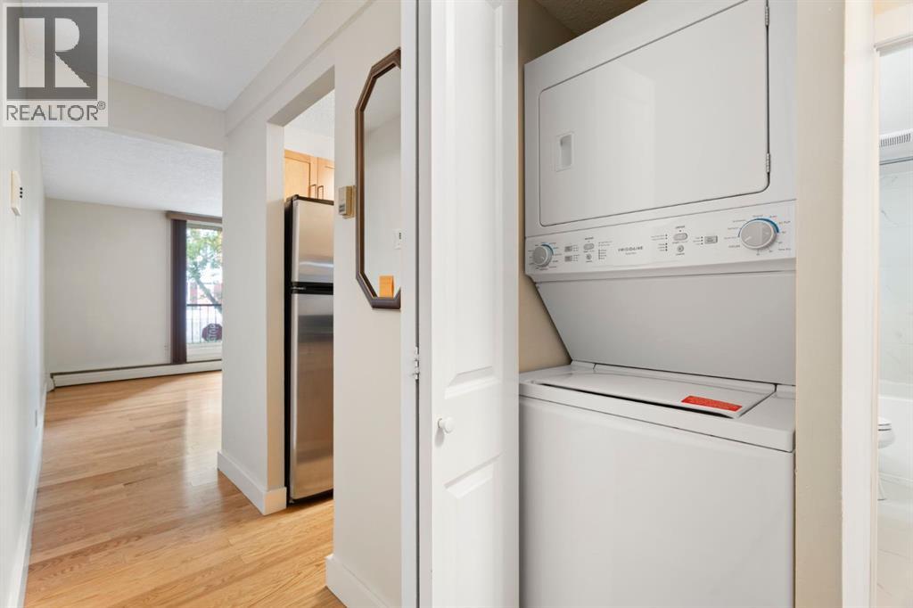 OPEN HOUSE SUNDAY OCT 26TH FROM 1-3PM! PRICE REDUCTION, AMAZING VALUE! Located in the vibrant community of Sunnyside, this freshly painted 2 bedroom 1 bathroom END unit apartment is MOVE IN READY. Entering the unit you'll be welcomed with hardwood floors, a generous storage room and your stacked, in-unit laundry (April 2025). Walking into the main living space you'll appreciate the large kitchen featuring stainless steel appliances, granite countertops, an open concept floor plan with a good sized living/dining area and a newer fireplace, 2023. With extra windows across the front, side and back (due to it being an end unit), you'll always feel warm and at home. The oversized patio doors lead to a SOUTH FACING patio that's great for a morning coffee or evening wine. The 4 piece bathroom was renovated in November 2020 and has tile flooring. Both bedrooms are larger than you'd normally find in a two bedroom apartment with the carpet being replaced in 2019. Other features of the unit/building are that you're just a few steps to your parking stall which has a plug, there's a new ramp being installed at the main entrance and it's a concrete building. The biking score is an impressive 99 with a walkability score of 95 and transit score of 77, almost unheard of! Other important destinations are: Steps to Safeway, walking distance to coffee, cafes, boutiques, river pathways, 2 blocks from the Bow River, 2 blocks from Kensington, 1 block from the C train, and just 1 stop on the C train from Sait and 2 stops to the University of Calgary. (id:53676)