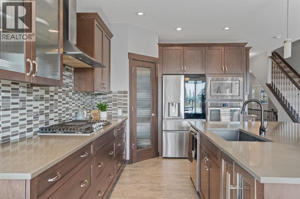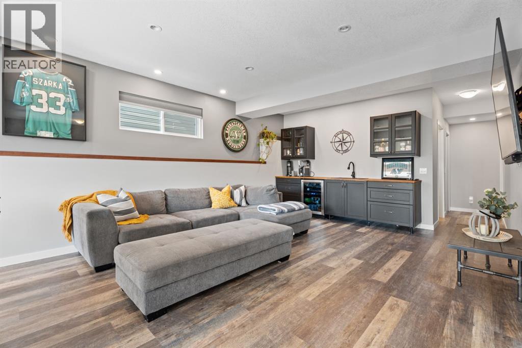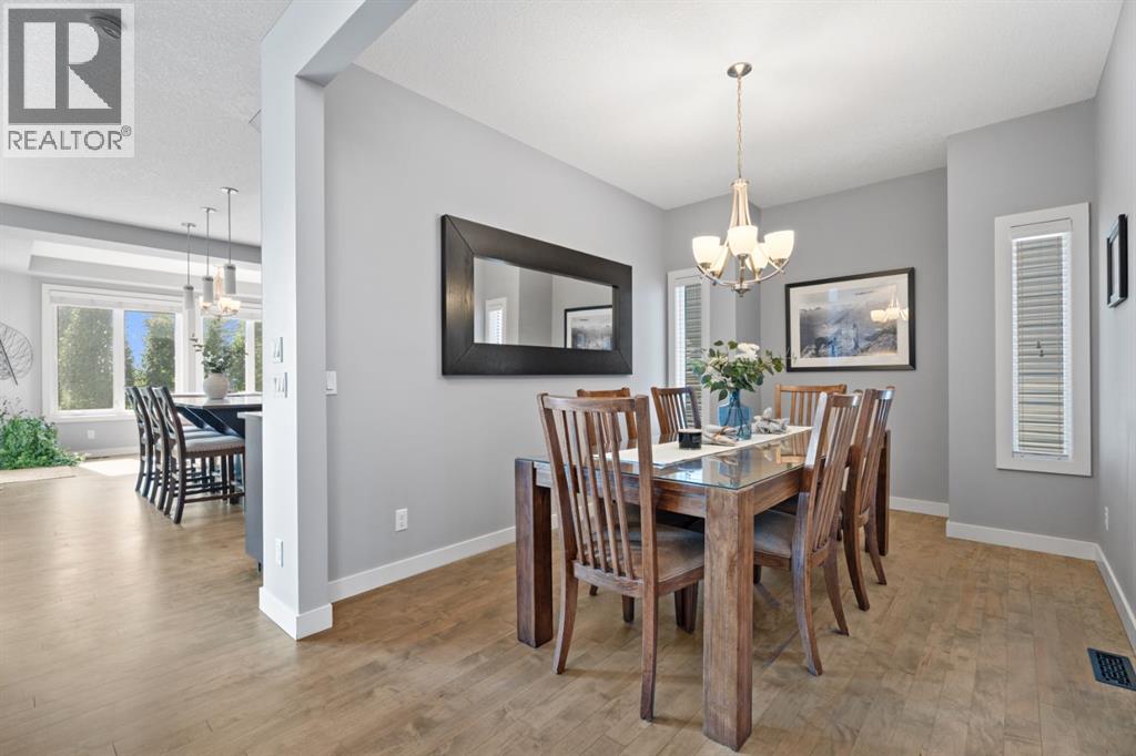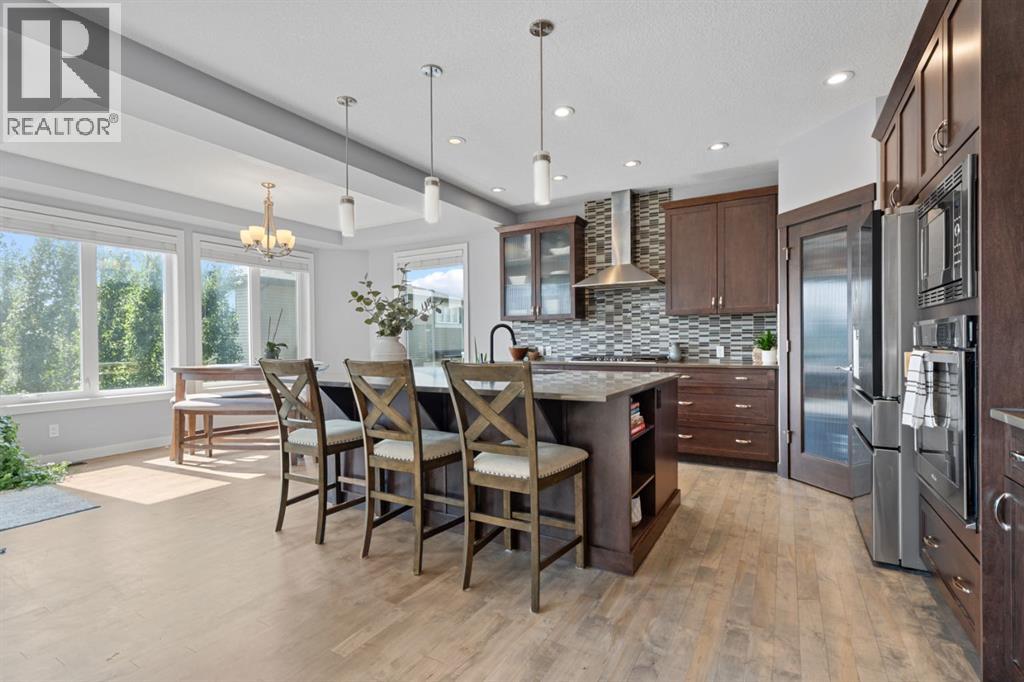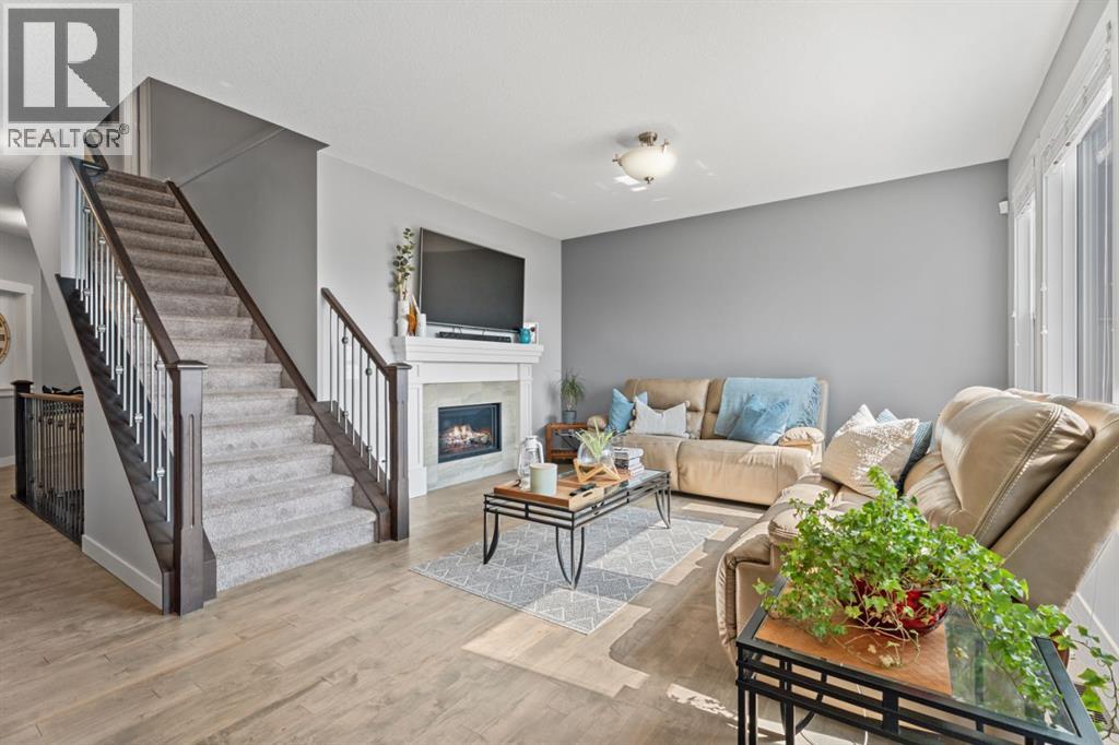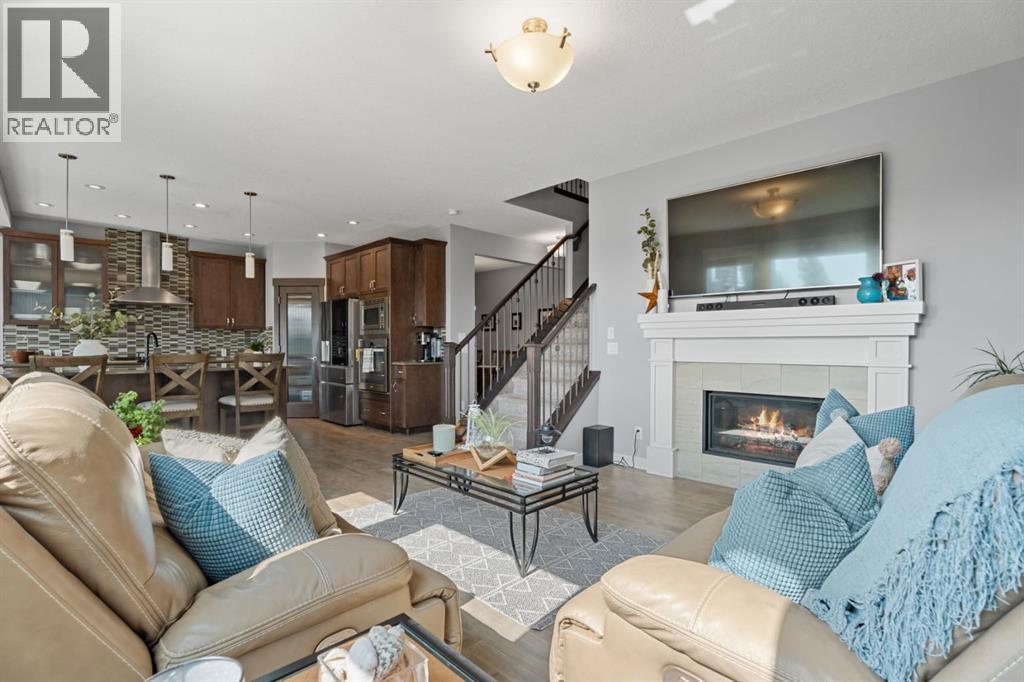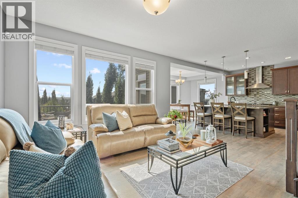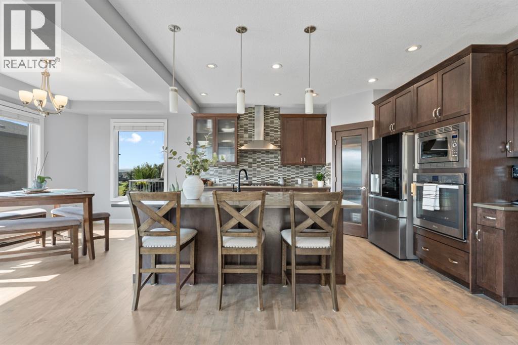 This is the only home for sale in stunning Mountainview! This home truly has it ALL. With over 4,000 sq. ft. of developed living space, a walkout basement, mountain views, and upgrades at every turn- this Sterling built stunner delivers the full package. Add in an oversized, heated double garage, executive finishes, and a layout that’s as functional as it is fabulous-check, check, check! The tiled foyer with built in bench welcomes you in, while the front office with its double sided gas fireplace sets the tone for style and warmth. A formal dining room is ready for your most memorable holiday gatherings. Then there’s the kitchen… and wow, is it a showstopper. Think massive quartz island, gas cooktop with feature hood, built in oven & microwave, brand new upgraded fridge, wine fridge, pantry, and oversized windows framing those Rocky Mountain views. The bright breakfast nook leads to your south facing, west view deck, where sun and scenery collide. The adjoining living room, anchored by the fireplace, flows seamlessly- perfect for family living or entertaining and highlighted by refinished hardwood floors and a layout that’s an easy 10/10. The large mudroom off the garage is fantastic for storage, plus even the main floor powder room is upgraded. Upstairs, the vaulted bonus room is a versatile space, and with four bedrooms up, everyone gets their own space. The primary suite is a true retreat..oversized windows, a huge walk-in closet, and a private den with its own balcony and more mountain views. Whether it’s your office, nursery, yoga spot, or reading nook, this extra space is the ultimate bonus. The ensuite is equally impressive with dual sinks, a makeup station, walk in shower, and tiled soaker tub. The fully developed walkout basement brings the wow factor even further: a full wet bar, large rec room, 5th bedroom, full bathroom, and access to the landscaped yard. There is plenty of space for multi-gen living! Picture evenings under the covered patio, garden bo xes in bloom, and maybe even a soak in the negotiable hot tub. Extras? This home has them all: oversized heated garage, A/C (under contract), water softener, year round trim lighting for curb appeal and holiday lighting. From top to bottom, this home blends luxury, function, quality and family friendly design. It’s move in ready, 'mountain view' magic waiting for you. Check out the virtual tour! (id:53676)