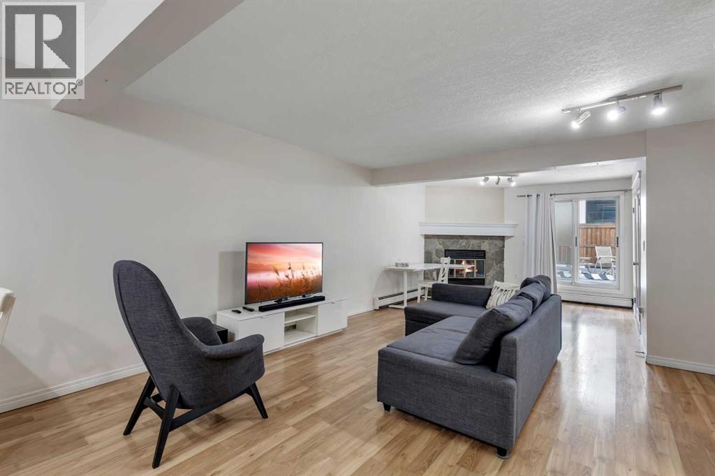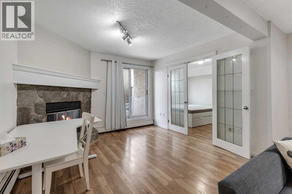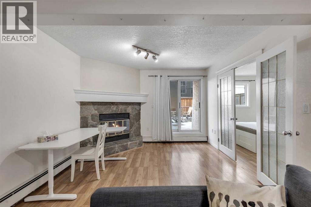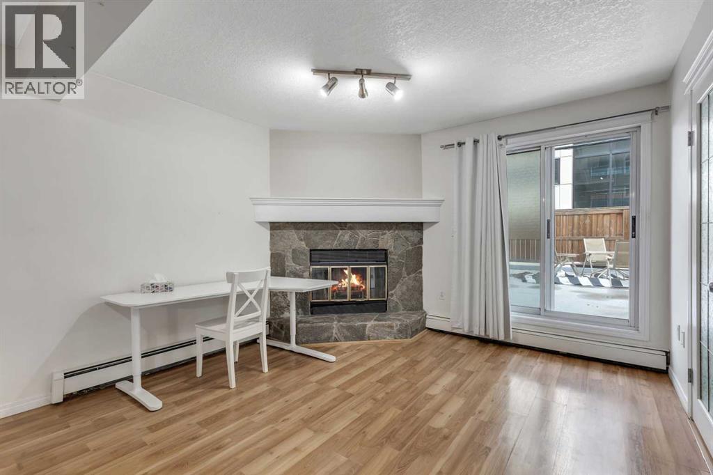 Welcome to Barcelona in Sunalta! This open plan suite offers a modern, flexible layout and massive 500+ sq ft private patio - perfect for those that enjoy the outdoors & entertaining. Beautiful laminate wood floors run throughout the space and are accented by stylish double French doors leading into the master bedroom. The spacious kitchen features maple cabinetry, and plenty of countertop space. Additional features include a 4-piece bathroom, in-suite laundry, a corner wood-burning stone fireplace & mantel, bike storage and a secured, underground parking stall. Within easy walking distance to restaurants, cafes, the Sunalta LRT station with easy access to downtown and only a half block to playgrounds & parks. (id:53676)