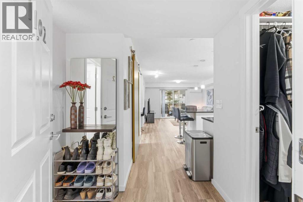 Set in Copperfield Park, this bright TWO bedroom, ONE bath home offers a rare sense of space and privacy thanks to its thoughtful layout and direct access to green space. The kitchen anchors the home with granite countertops, stainless steel appliances, ample pantry storage, and a generous island that works just as well for morning coffee as it does for casual dinners. From here, the living area flows naturally toward the back of the unit, creating a comfortable, open feeling space that easily accommodates both lounging and dining without feeling crowded. What truly sets this home apart is the private patio that opens directly onto green space. Step outside and enjoy the feeling of having your own yard but without the maintenance. With a gas BBQ hookup ready for summer evenings, this outdoor space becomes a natural extension of your living area, making the home feel larger, quieter, and more private than most condos. The primary bedroom is bright and calming, while the second bedroom features a built-in Murphy bed, offering flexibility as a guest room, home office, or both. A full bathroom, in-suite laundry, and excellent storage add everyday practicality. Located close to the building entrance and elevators, the titled underground parking stall and storage locker are easily accessed. With a park across the street, plenty of visitor and street parking, and quick connections to Stoney Trail and Deerfoot, this is a well-positioned home close to shopping, dining, and amenities in 130th Avenue, McKenzie Towne, and Mahogany. (id:53676)