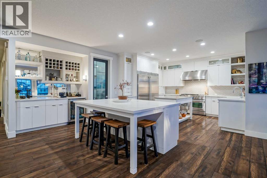 **OPEN HOUSE SUN MAR 1st 12PM - 4PM** Welcome to this exceptional McKee-built custom home in the prestigious community of Coopers Crossing, where refined craftsmanship meets unobstructed pond-side living. Offering over 3,700 sqft of professionally developed living space, this fully finished 4-bedroom, 3.5-bathroom walk-out home delivers an elevated lifestyle defined by architectural detail and premium upgrades. From the moment you arrive, the curb appeal is undeniable - an exposed aggregate driveway, covered front porch with cedar soffit detailing, and a fully landscaped lot create a strong first impression. The 708 sqft triple tandem heated garage is both functional and impressive, complete with overhead storage and room for vehicles, toys, or workshop space. Inside, a dramatic open-rise staircase anchors the main level, while engineered hardwood flooring flows throughout. The great room is designed for both everyday living and upscale entertaining, featuring a custom fireplace surround with built-ins and expansive windows framing tranquil pond views. The chef-inspired kitchen is a true showpiece. Thoughtfully upgraded with crisp white cabinetry, double islands, and premium stainless steel appliances, it includes a 48” Jenn-Air dual-fuel gas range, Vent-A-Hood range hood, and Electrolux side-by-side refrigerator/freezer. An exquisite under mount sink and refined finishes complete this elevated culinary space. From this level, step outside to your private backyard oasis: a full-width 33’4” x 9’8” composite deck with stairs leading to professionally designed stone scaping, low-maintenance turf, and a dedicated firepit and patio area (15’4” x 10’4”). Upstairs, vaulted ceilings and two skylights flood the bonus room, primary suite, ensuite, and laundry room with natural light. The primary retreat offers serene water views and a spa-inspired ensuite designed for relaxation. Three additional bedrooms complete the upper level, including one with a charming Juliet balcony. The fully developed walk-out basement extends the living space seamlessly outdoors and features a wet bar, spacious recreation area, hobby room, and additional storage. Morning coffees overlooking the water in summer. Skating on the pond in winter. This is a home designed to be experienced in every season. Additional highlights include upper-level exterior pot lights, custom built-ins throughout, security camera system and panel, pre-wired in-ceiling speakers with two Sonos bridges, dual furnaces plus A/C. Rarely do homes combine this level of finish, functionality, and uninterrupted pond views in one of Airdrie’s most sought-after communities. This is luxury living - without compromise. (id:53676)