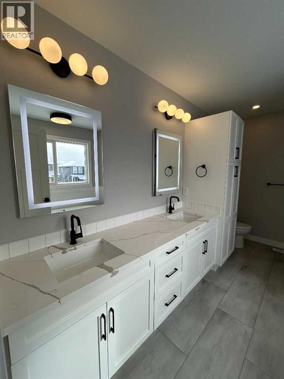Clover Construction Job # 142. 'Hickory' modified bilevel plan with triple garage. Open plan. 3 bedrooms. 2 full bathrooms. Ensuite with double sinks and freestanding tub. Island kitchen. Quartz coutertops throughout. Vinyl tile and plank floors. Vaulted ceiling in living room/kitchen area. Deck. Large fenced pie shaped lot. (id:53676)