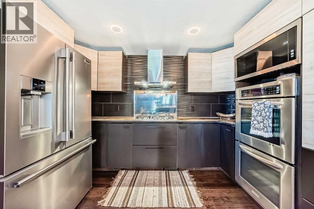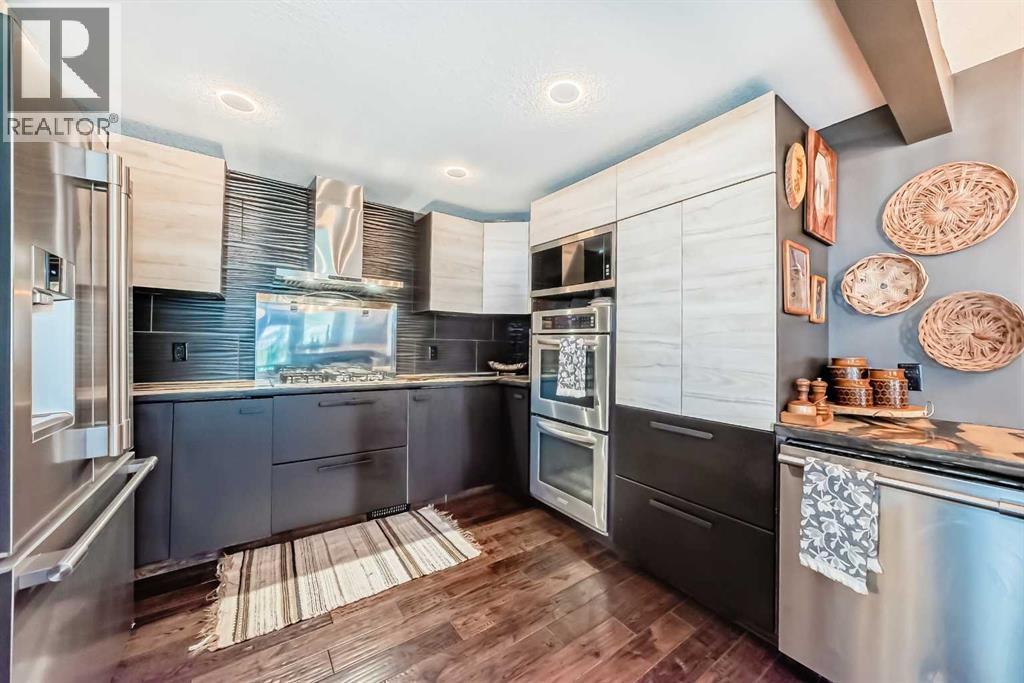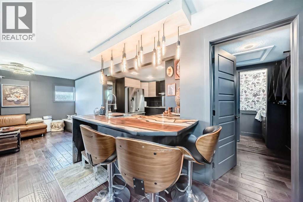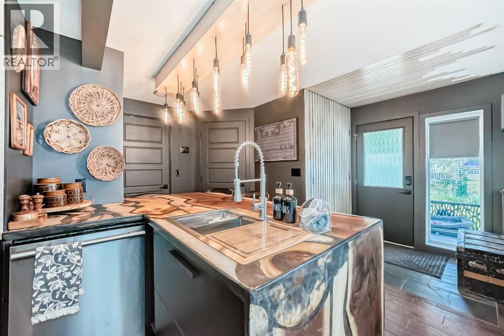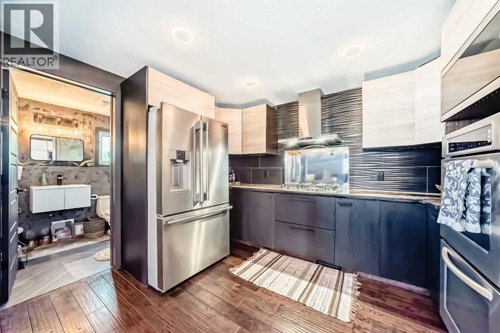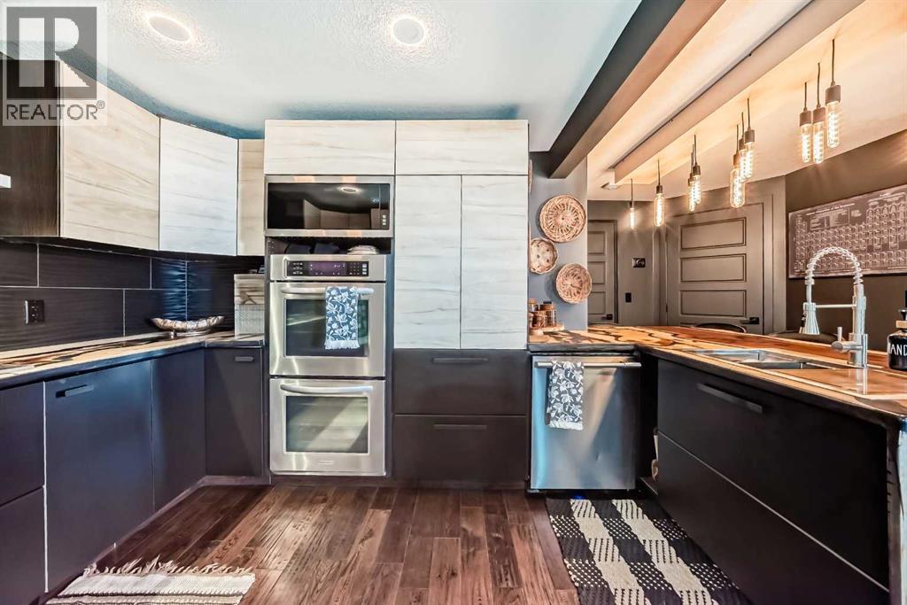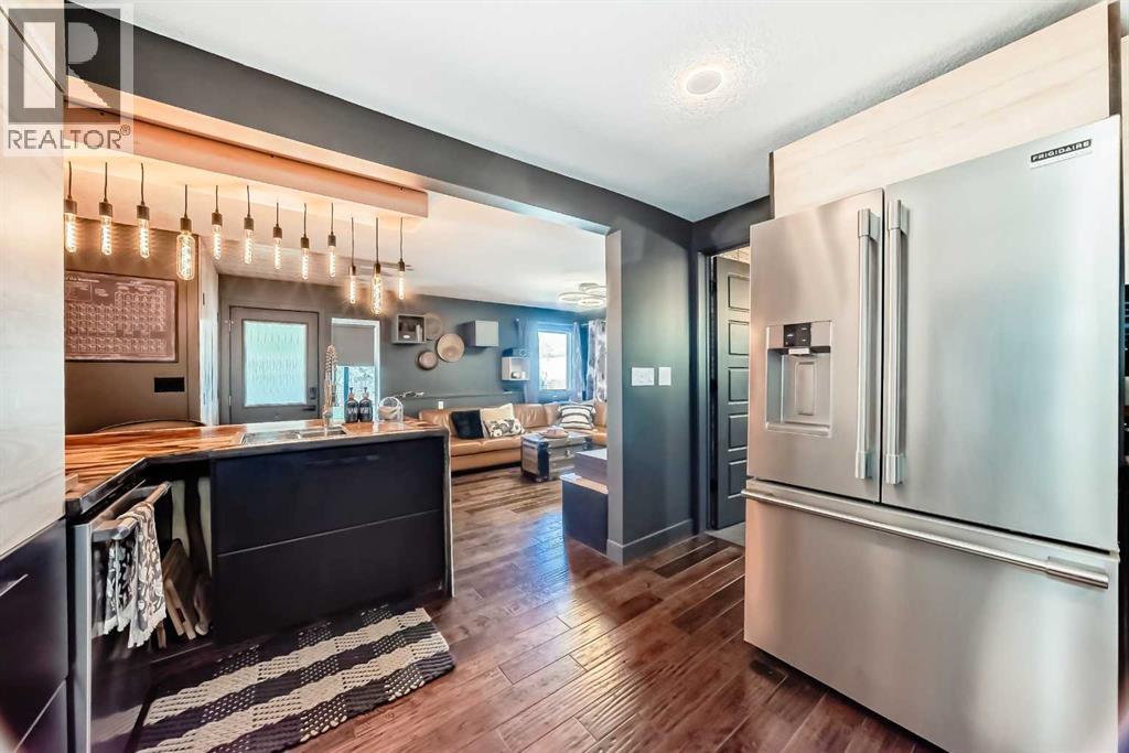 YOU'VE GOT TO SEE THIS FUNKY, AFFORDABLE & COMPLETELY STUNNING HOME ON A HUGE 7500 sf lot! I know it's said all the time, but you truly have to see the transformation. This home showcases a thoughtful blend of modern convenience and stylish design. Enter the home off the spacious deck & be wowed by the hand scraped engineered hardwood throughout the home & slate flooring in the foyer. The coat closet is hidden with a custom maple slat wall feature. The living room is great size, with a projector wall for all those movie nights. The CHEF's kitchen (it truly is) has gorgeous 2-tone cabinetry with tons of storage, pot drawers, pull outs, new stainless-steel appliances (2024), fridge, microwave, dishwasher, hood fan, (2018) gas cooktop with stainless cover, double wall oven and deep sink with touchless faucet. Countertop/eating bar is STUNNING to say the least! One of a kind epoxy & wood creation blending natural artistry with craftmanship with this Acacia slab, accented with white maple & poplar wood sustainably sourced from trees removed in one of Alberta beautiful provincial parks. The primary bedroom is large (can fit a king bed) and has a new two-piece ensuite which is a bonus, wardrobe & built in shelving closet area and electric fireplace to add that warm comfort feeling. The second bedroom is a good size with a door leading to the side deck. The main bath is luxurious with a new oversized tub, toilet, vanity & Italian porcelain flooring, micro cement wall finish & pencil crayon Italian porcelain wall tiles, black fixtures adding that contemporary touch. The laundry room is tucked away with stacked washer/dryer and access to the hot water tank. And still extra storage in there for cleaning supplies etc. To round this beautiful home off is the complete electrical overhaul of new wiring, upgraded electrical panel and mast for peace of mind. The plumbing enhancements PEX waterlines, new ABS plumbing throughout as well as a water filtration system. New high efficie ncy 50-gallon hot water tank (2024). The energy efficiency is extraordinary starting with the spray foam insulation around windows for improved comfort, double drywall & knock down ceiling for extra soundproofing and heat retention in winter & staying cool in the summer. For safety and compliance, smoke detectors and CO2 detectors recently installed and most important of all is that all renovations have been completed to code with permits. Extra insulation and poly barrier has been added along lower foundation for improved energy efficiency. The crawl space has 2 new teleposts & footings with furnace (1958) that works like a charm. Two access panels into crawl space (bedroom & living room) easy access and tons storage down. Oversized HEATED double garage with laneway that gives room for another 4 vehicles or RV parking. And just down street to most serene dog park. Diamond Valley is nestled in the foothills of the Canadian Rockies, minutes to all amenities & 30 minutes to South end of Calgary. (id:53676)