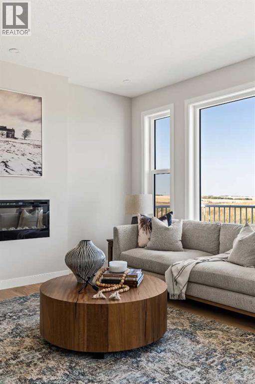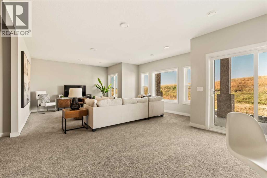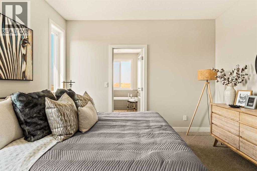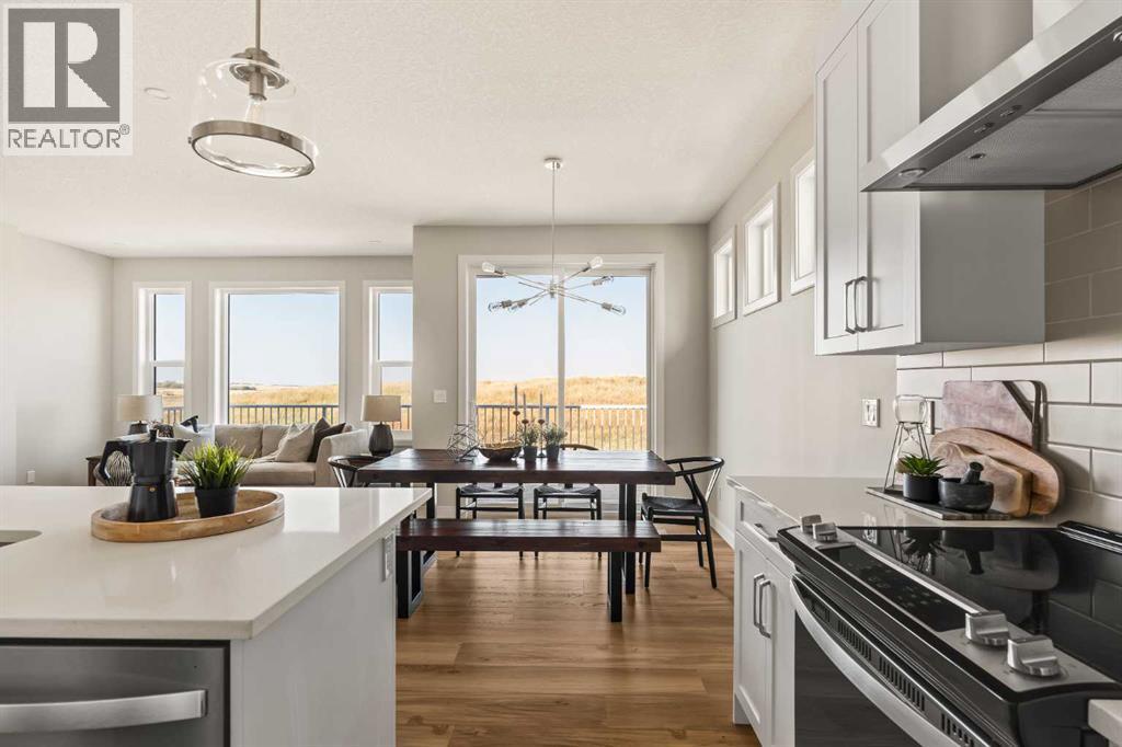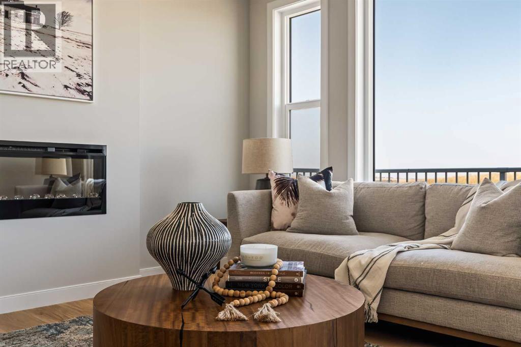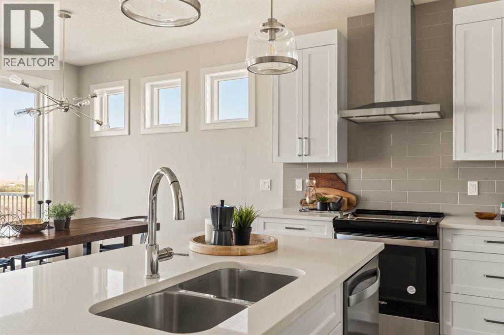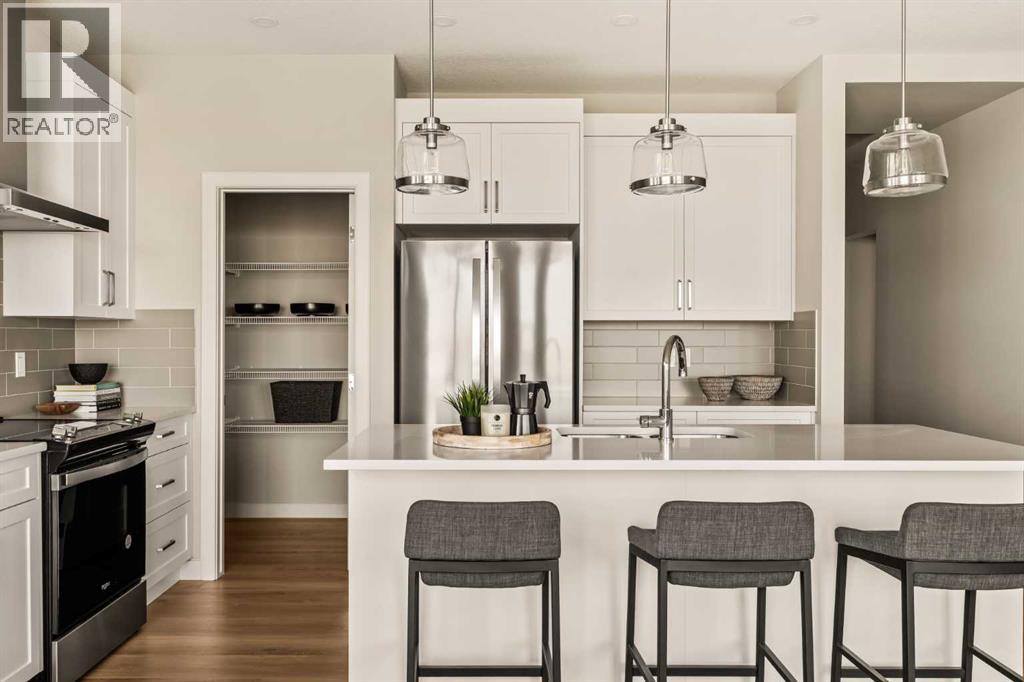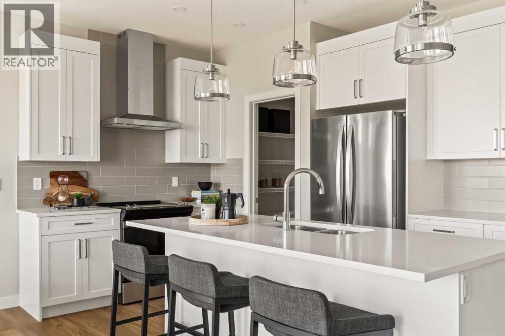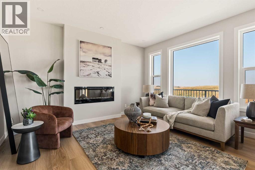 An incredible opportunity awaits in this brand new move-in ready Walkout Bungalow in the heart of Crossfield! Offering 2 living areas, 4 bedrooms, 2.5 bathrooms and nearly 2,200 square feet of developed space over two levels + an oversized double attached garage, this home is perfect for those looking to downsize without compromise or for a family! The bright and open main living area features a central kitchen that overlooks both living and dining spaces - making it the perfect space for entertaining. The expansive kitchen is complete with timeless white shaker cabinets accented by a subway tile backsplash. The light quartz countertops create a clean and seamless look while providing a bright and clean living space. The kitchen is complete with a large 5' deep corner pantry with endless storage, a slide-in range, chimney hood fan and suite of stainless steel appliances. The 9'x10' dining area has ample space for a large dining table and the kitchen island offers additional seating space. The main living area has a central fireplace, perfect for cozy winter nights, and a wall of windows across the back of the home allow natural light to flood the main living space all day long. Patio doors off of the main dining area provide access to the large 23' wide deck, with ample space for a cooking area and lounging space. The large primary suite has windows centering the bedframe with ample space for a king-sized bed and the intelligently designed niche is the perfect space for a wardrobe - providing a comfortable primary suite that can accommodate a full bedroom set. The primary suite is complete with a 5pc en suite including dual undermount sinks with quartz countertop, a soaker tub, walk-in shower and a large walk-in closet. The main level is completed with a full second bedroom, which could be a home office space, and a full bathroom - providing the ideal layout for multi-generational living or the perfect bedroom for a younger child. Laundry is located on the main leve l, providing added convenience to everyday living. The lower level has been professionally developed to mirror the same design aesthetic throughout. With 9' ceilings and a wall of windows on the walkout basement, the expansive ~27'x17' rec room offers ample space for a TV area, games space and home gym if desired! The basement is complete with two more bedrooms, a full bathroom and endless storage! A covered patio on the lower level walkout basement is the perfect space to relax while overlooking your fully private backyard. Ideal for those wanting a lower-maintenance lifestyle and single level-living, this beautiful new home is move-in ready in the charming small town of Crossfield! With the endless amenities of Airdrie and Calgary just minutes away, this property offers a tranquil lifestyle without compromise! This home comes with full Builder Warranty + Alberta New Home Warranty allow you to purchase with peace of mind. (id:53676)