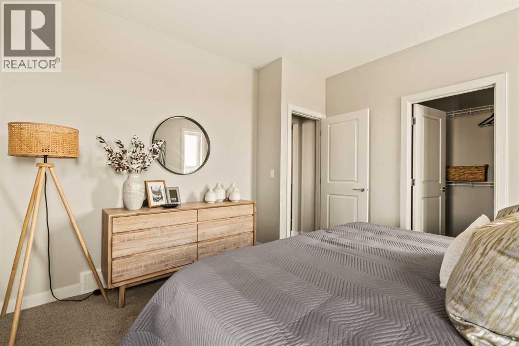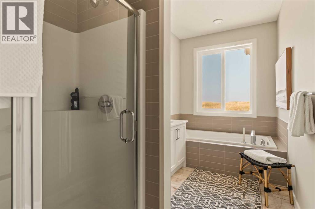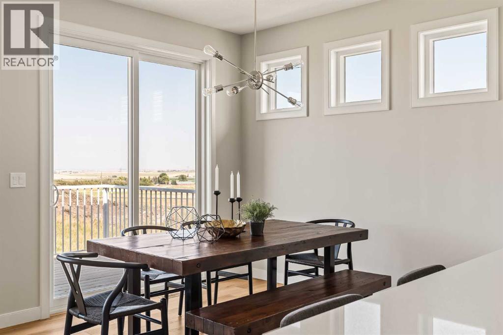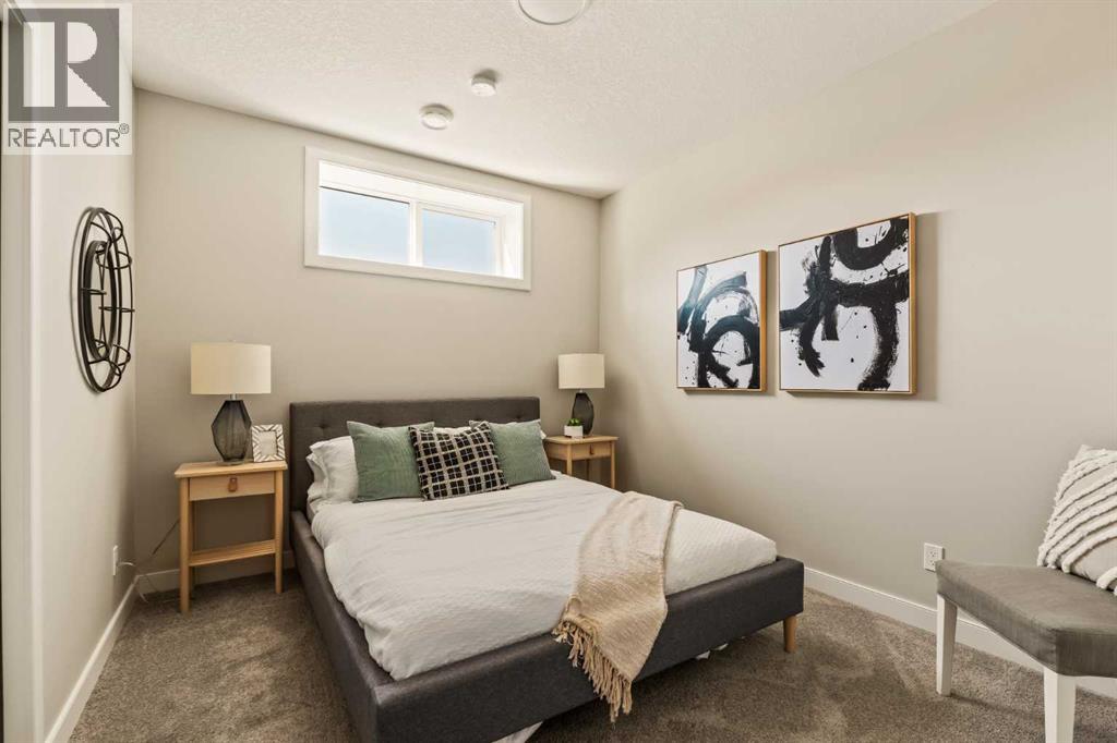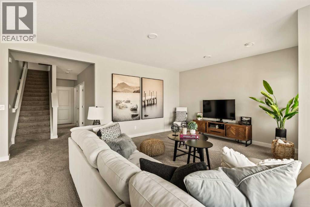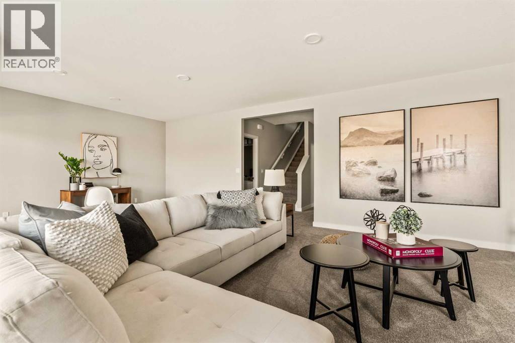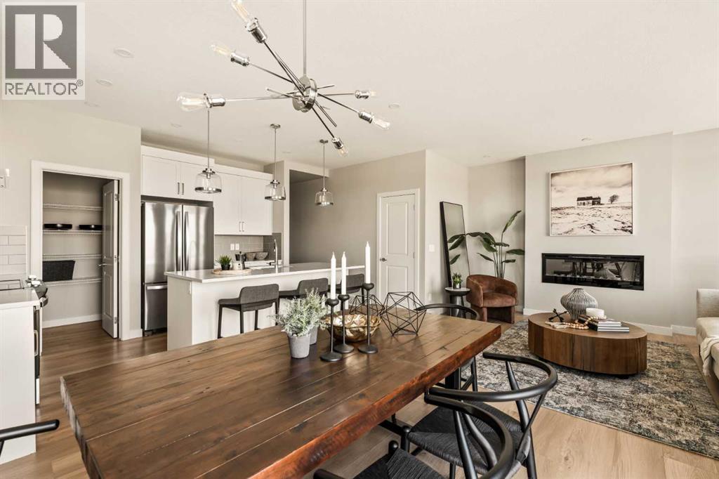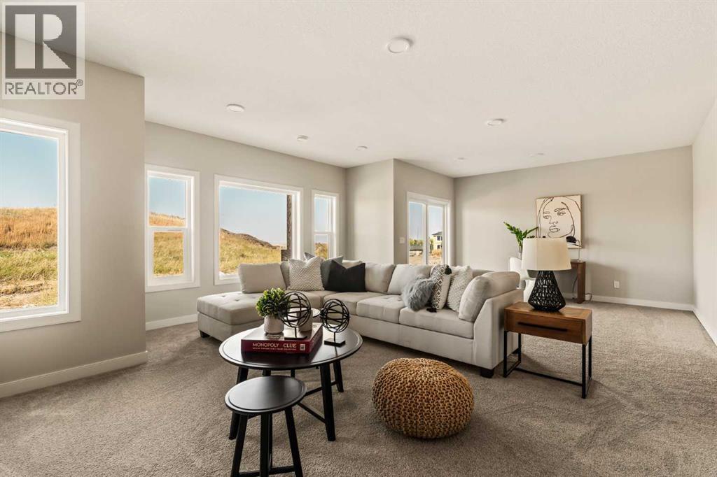 An incredible opportunity awaits in this brand new move-in ready Walkout Bungalow in the heart of Crossfield! Offering 2 living areas, 4 bedrooms, 2.5 bathrooms and nearly 2,200 square feet of developed space over two levels + an oversized double attached garage, this home is perfect for those looking to downsize without compromise or for a family! The bright and open main living area features a central kitchen that overlooks both living and dining spaces - making it the perfect space for entertaining. The expansive kitchen is complete with timeless white shaker cabinets accented by a subway tile backsplash. The light quartz countertops create a clean and seamless look while providing a bright and clean living space. The kitchen is complete with a large 5' deep corner pantry with endless storage, a slide-in range, chimney hood fan and suite of stainless steel appliances. The 9'x10' dining area has ample space for a large dining table and the kitchen island offers additional seating space. The main living area has a central fireplace, perfect for cozy winter nights, and a wall of windows across the back of the home allow natural light to flood the main living space all day long. Patio doors off of the main dining area provide access to the large 23' wide deck, with ample space for a cooking area and lounging space. The large primary suite has windows centering the bedframe with ample space for a king-sized bed and the intelligently designed niche is the perfect space for a wardrobe - providing a comfortable primary suite that can accommodate a full bedroom set. The primary suite is complete with a 5pc en suite including dual undermount sinks with quartz countertop, a soaker tub, walk-in shower and a large walk-in closet. The main level is completed with a full second bedroom, which could be a home office space, and a full bathroom - providing the ideal layout for multi-generational living or the perfect bedroom for a younger child. Laundry is located on the main leve l, providing added convenience to everyday living. The lower level has been professionally developed to mirror the same design aesthetic throughout. With 9' ceilings and a wall of windows on the walkout basement, the expansive ~27'x17' rec room offers ample space for a TV area, games space and home gym if desired! The basement is complete with two more bedrooms, a full bathroom and endless storage! A covered patio on the lower level walkout basement is the perfect space to relax while overlooking your fully private backyard. Ideal for those wanting a lower-maintenance lifestyle and single level-living, this beautiful new home is move-in ready in the charming small town of Crossfield! With the endless amenities of Airdrie and Calgary just minutes away, this property offers a tranquil lifestyle without compromise! This home comes with full Builder Warranty + Alberta New Home Warranty allow you to purchase with peace of mind. (id:53676)