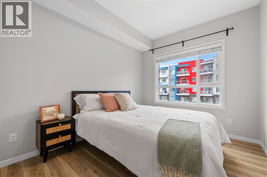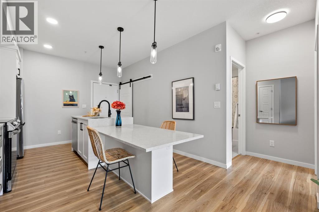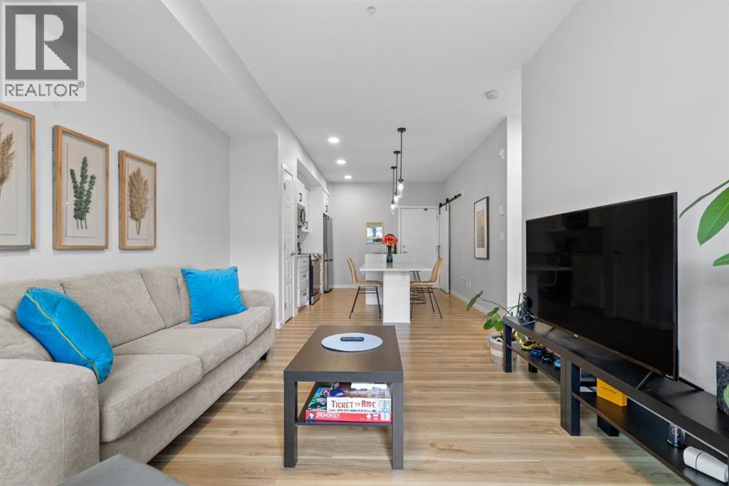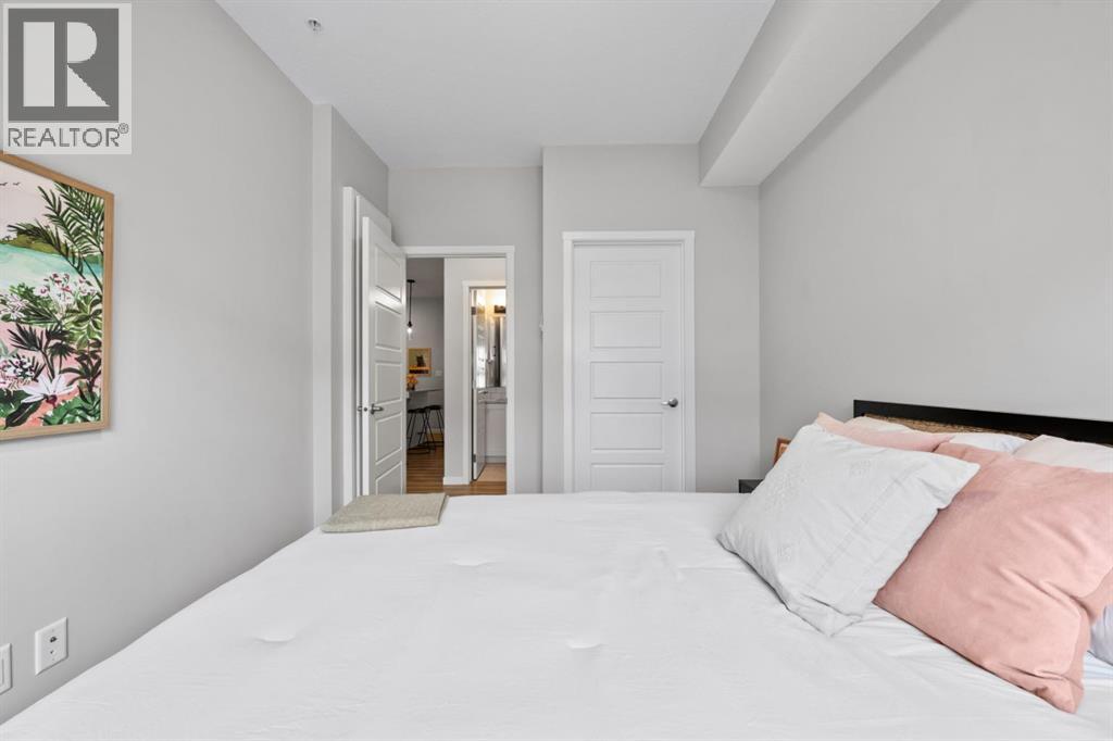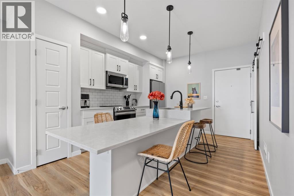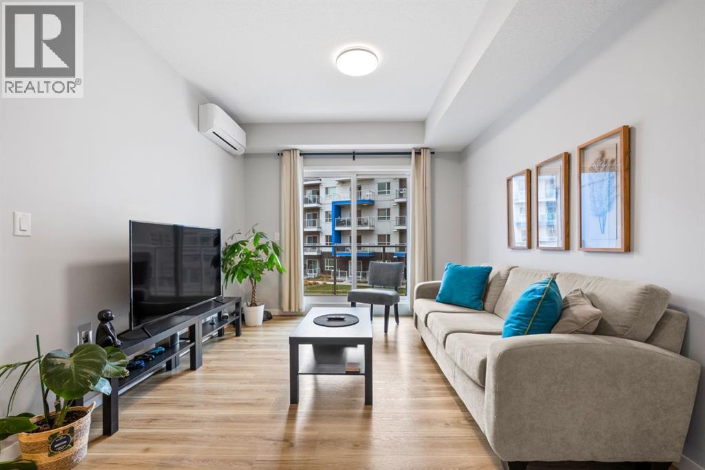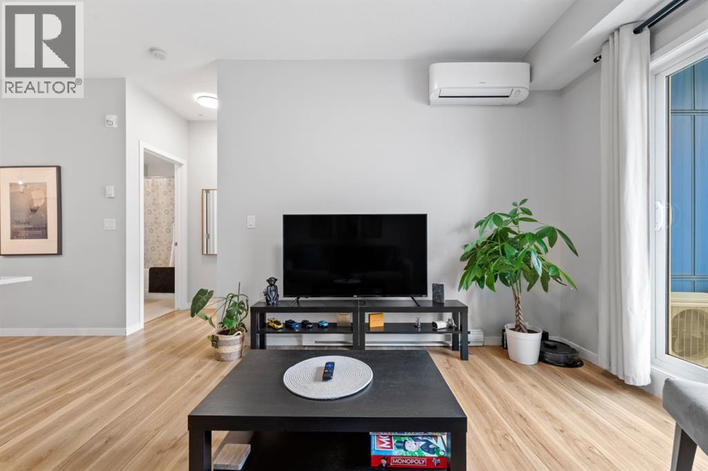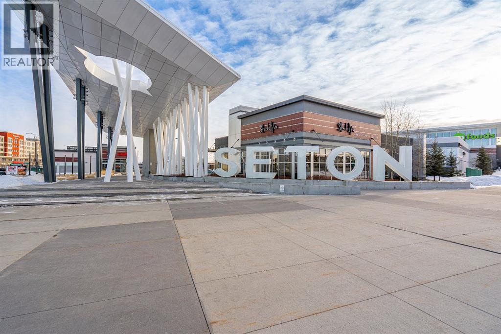Open House Saturday 12-2 pm. Welcome to this wonderful gem of a property. This thoughtfully designed one bedroom home has the space to entertain while still being the ideal retreat from a busy life. Upgraded with central air conditioning and luxury vinyl plank and tile flooring throughout, all the details of this home have been carefully considered. The kitchen features quartz countertops, full height white cabinetry with extra pots and pans drawers, and a separate pantry which really optimizes storage. The kitchen island has been cleverly fitted with both ample counter space and a built-in dining table for 4 as well as a breakfast bar for 2. The generous living room is perfect for both movie nights and lively conversations. Sliding doors lead out to the balcony which overlooks the courtyard, greenspace, and community gardens. The bedroom has enough space for a king-sized bed and the walk-in closet has been fitted with clever single and double hanging space, drawers, and shelving eliminating the need for a dresser. The full bath also has quartz countertops and is complete with a soaker tub and shower combo. All of your storage needs will be met as this unit has a large laundry room with additional cabinetry and shelving, plus a separate storage locker which has been leased for 70 years. Finally, this unit comes with a titled, heated, underground parking stall which is mere steps away from the elevator. This location is Seton is very walkable with Red’s Diner, Leopold’s Tavern, Community Natural Foods, the YMCA, and the South Health Campus only a block or 2 away. There are also plenty of restaurants, shops, additional supermarkets, and a movie theatre within easy walking distance. (id:53676)
