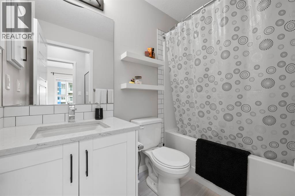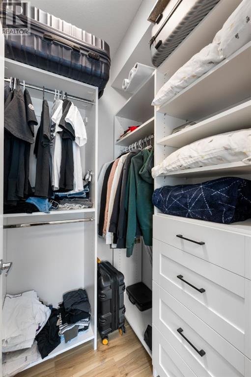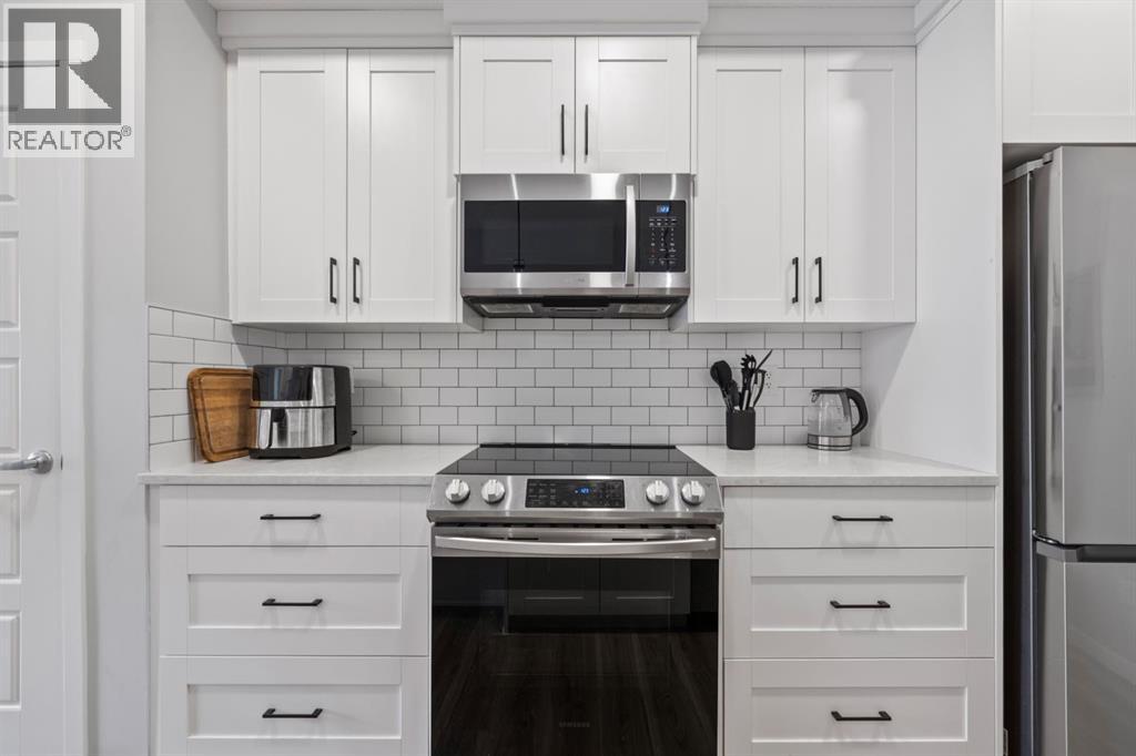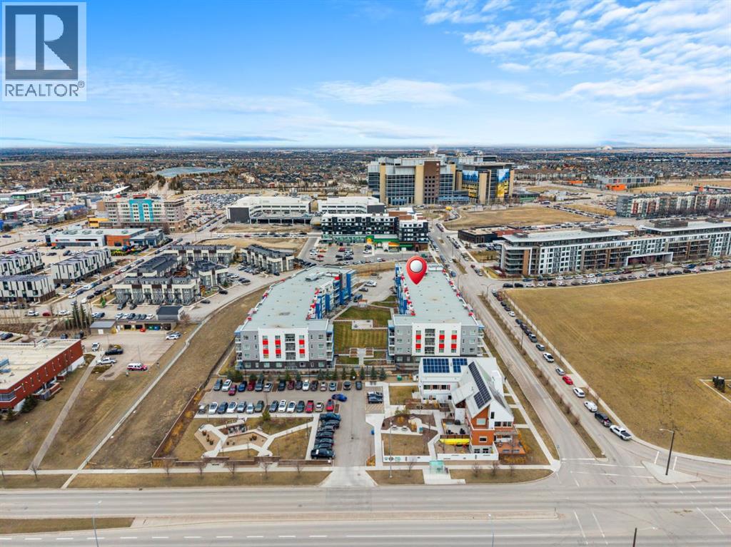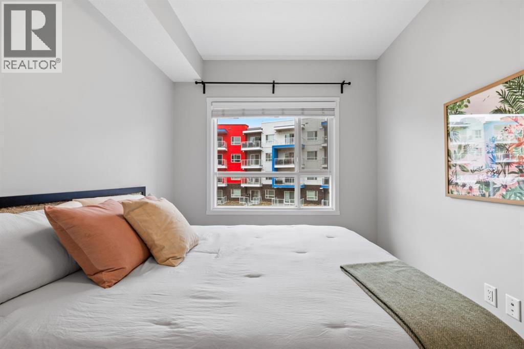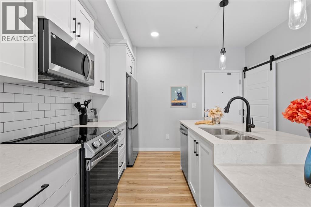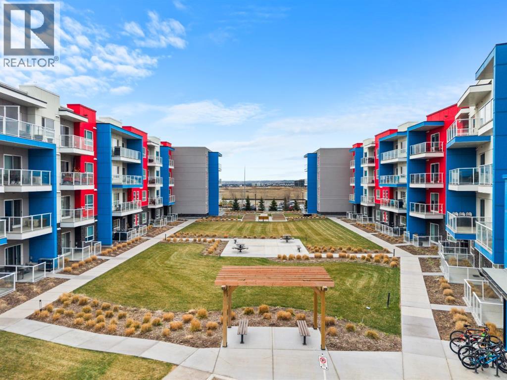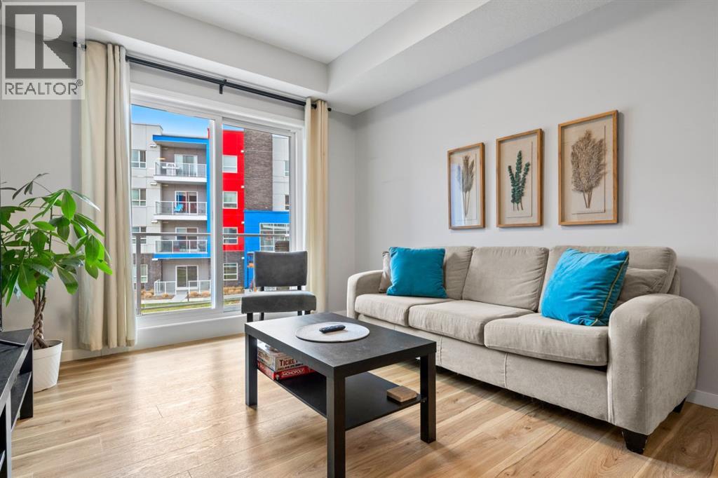 Open House Saturday 12-2 pm. Welcome to this wonderful gem of a property. This thoughtfully designed one bedroom home has the space to entertain while still being the ideal retreat from a busy life. Upgraded with central air conditioning and luxury vinyl plank and tile flooring throughout, all the details of this home have been carefully considered. The kitchen features quartz countertops, full height white cabinetry with extra pots and pans drawers, and a separate pantry which really optimizes storage. The kitchen island has been cleverly fitted with both ample counter space and a built-in dining table for 4 as well as a breakfast bar for 2. The generous living room is perfect for both movie nights and lively conversations. Sliding doors lead out to the balcony which overlooks the courtyard, greenspace, and community gardens. The bedroom has enough space for a king-sized bed and the walk-in closet has been fitted with clever single and double hanging space, drawers, and shelving eliminating the need for a dresser. The full bath also has quartz countertops and is complete with a soaker tub and shower combo. All of your storage needs will be met as this unit has a large laundry room with additional cabinetry and shelving, plus a separate storage locker which has been leased for 70 years. Finally, this unit comes with a titled, heated, underground parking stall which is mere steps away from the elevator. This location is Seton is very walkable with Red’s Diner, Leopold’s Tavern, Community Natural Foods, the YMCA, and the South Health Campus only a block or 2 away. There are also plenty of restaurants, shops, additional supermarkets, and a movie theatre within easy walking distance. (id:53676)