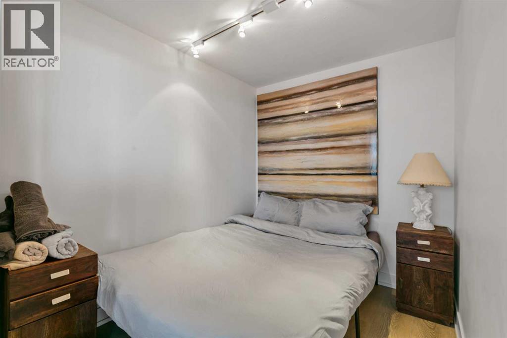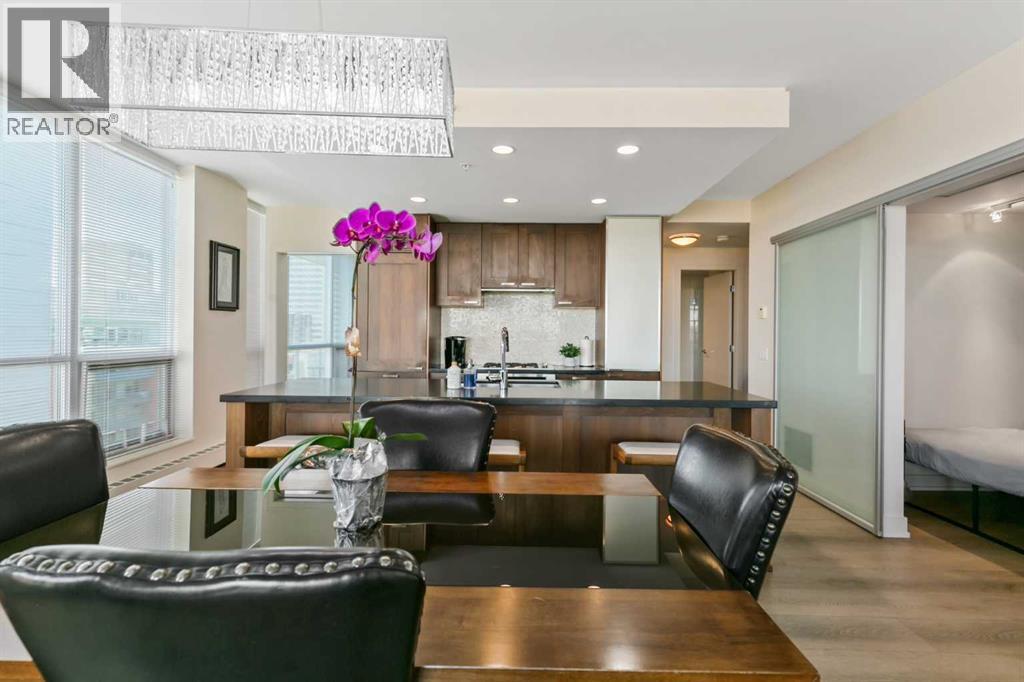 Welcome to a large 2 bedroom + den apartment in the heart of Eau Claire market. This upscale high rise unit overlooks the Bow River with views to the North and East. Upon entering the unit the spacious laundry room awaits with ample storage. The kitchen is upper end with a sub zero fridge, gas stove, and SS dishwasher + microwave. Dark quartz counter tops along with darker wood cabinets. The living room has a gas fireplace, is larger in layout and has access to a huge patio. The patio is large for the building and has beautiful views of the downtown and specifically the Bow River. The master bedroom is large with dual cabinets along with a 5 piece ensuite. 2 sinks with quartz countertops plus a walk in shower. There is also a 2nd bedroom and a den that easily can be used as a bedroom. A 2nd 4 piece bathroom with quartz countertops, a tub/shower set up and consistent cabinets. The unit comes with 2 underground parking spots that are side by side and steps from the elevator. The complex has numerous amenities which include a main floor party room which can be reserved for party's. In addition, there is a fitness centre, steam room, and the building has 24hr concierge service. This unit also has its own storage locker which is located on the 5th floor of building A. The complex is steps to the river, bike paths, and the new and developing Eau Claire market with its own Green line stop. Rarely do units this well laid out ever come to market. (id:53676)