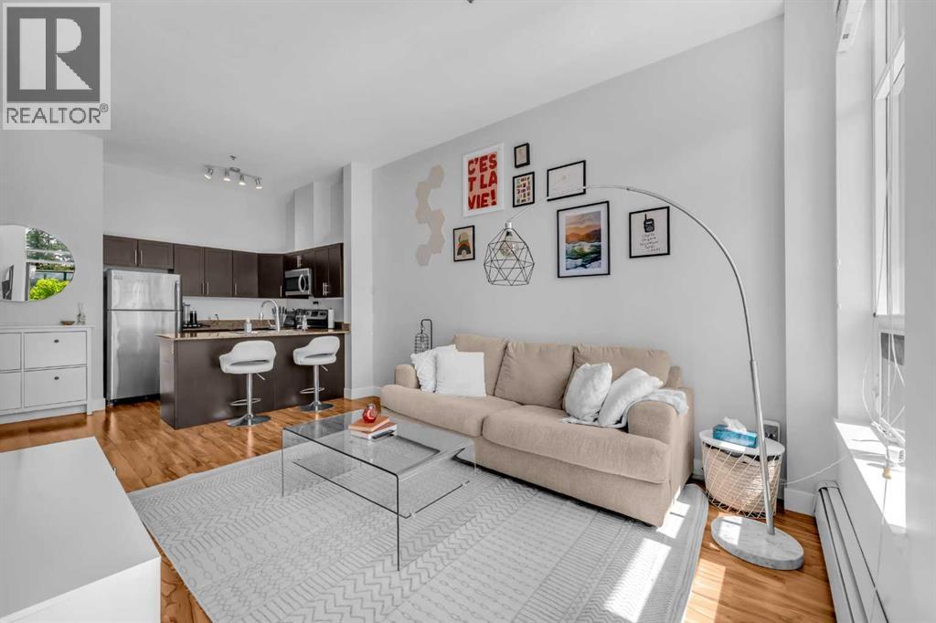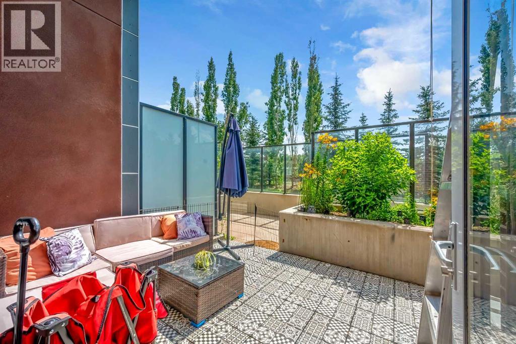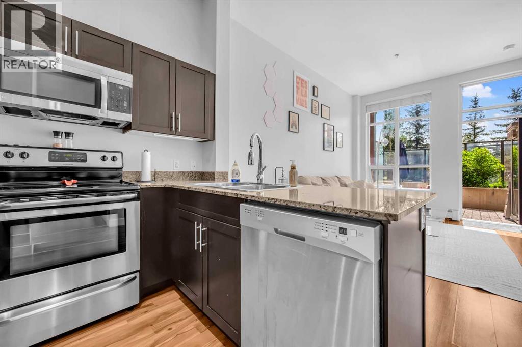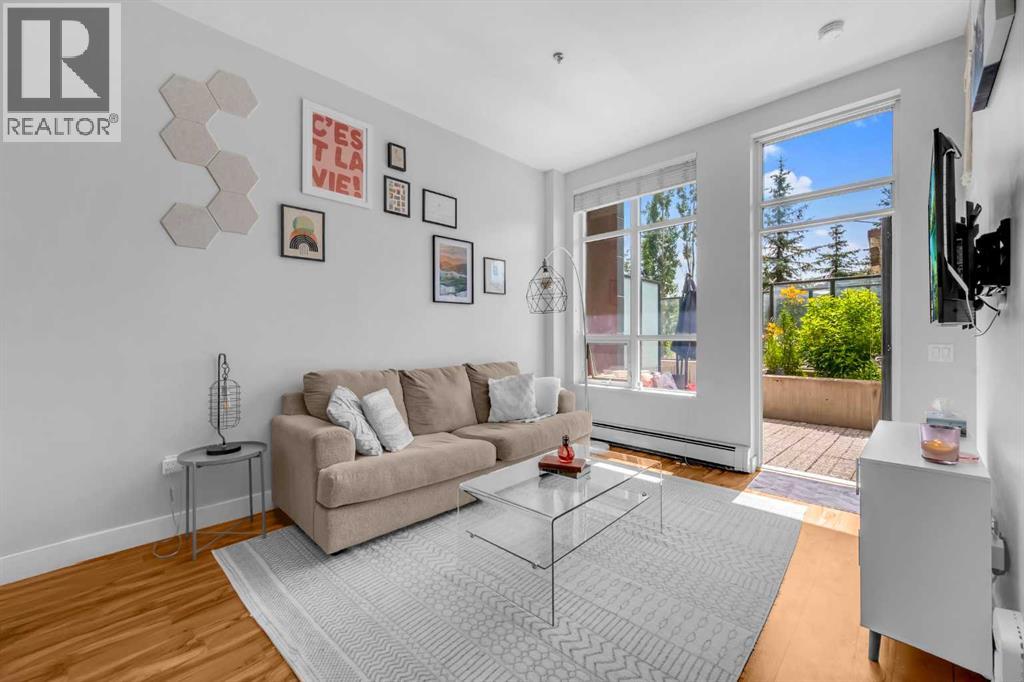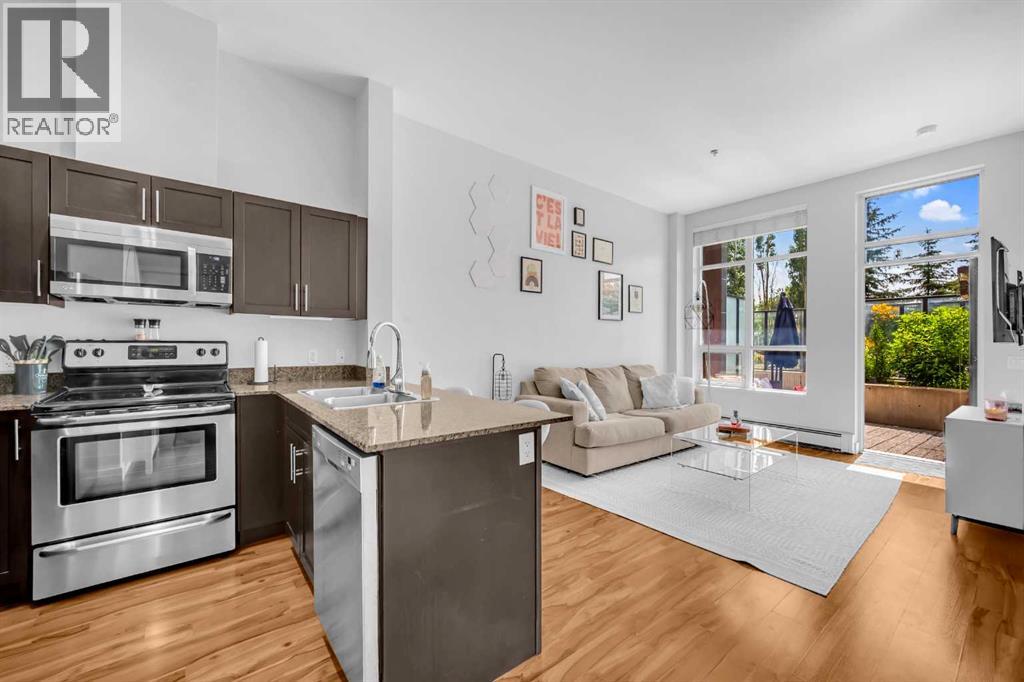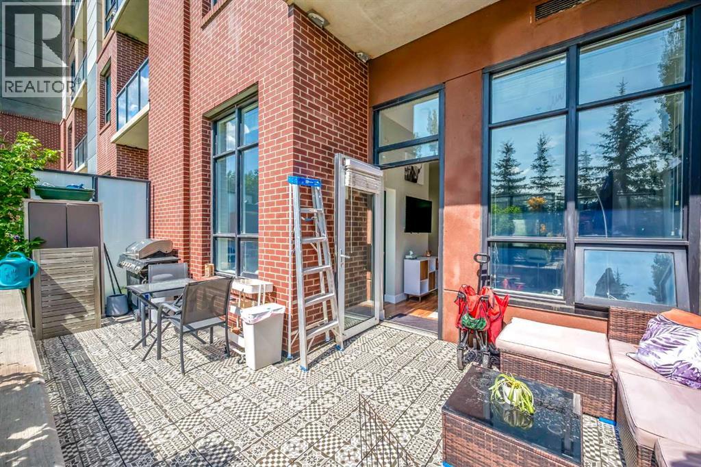 Exceptional south-facing ground-level 1-bedroom residence in the heart of Bridgeland, boasting a sprawling walkout patio that opens directly onto serene common green space, one of only eight exclusive units in the building. Soaring 10’ ceilings enhance the sense of space and light, while the gourmet kitchen showcases granite countertops, premium appliances, and thoughtful upgrades including a custom closet insert (2021), a built-in office area (2021), a new dishwasher (2022), na ew microwave (2025), and new washer and dryer (2025). Recent enhancements, such as freshly painted bathroom and doorframes (2025), add a crisp, modern touch. The bedroom features a walk-through closet to a stylish 4-piece bath, and the private garden with planters offers a tranquil retreat with downtown views. Residents enjoy access to a fenced dog area, secure heated bicycle storage, and a coveted street parking pass with a designated space right out front. Perfectly positioned just steps to the Bridgeland C-Train Station, the Bow River pathways, and the vibrant Bridgeland-Riverside district brimming with artisan cafés, acclaimed eateries, boutiques, parks, and sports fields, plus a stroll to downtown, the Zoo, and Telus Spark, this remarkable property offers a rare fusion of luxury, lifestyle, and location at an exceptional value. (id:53676)
