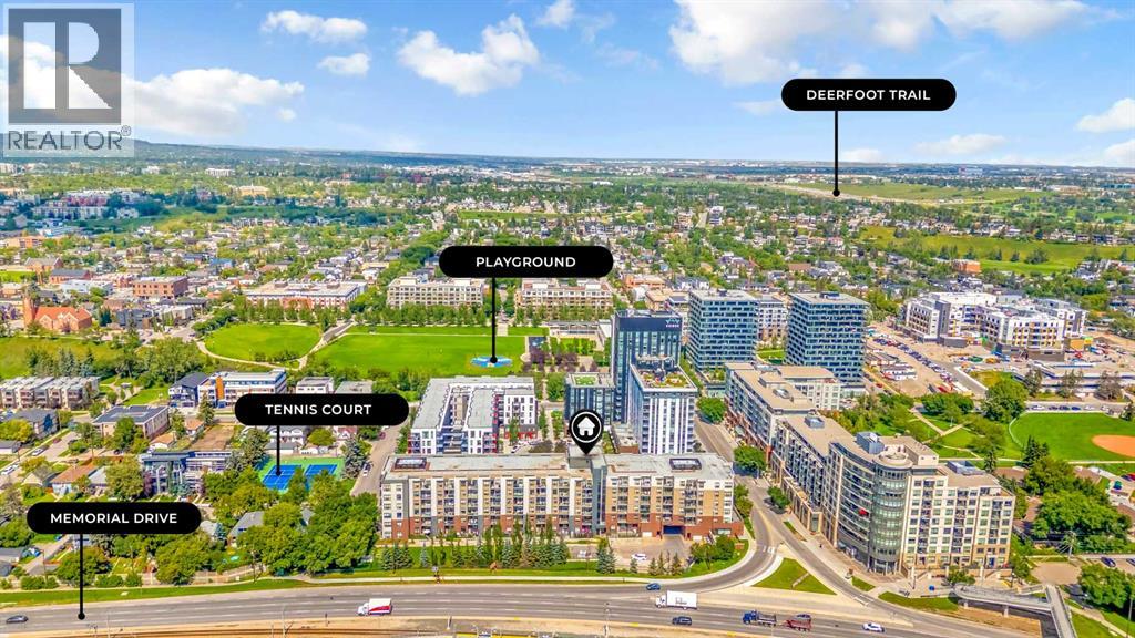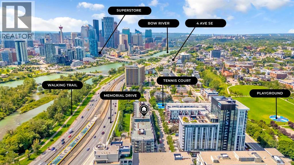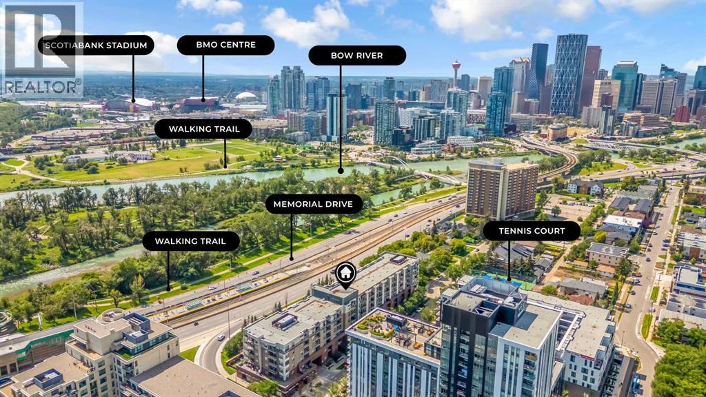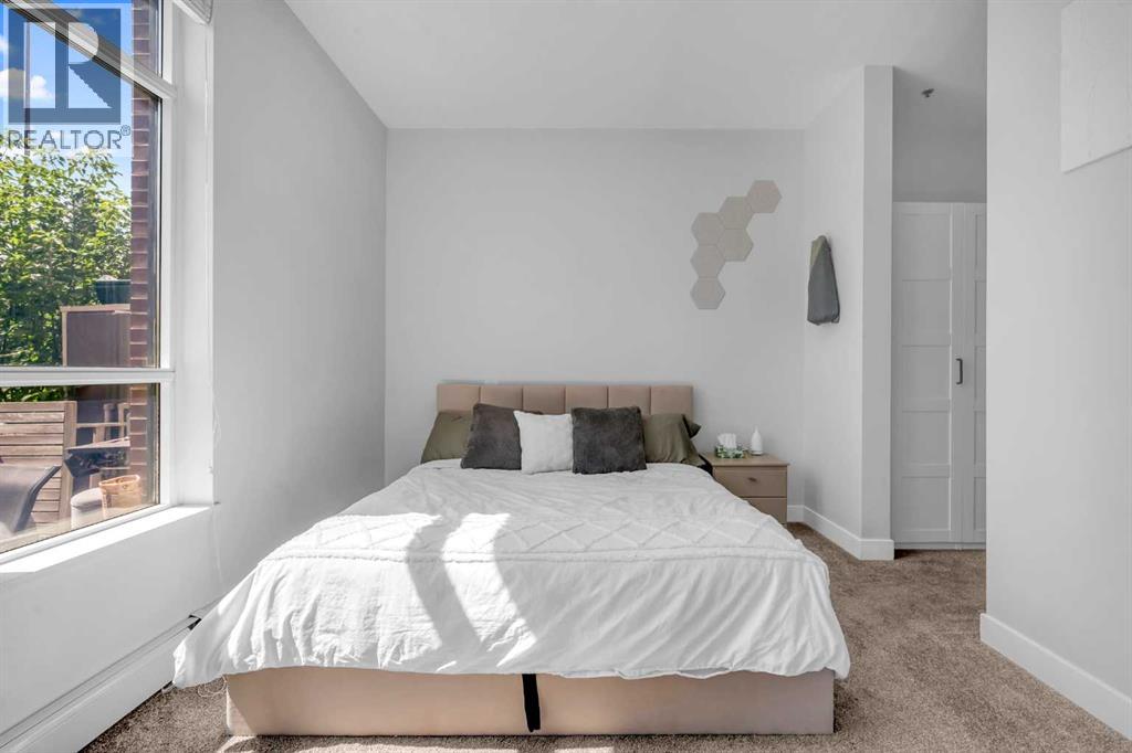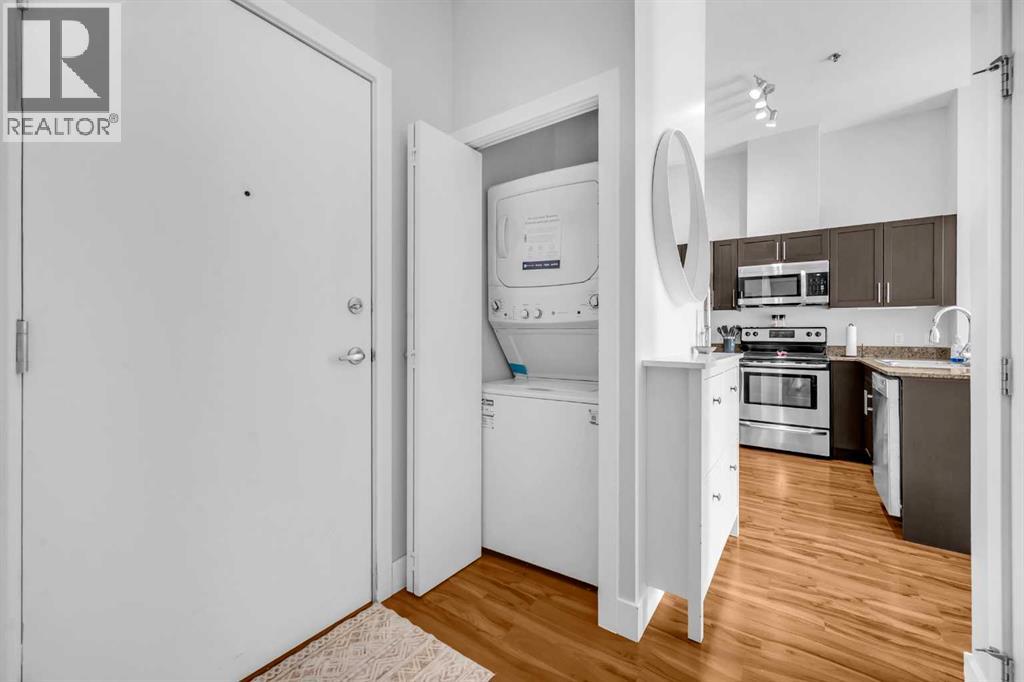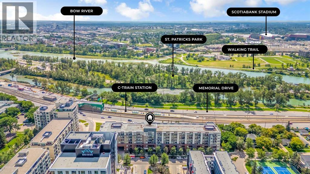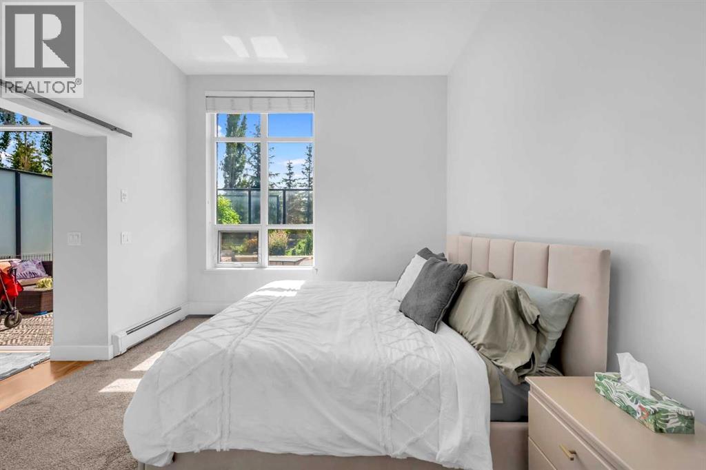 Exceptional south-facing ground-level 1-bedroom residence in the heart of Bridgeland, boasting a sprawling walkout patio that opens directly onto serene common green space, one of only eight exclusive units in the building. Soaring 10’ ceilings enhance the sense of space and light, while the gourmet kitchen showcases granite countertops, premium appliances, and thoughtful upgrades including a custom closet insert (2021), a built-in office area (2021), a new dishwasher (2022), na ew microwave (2025), and new washer and dryer (2025). Recent enhancements, such as freshly painted bathroom and doorframes (2025), add a crisp, modern touch. The bedroom features a walk-through closet to a stylish 4-piece bath, and the private garden with planters offers a tranquil retreat with downtown views. Residents enjoy access to a fenced dog area, secure heated bicycle storage, and a coveted street parking pass with a designated space right out front. Perfectly positioned just steps to the Bridgeland C-Train Station, the Bow River pathways, and the vibrant Bridgeland-Riverside district brimming with artisan cafés, acclaimed eateries, boutiques, parks, and sports fields, plus a stroll to downtown, the Zoo, and Telus Spark, this remarkable property offers a rare fusion of luxury, lifestyle, and location at an exceptional value. (id:53676)