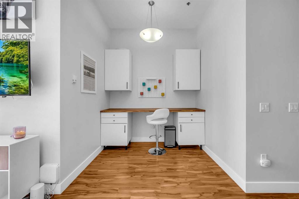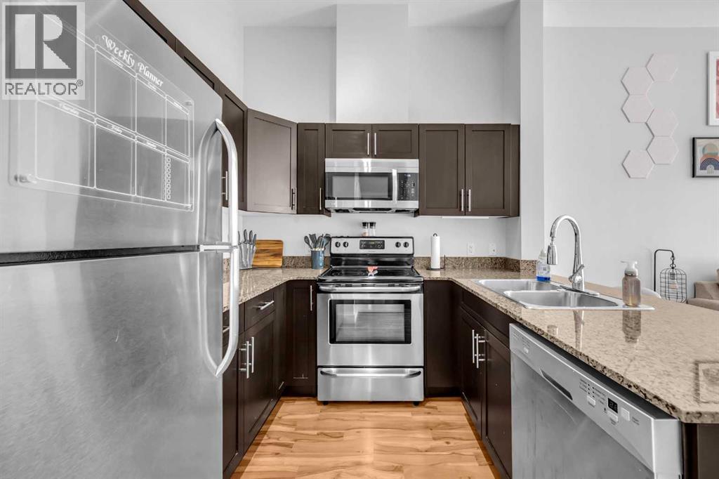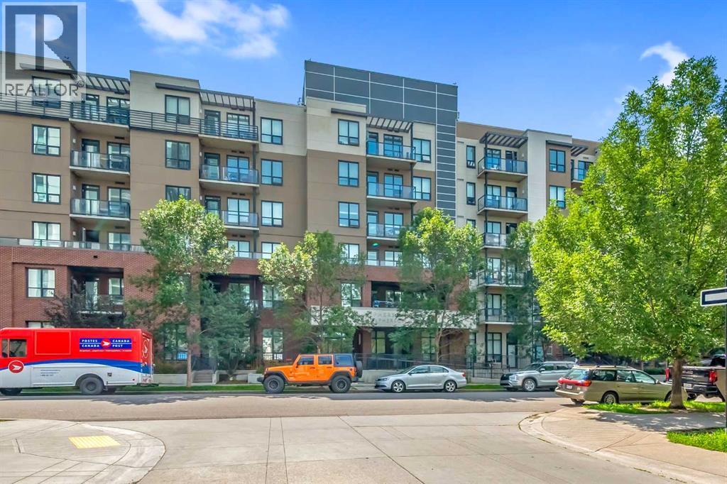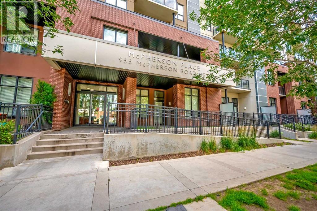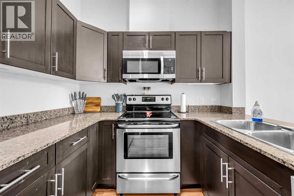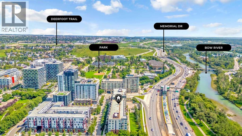 Exceptional south-facing ground-level 1-bedroom residence in the heart of Bridgeland, boasting a sprawling walkout patio that opens directly onto serene common green space, one of only eight exclusive units in the building. Soaring 10’ ceilings enhance the sense of space and light, while the gourmet kitchen showcases granite countertops, premium appliances, and thoughtful upgrades including a custom closet insert (2021), a built-in office area (2021), a new dishwasher (2022), na ew microwave (2025), and new washer and dryer (2025). Recent enhancements, such as freshly painted bathroom and doorframes (2025), add a crisp, modern touch. The bedroom features a walk-through closet to a stylish 4-piece bath, and the private garden with planters offers a tranquil retreat with downtown views. Residents enjoy access to a fenced dog area, secure heated bicycle storage, and a coveted street parking pass with a designated space right out front. Perfectly positioned just steps to the Bridgeland C-Train Station, the Bow River pathways, and the vibrant Bridgeland-Riverside district brimming with artisan cafés, acclaimed eateries, boutiques, parks, and sports fields, plus a stroll to downtown, the Zoo, and Telus Spark, this remarkable property offers a rare fusion of luxury, lifestyle, and location at an exceptional value. (id:53676)