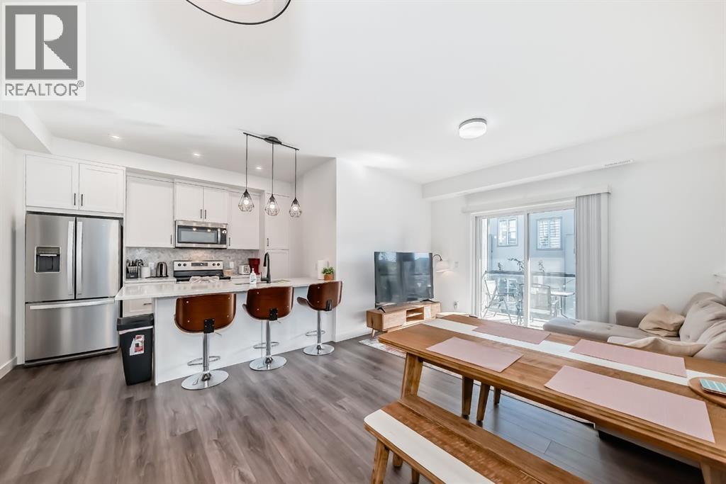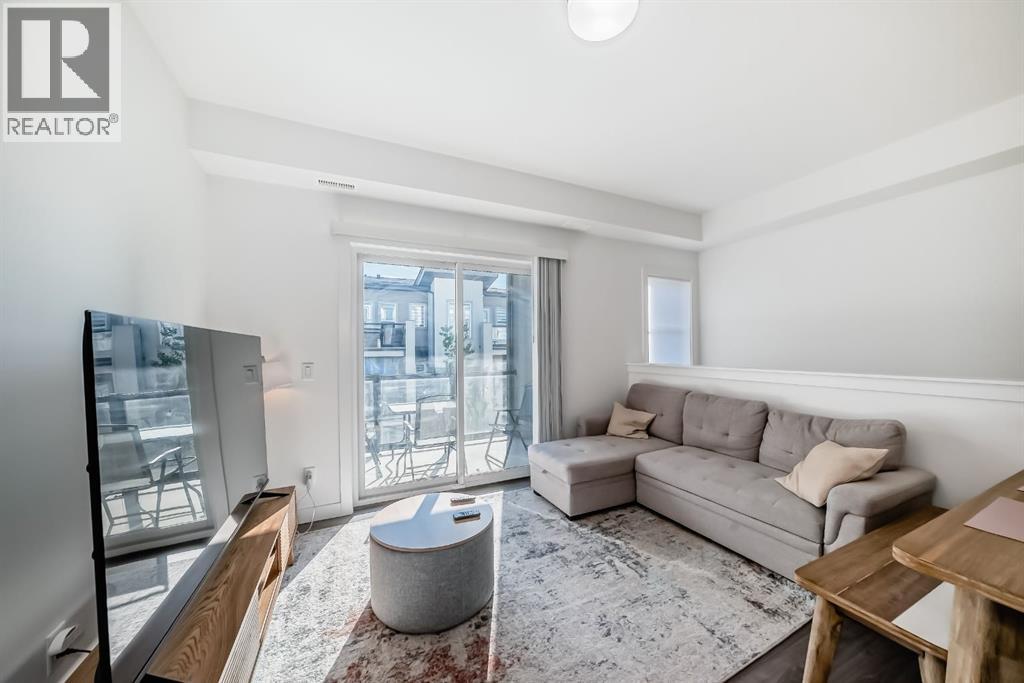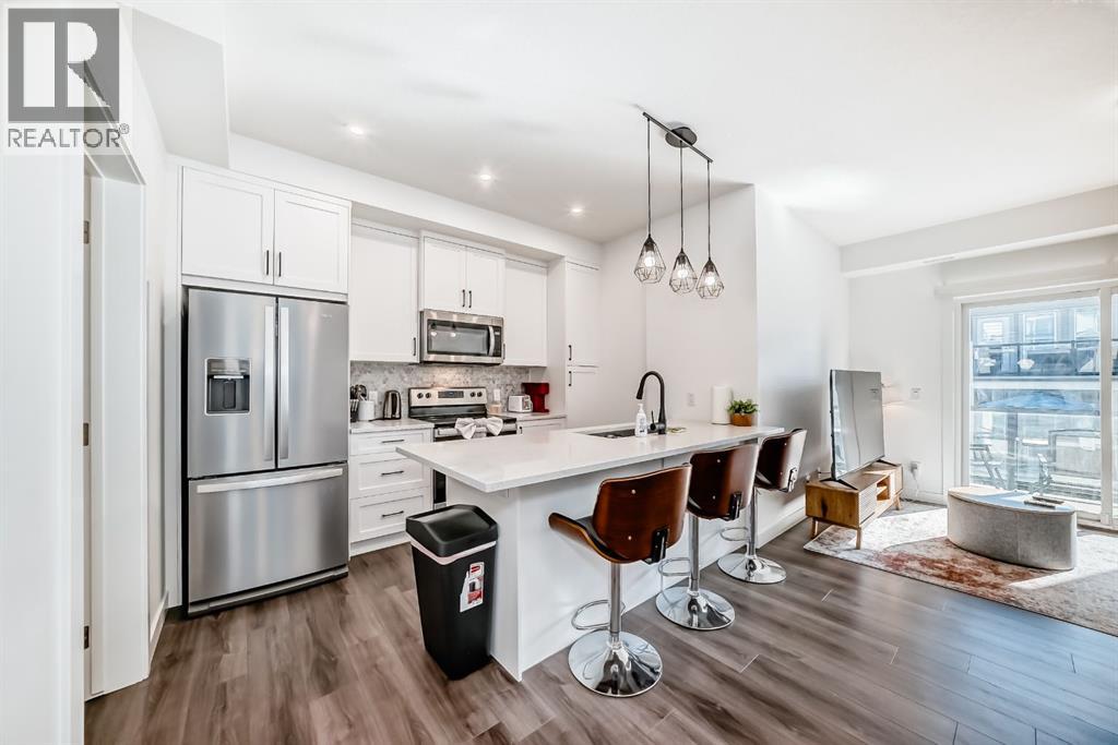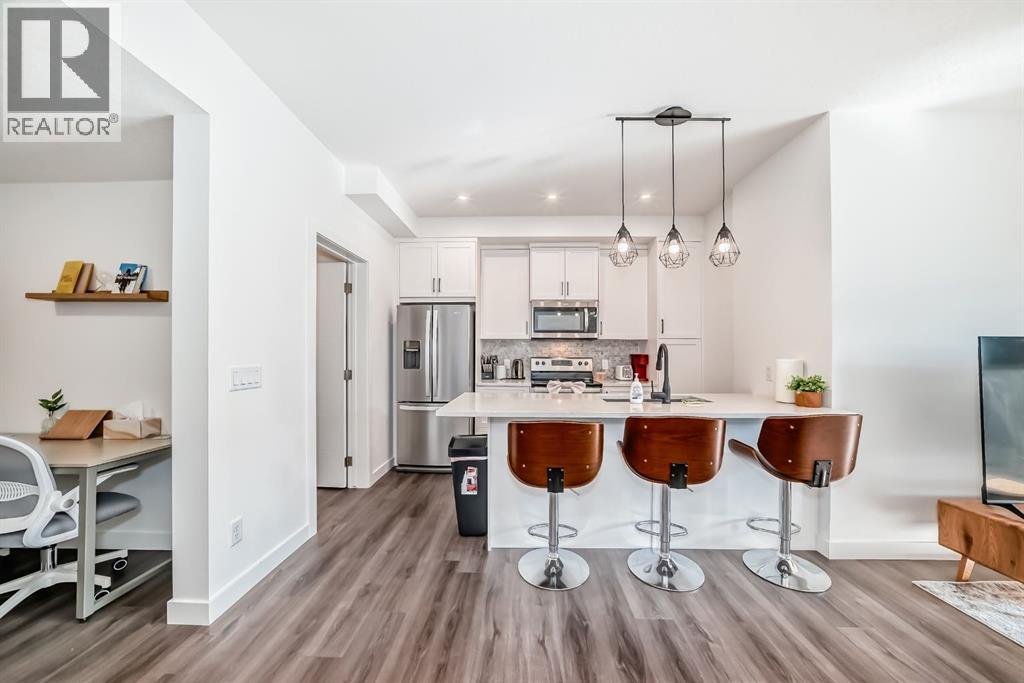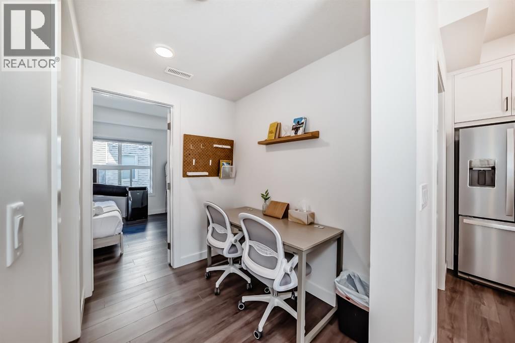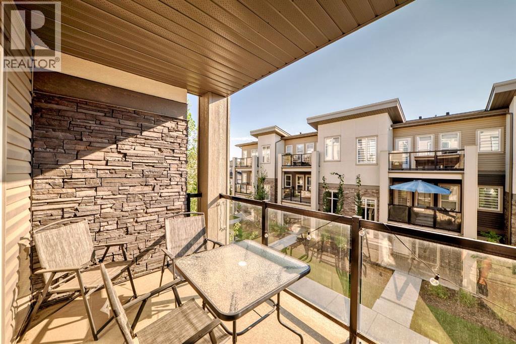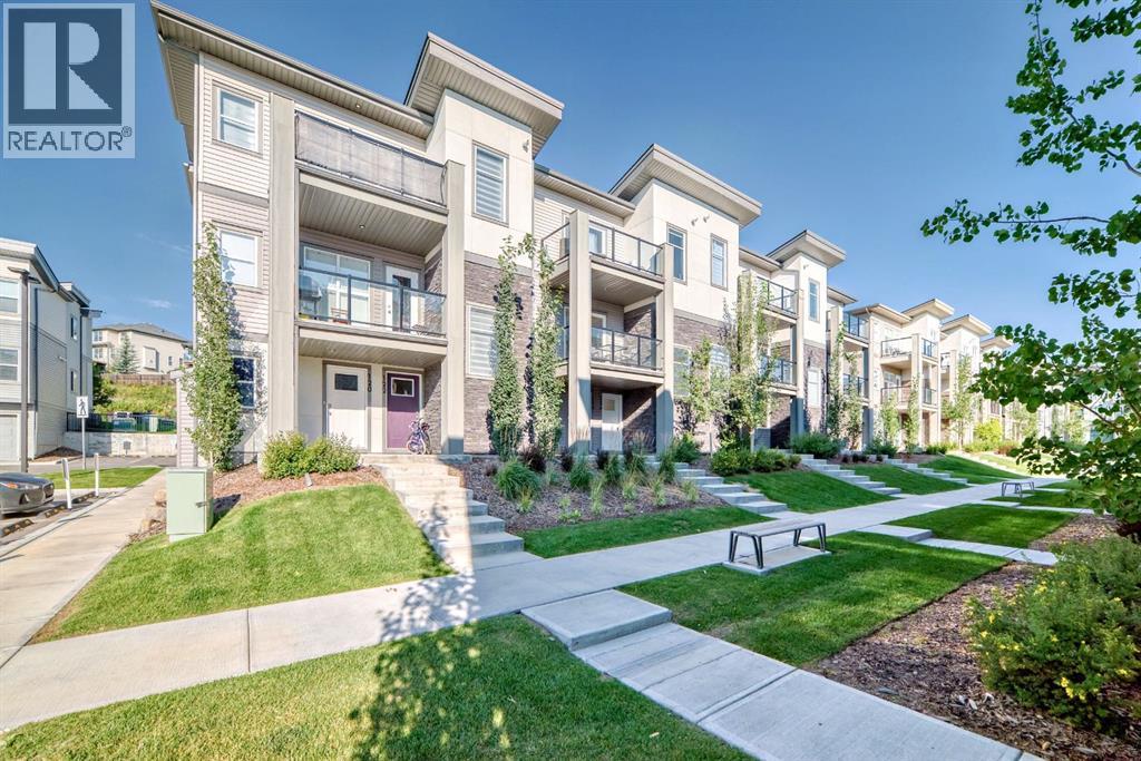 Welcome to functional urban living! This unique STACKED TOWNHOUSE WITH ONE BEDROOM + DEN AND SINGLE CAR GARAGE in the much sought after community of Springbank is exactly what you have been looking for. Walking in from the from entrance you are greeted with a spacious front patio. Entering the unit you are ushered into the Den and Mud room area. The single attached garage is accessed from this level. There's a coat closet and the mechanical/utility room on this level. Walk up a few steps and you are in a spacious living room area that flows into the dining and kitchen with pantry at the top of the stairs as you come up. Upgraded finishings include quartz countertops and kitchen backsplash, upgraded shaker cabinets and handles, sink, lighting fixtures, door handles and Refrigerator. Laundry room is tucked away by the kitchen. Going into the Primary bedroom there's a computer area/workspace to the right and a spacious 4pc ensuite bath to the left. The primary bedroom boasts of space and ample-size closet all along the room wall. From the living room you walk out to a big balcony with privacy walls and a beautiful view of the area. Vinyl plank is the flooring all through the unit except for the stairs. This unit is located in a complex across the street from ASPEN LANDING. Easy access to 85th St SW and 17 Ave SW, transit systems and established amenities in the area. You can't afford to miss this one! Call for your private viewing. (id:53676)