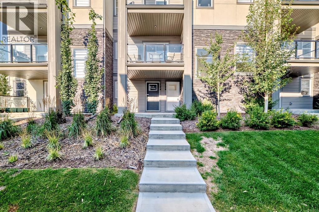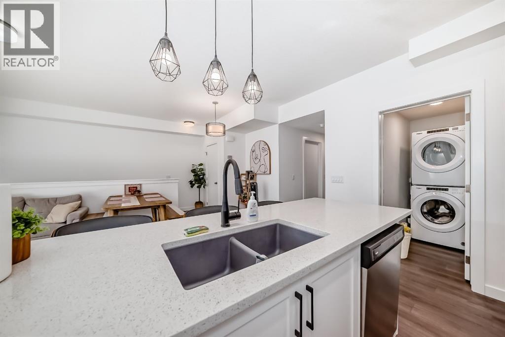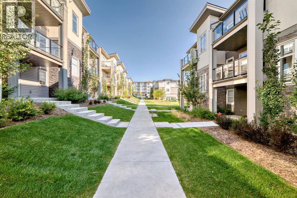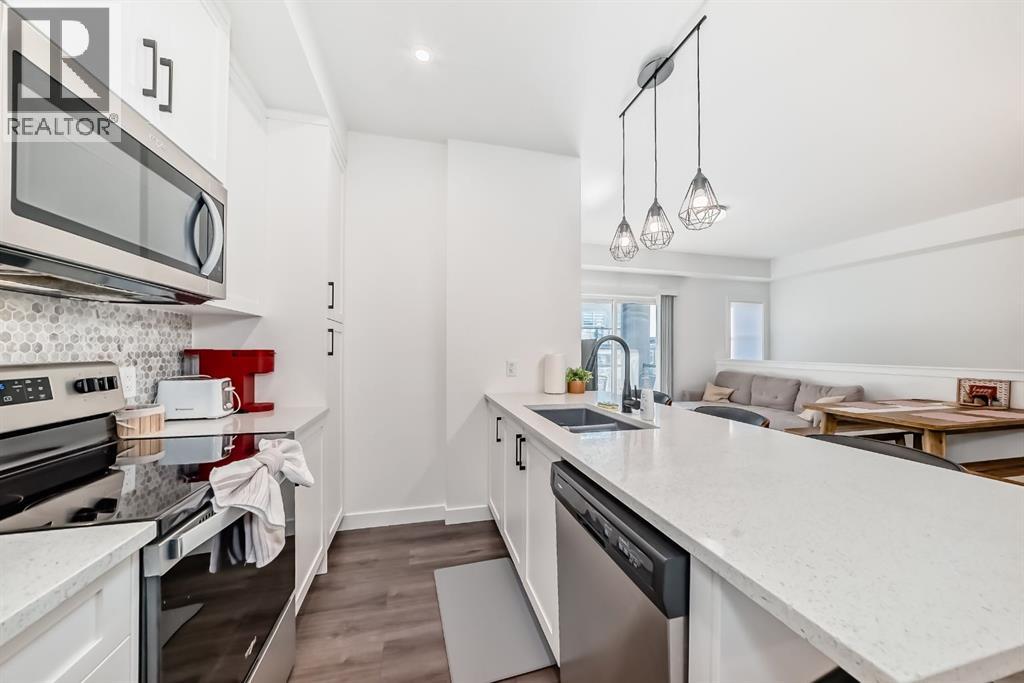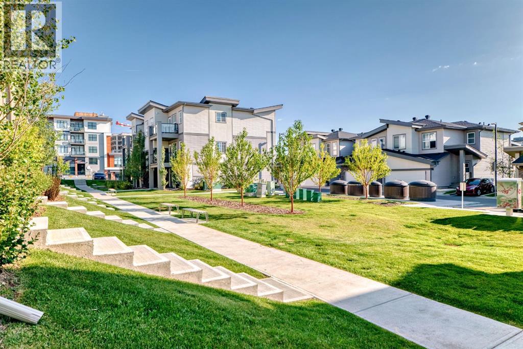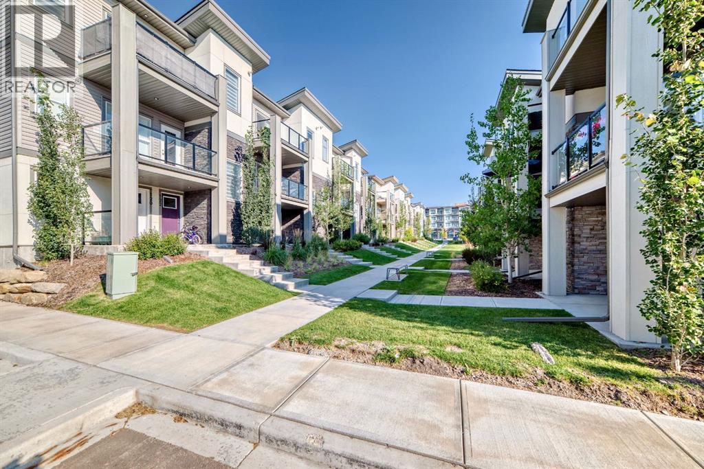 Welcome to functional urban living! This unique STACKED TOWNHOUSE WITH ONE BEDROOM + DEN AND SINGLE CAR GARAGE in the much sought after community of Springbank is exactly what you have been looking for. Walking in from the from entrance you are greeted with a spacious front patio. Entering the unit you are ushered into the Den and Mud room area. The single attached garage is accessed from this level. There's a coat closet and the mechanical/utility room on this level. Walk up a few steps and you are in a spacious living room area that flows into the dining and kitchen with pantry at the top of the stairs as you come up. Upgraded finishings include quartz countertops and kitchen backsplash, upgraded shaker cabinets and handles, sink, lighting fixtures, door handles and Refrigerator. Laundry room is tucked away by the kitchen. Going into the Primary bedroom there's a computer area/workspace to the right and a spacious 4pc ensuite bath to the left. The primary bedroom boasts of space and ample-size closet all along the room wall. From the living room you walk out to a big balcony with privacy walls and a beautiful view of the area. Vinyl plank is the flooring all through the unit except for the stairs. This unit is located in a complex across the street from ASPEN LANDING. Easy access to 85th St SW and 17 Ave SW, transit systems and established amenities in the area. You can't afford to miss this one! Call for your private viewing. (id:53676)