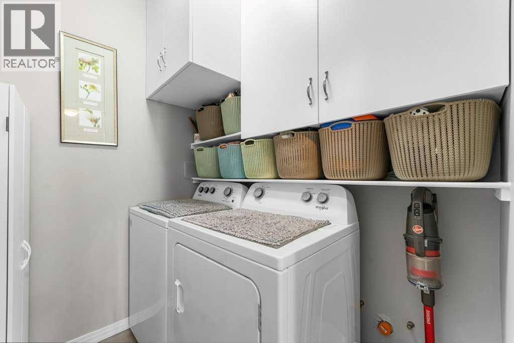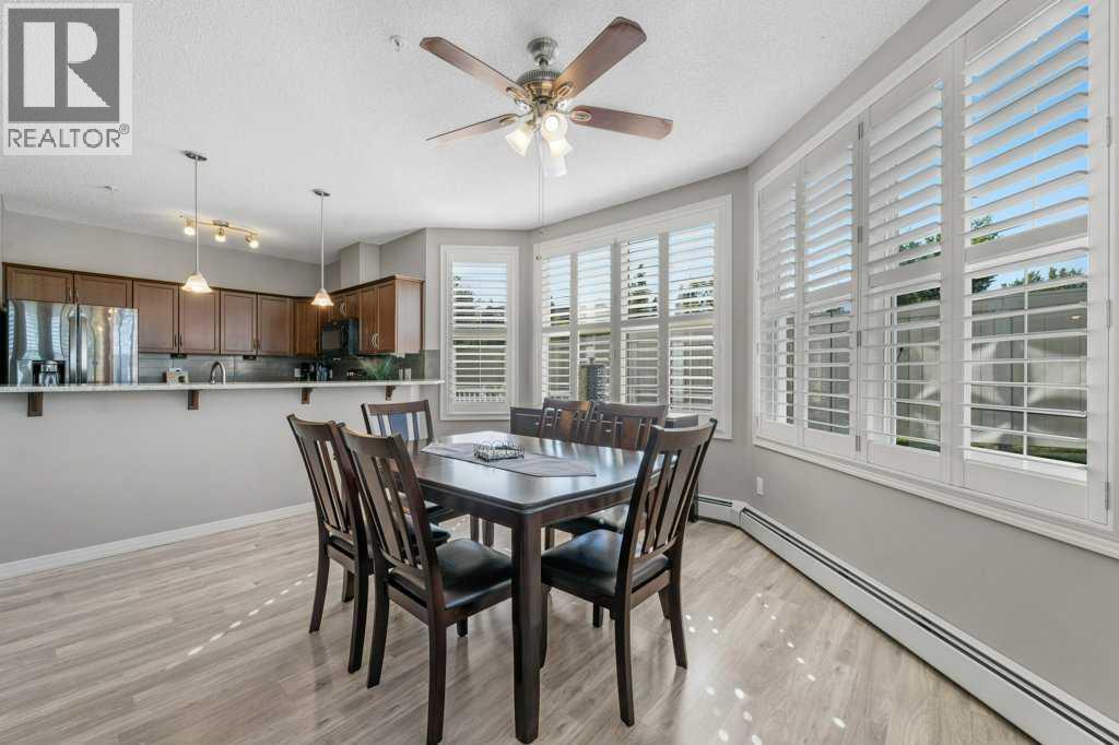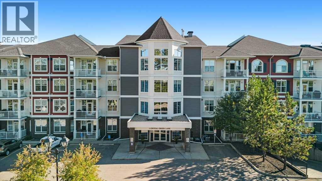 Welcome to this beautiful large corner "former show suite" - located on the main floor of the desirable Penncross complex. So much natural light from large windows throughout the living room and both bedrooms, this home offers a bright and open executive space. Thoughtful upgrades are found throughout, including high-end shutters on all windows, a corner built-in cabinet near the entry, a built-in "Murphy Bed" in the guest room, plus a full sized washer and dryer. The gourmet kitchen is large, with an abundance of cabinetry, plus granite counters, complimented by stainless steel appliances. The living room is spacious, allowing room for entertaining. The primary bedroom features a walk-in closet and a private updated 3-piece ensuite, while the second bedroom is generous in size and conveniently located next to a 4-piece main bathroom. Penncross offers outstanding amenities including a fitness centre, games room, library with fireplace, and indoor/outdoor putting greens—perfect for relaxing or entertaining. Just steps away is Crystal Ridge Golf Course, and your condo fees include year-round lake access to Crystal Shores. To top it all off, this unit comes with two titled underground parking stalls—a rare and valuable bonus. Enjoy executive-style living at an incredible value in one of Okotoks' most desirable communities! (id:53676)