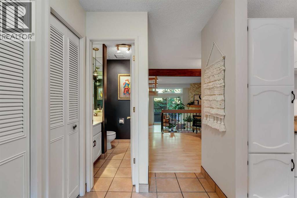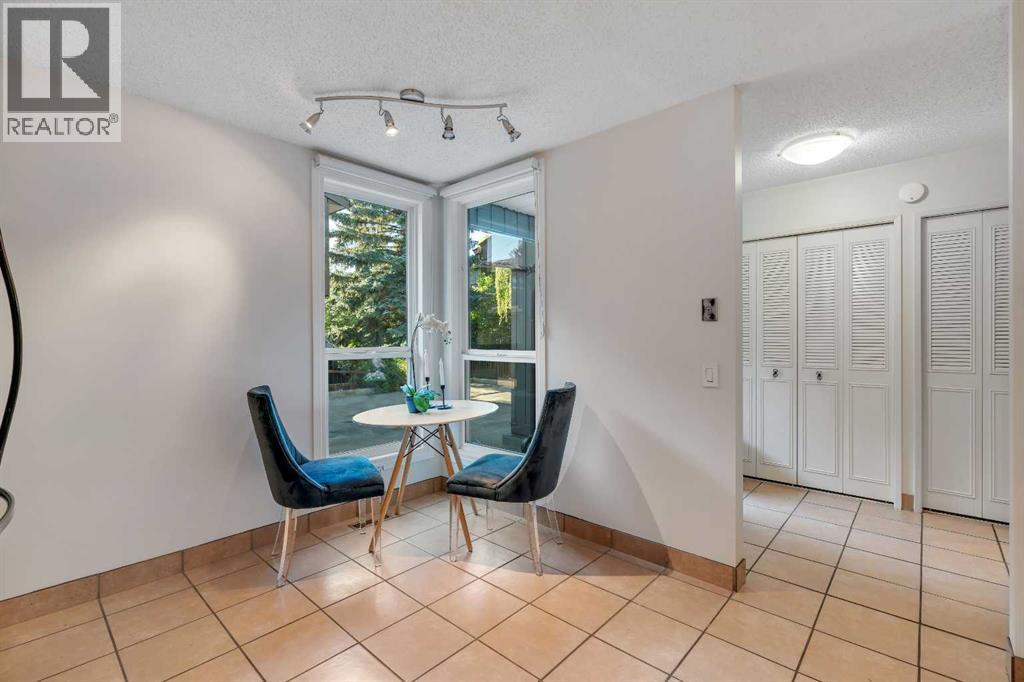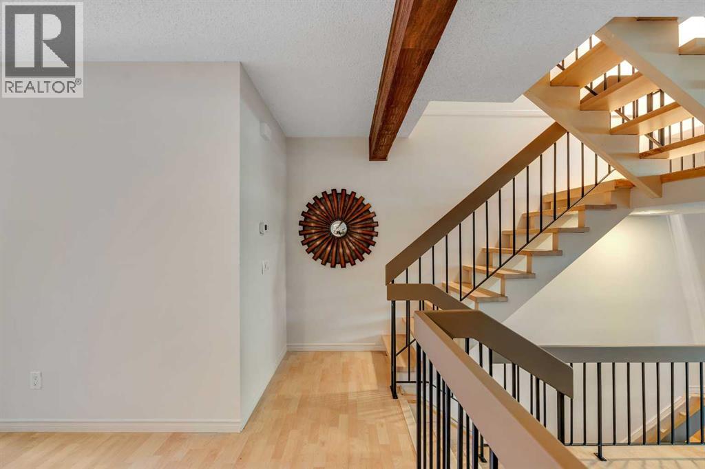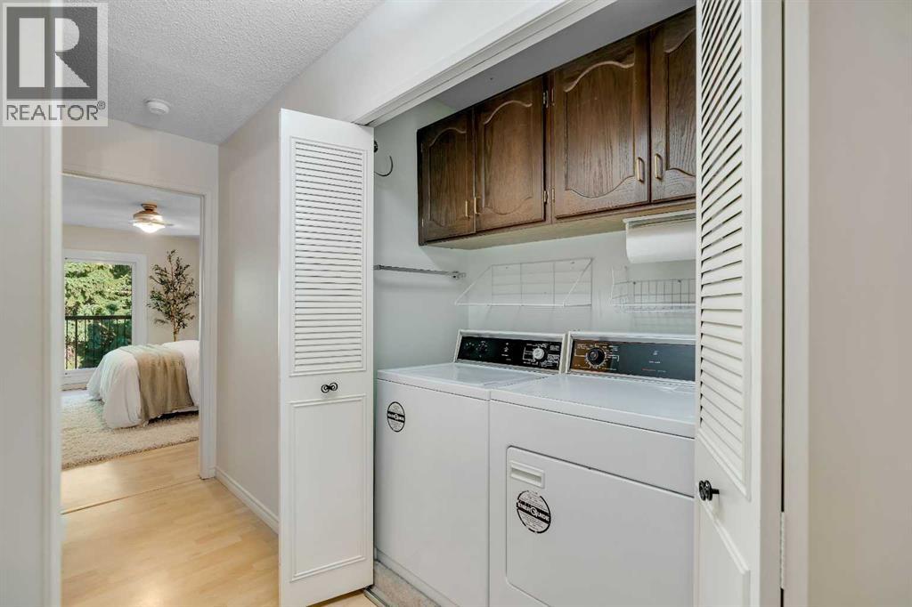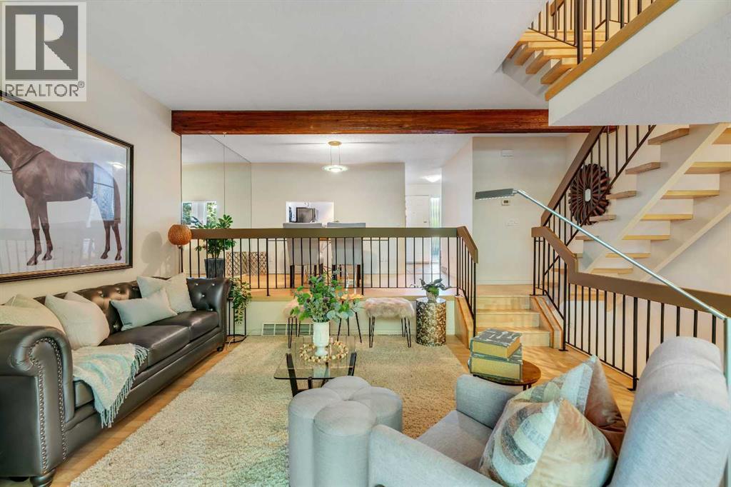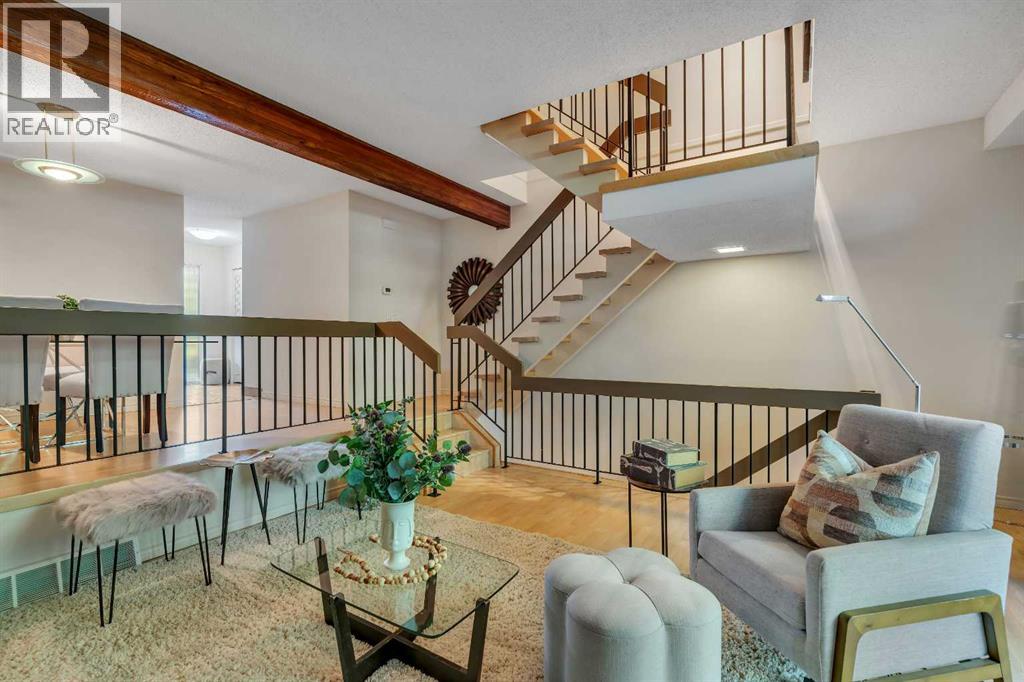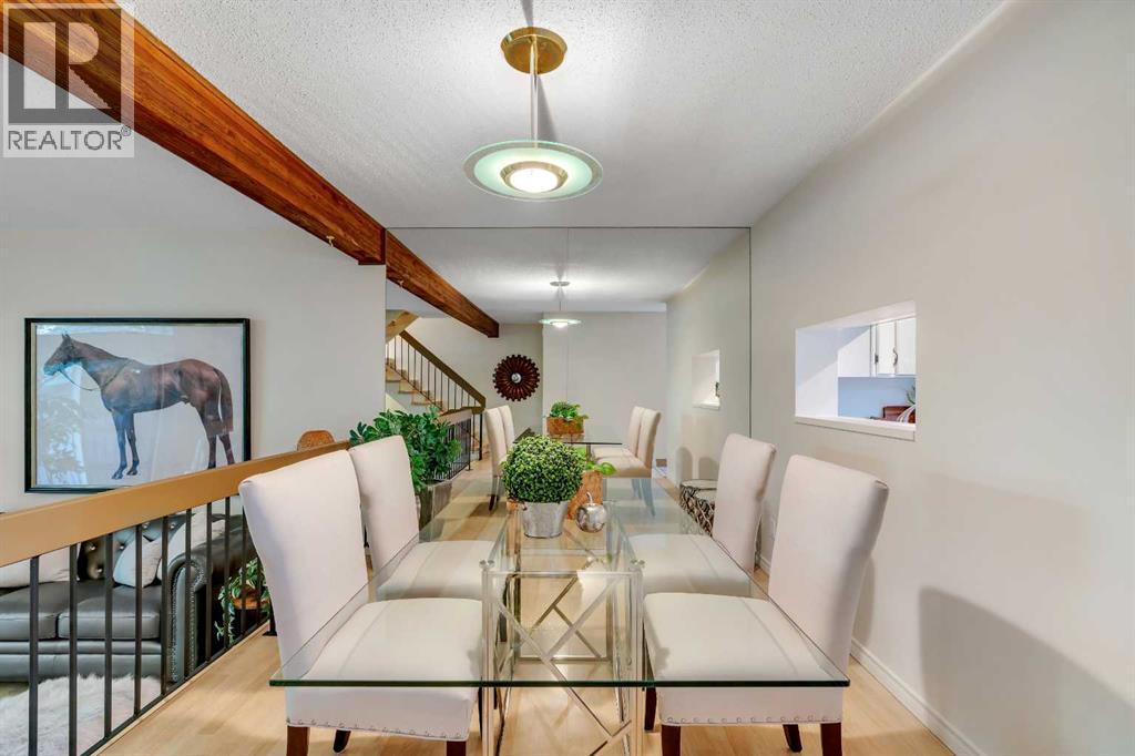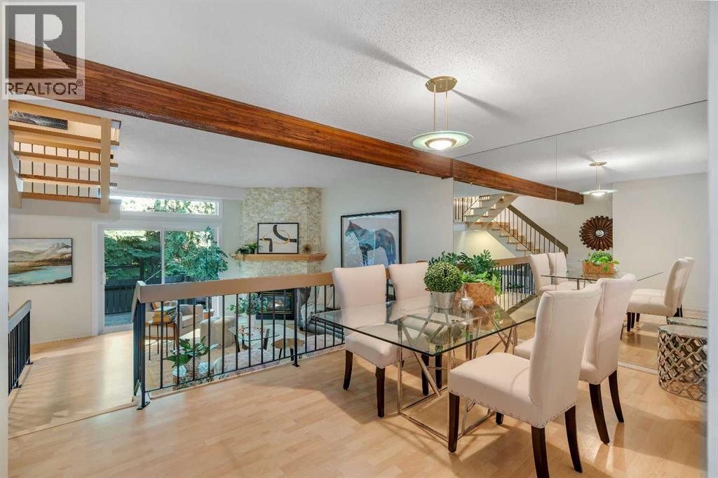 Immediate possession available! This is the one you’ve been waiting for in Phase 3 which is the most desirable and coveted location in the complex, backing directly onto a beautiful treed green space. This stunning townhome in the sought after community of Lakeview offers over 1,572 sq ft above grade plus a private attached double garage, blending unique architectural charm with thoughtful updates in one of Calgary’s most established inner city neighbourhoods. The bright and functional kitchen features freshly painted cabinetry with new hardware, updated lighting, newer countertops, sink, and faucet, kitchen nook, and a convenient pass through to the dining area. The spacious dining room overlooks a cozy sunken living room with soaring ceilings, exposed beams, stone gas fireplace with new mantle, and sliding patio doors with transom windows that open to a private large deck surrounded by gorgeous mature trees and a convenient 2 pc powder room next to storage closet. Upstairs, the large primary suite easily fits a king bed with its own balcony, and includes a large walk in closet and 3-piece ensuite, across the hall enjoy the convenience of upper floor laundry, a large second bedroom, a big flex space that can used as an office (or potential third bedroom), and a full bath complete the level. Additional highlights include wood flooring throughout (laminate upstairs and down, solid maple steps to the upper floor), freshly repainted, newer hardware, newer baseboards, ceiling fans in all bedrooms. Recent upgrades add incredible value: all windows and both patio doors replaced, air conditioning (2024), new fridge and dishwasher (2023), new garage door (2022), gas fireplace and mantle, new hot water tank (~3 years), and a regularly serviced newer furnace. The oversized double garage provides excellent storage with shelving, bike hooks, and plenty of room for vehicles or a workshop plus the additional excellent storage next to garage is fantastic.. This well managed comple x has reasonable condo fees and reflects clear pride of ownership throughout. Perfectly located steps from North Glenmore Park, IGA, shopping, amazing top schools, Taza Park, and countless amenities, this home combines size, function, and style in one of Calgary’s most desirable neighborhoods. Don’t miss this opportunity =book your showing today! (id:53676)