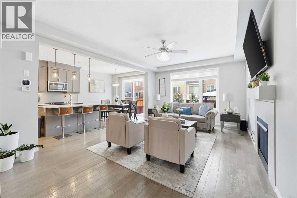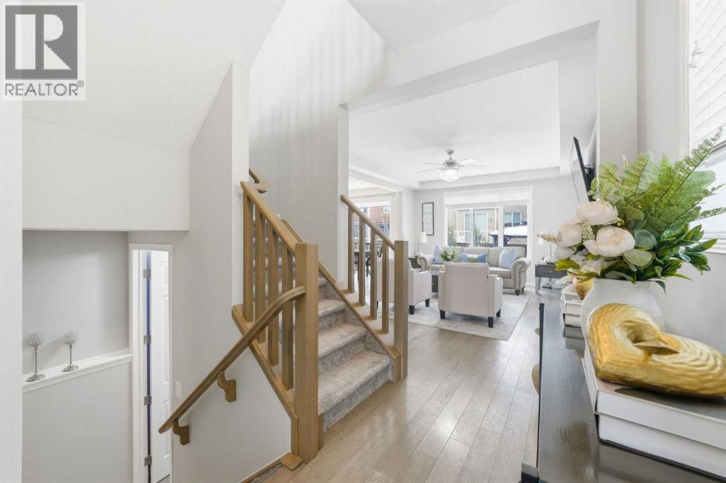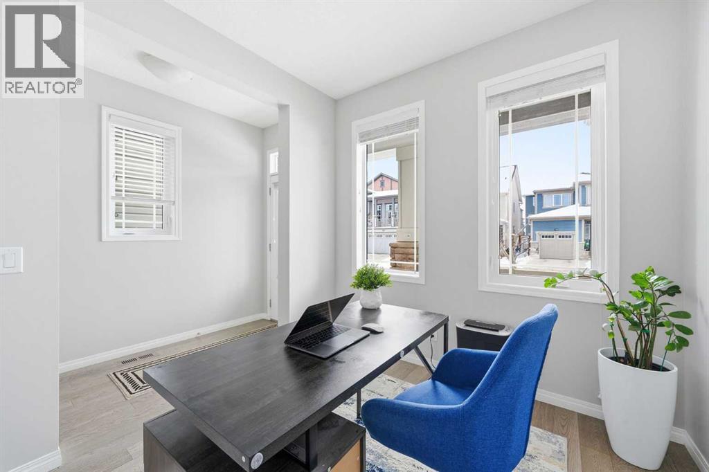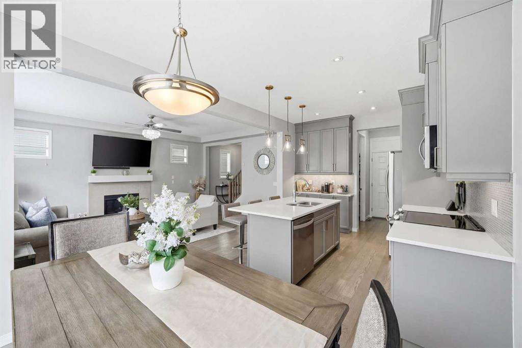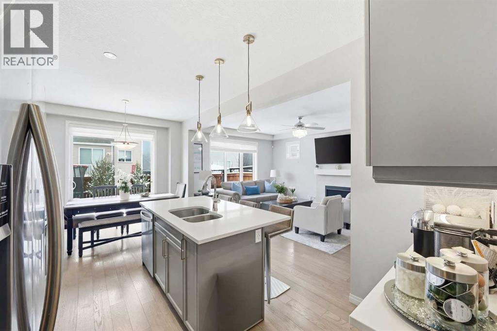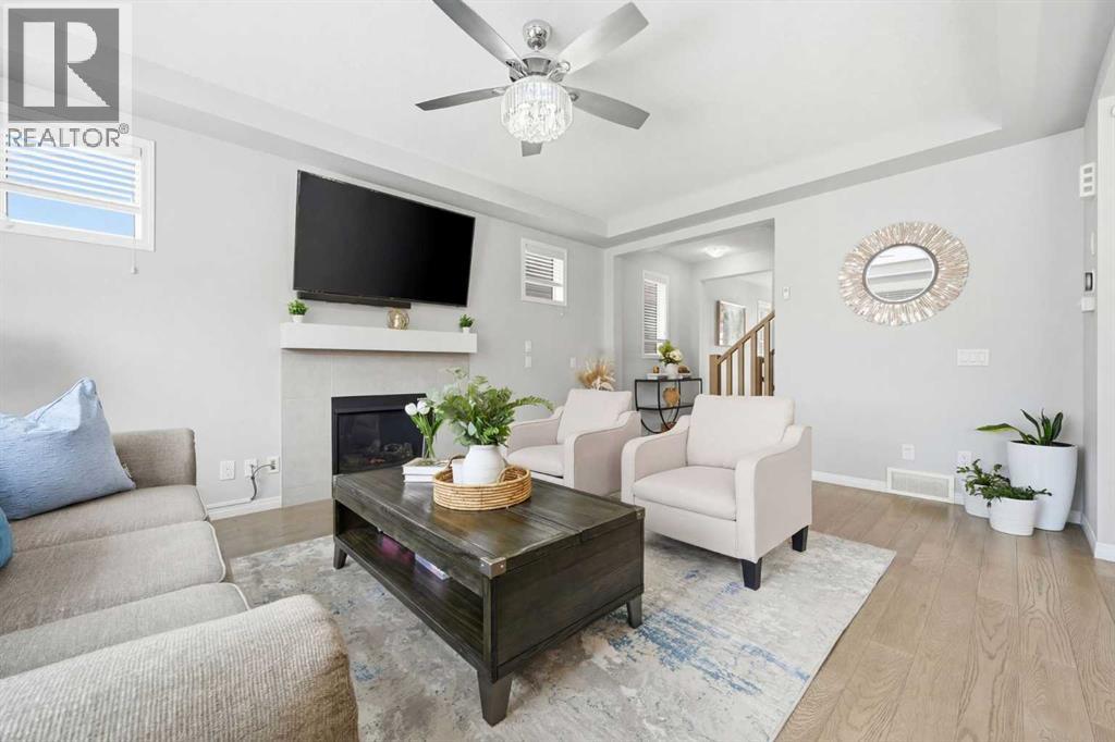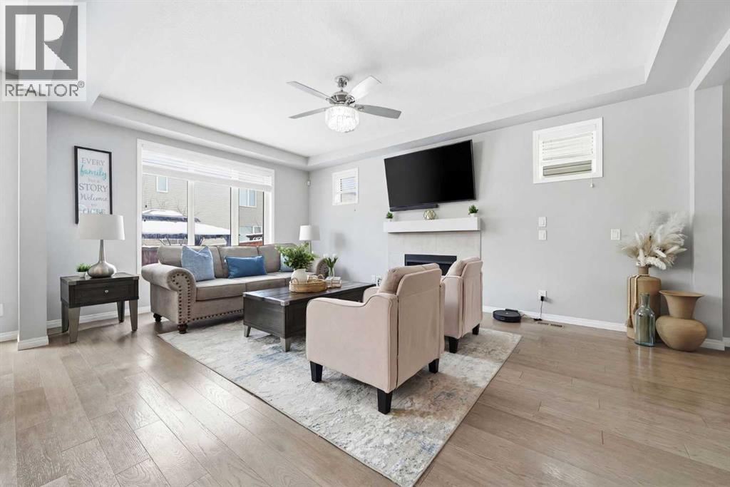 Located on a quiet street just steps from parks and scenic pathways, this beautifully upgraded family home offers nearly 2,800 sq. ft. of modern living space. The bright, open-concept main floor features hardwood flooring, 9’ ceilings, and upgraded stainless steel appliances including a spacious fridge and electric range, walk-through pantry, and large island. The main level also includes a spacious living room with gas fireplace, dining area overlooking the backyard, and a den/office. Upstairs offers 3 bedrooms, including a primary suite with walk-in closet and spa-like ensuite featuring a double vanity, walk-in shower, and soaker tub, along with upper laundry. The partially finished basement includes 2 bedrooms and 1 bathroom, with one bedroom and the bathroom fully completed, offering excellent potential for future development or extended family living. Enjoy the fully landscaped, private backyard with stamped concrete patio and gazebo, perfect for entertaining. Situated in the family-friendly South Windsong community close to schools, shopping, parks, and amenities. Move-in ready and beautifully maintained—this home is a must-see!! (id:53676)