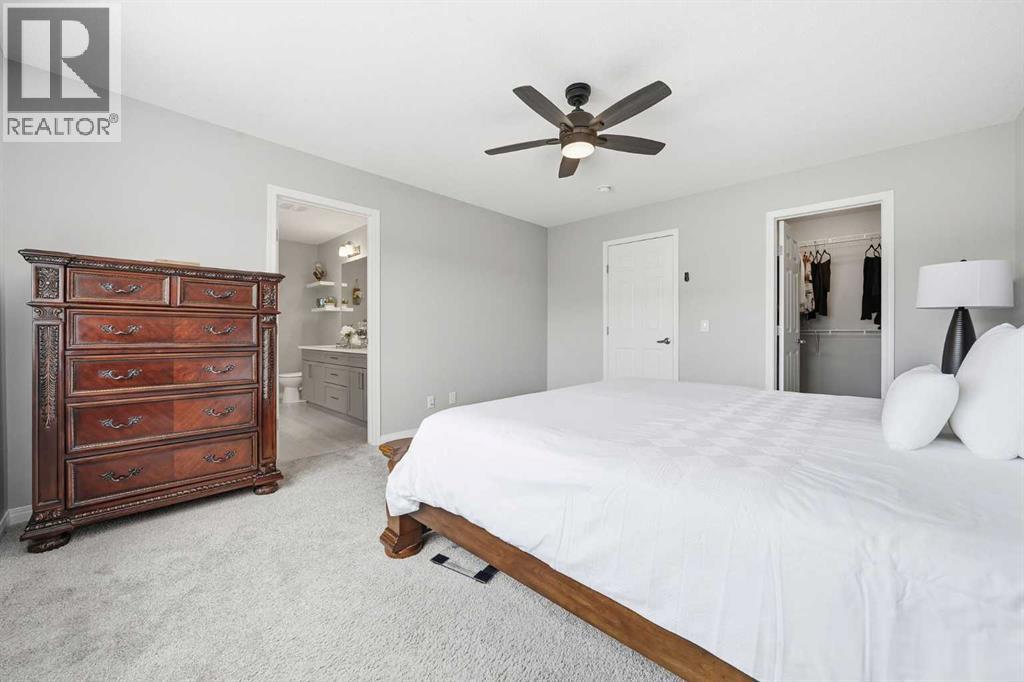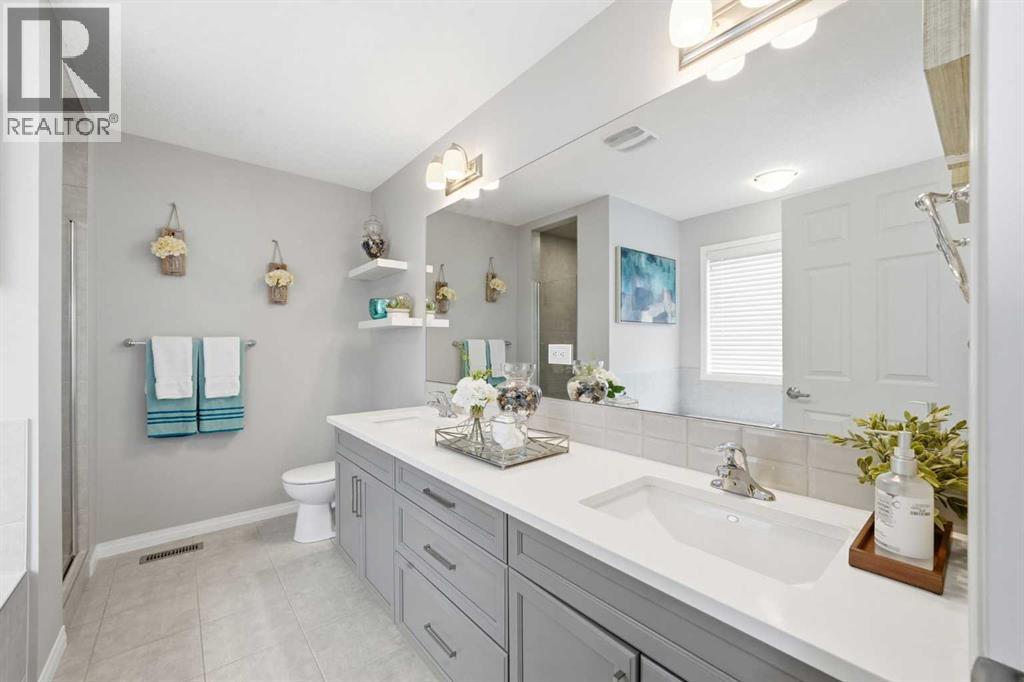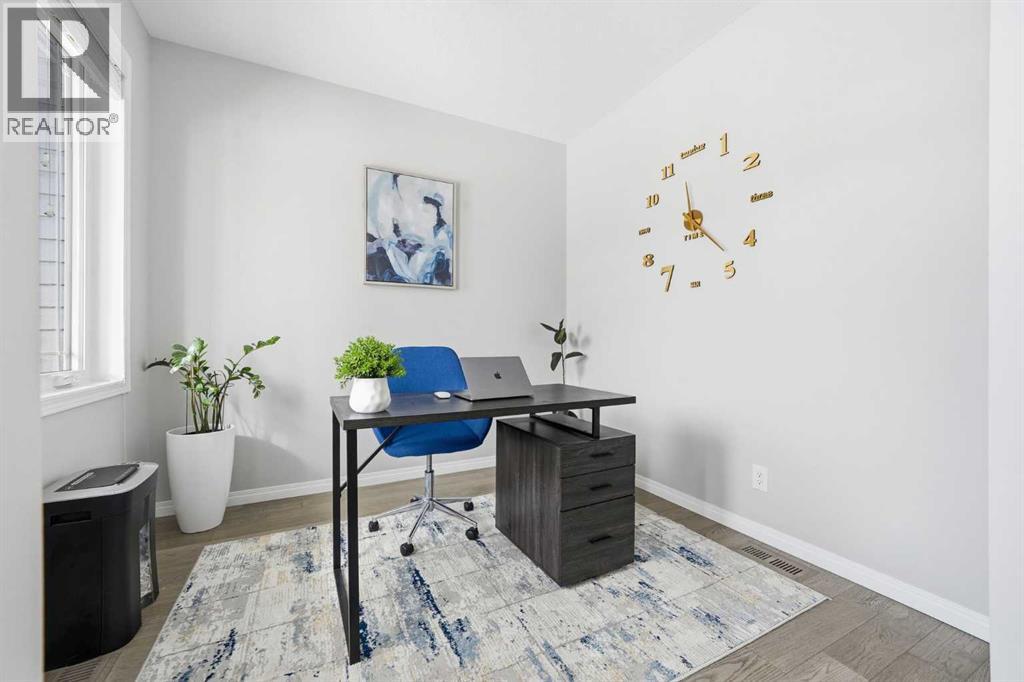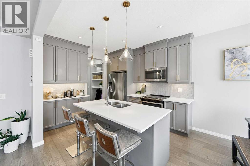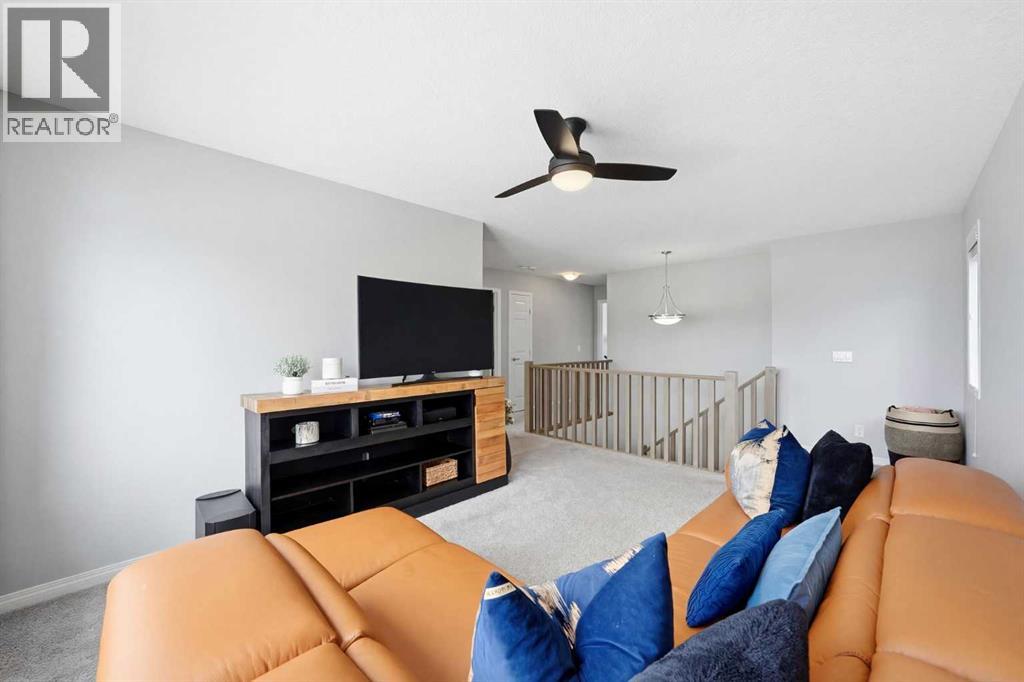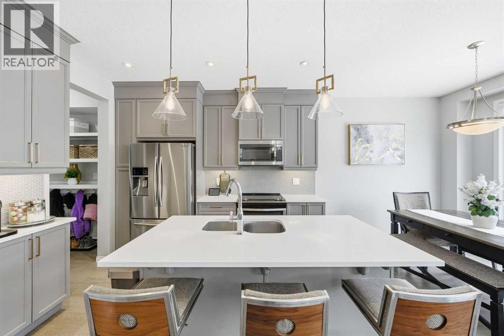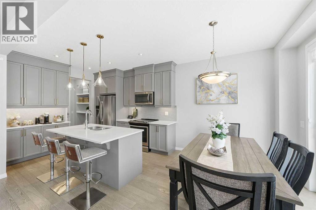 Located on a quiet street just steps from parks and scenic pathways, this beautifully upgraded family home offers nearly 2,800 sq. ft. of modern living space. The bright, open-concept main floor features hardwood flooring, 9’ ceilings, and upgraded stainless steel appliances including a spacious fridge and electric range, walk-through pantry, and large island. The main level also includes a spacious living room with gas fireplace, dining area overlooking the backyard, and a den/office. Upstairs offers 3 bedrooms, including a primary suite with walk-in closet and spa-like ensuite featuring a double vanity, walk-in shower, and soaker tub, along with upper laundry. The partially finished basement includes 2 bedrooms and 1 bathroom, with one bedroom and the bathroom fully completed, offering excellent potential for future development or extended family living. Enjoy the fully landscaped, private backyard with stamped concrete patio and gazebo, perfect for entertaining. Situated in the family-friendly South Windsong community close to schools, shopping, parks, and amenities. Move-in ready and beautifully maintained—this home is a must-see!! (id:53676)