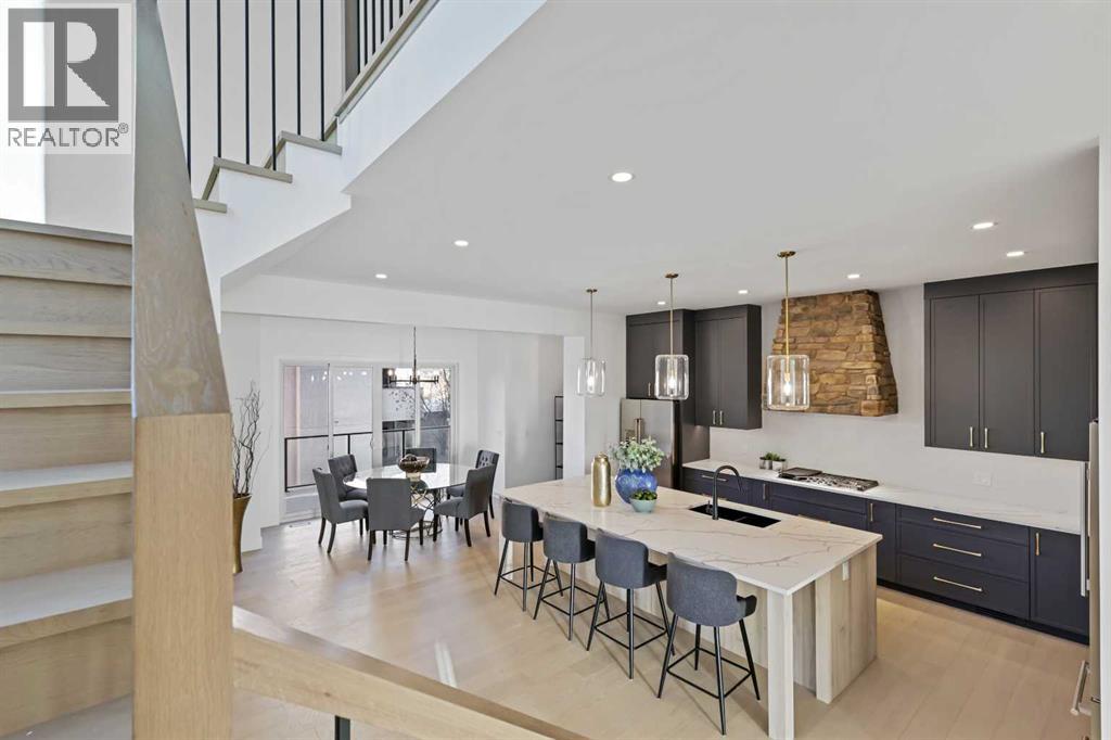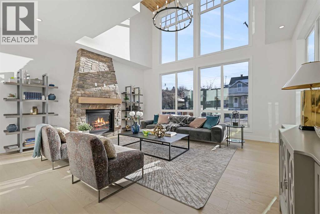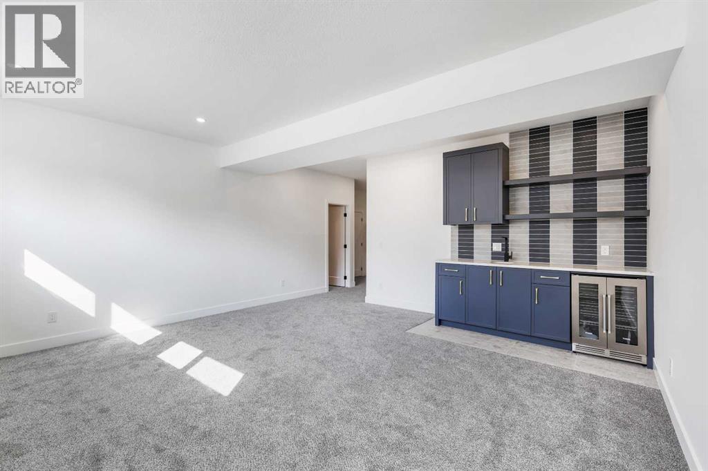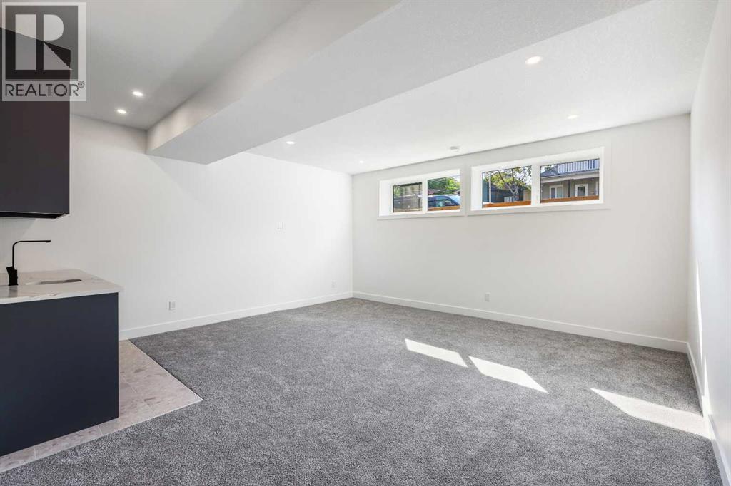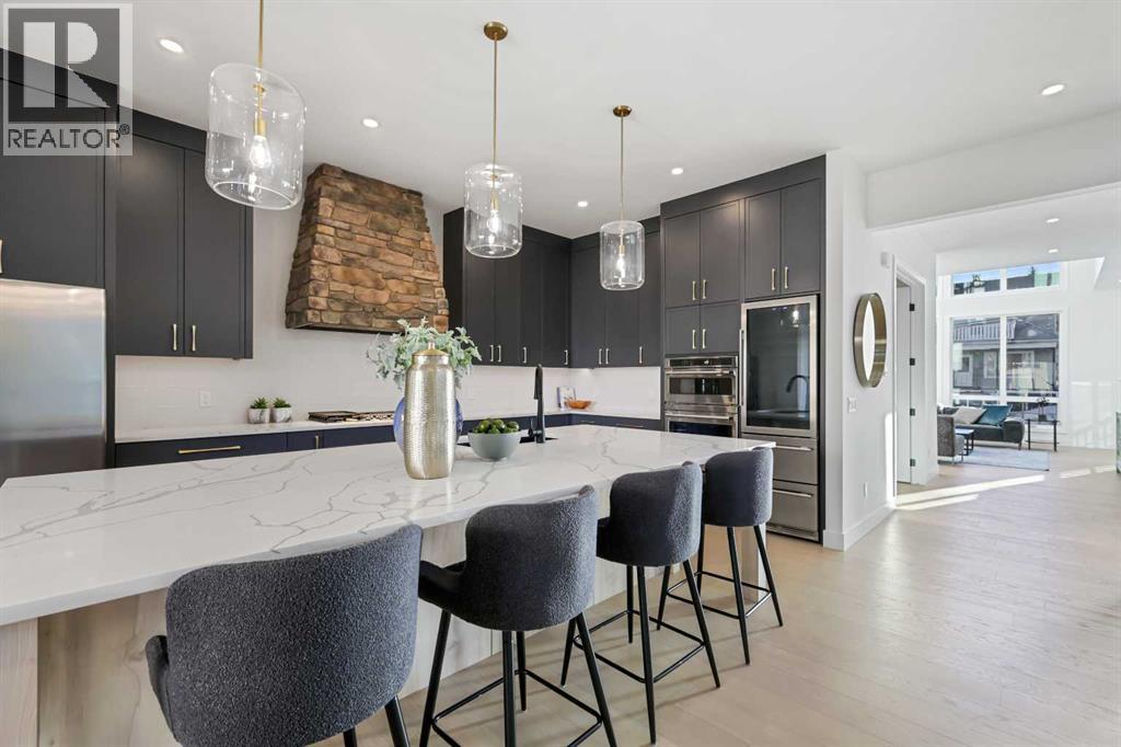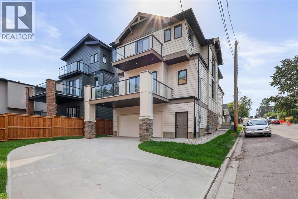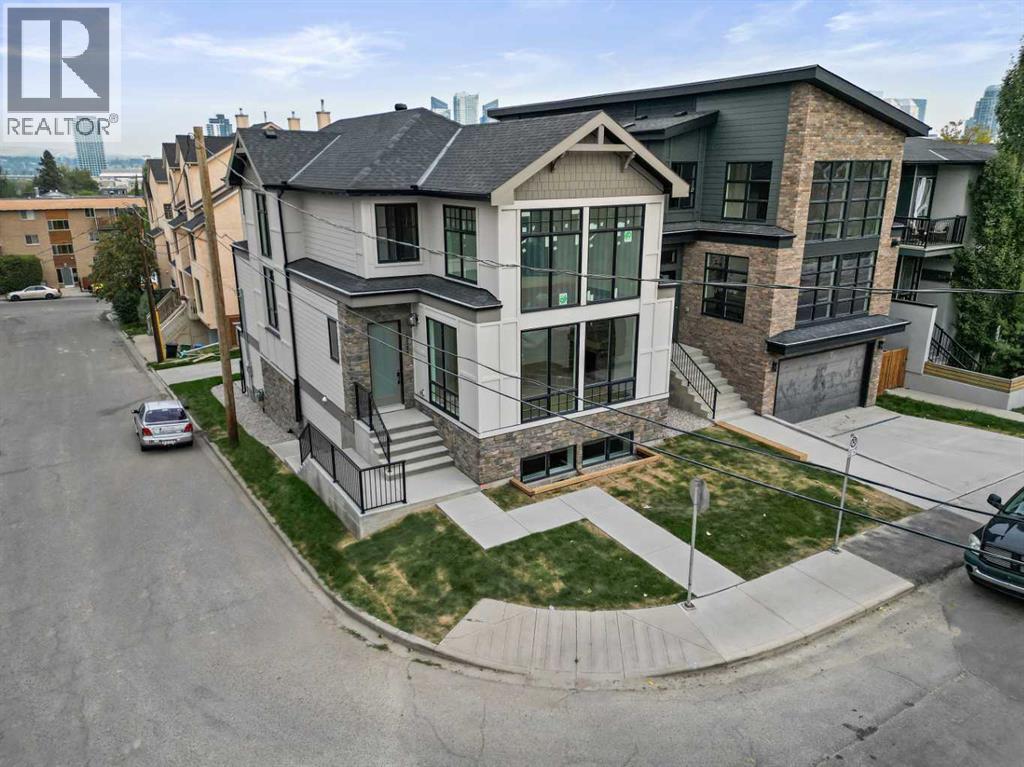 Welcome to 1516 22 Ave SW — a brand-new, luxurious infill offering panoramic Downtown views in the heart of Calgary’s highly sought-after Bankview neighborhood. With 3,465 square feet of meticulously crafted living space, this modern masterpiece boasts 4 spacious bedrooms, 4 designer bathrooms, and a stunning fusion of comfort, style, and sophistication. Step inside to soaring vaulted ceilings accented with rich wood tones, creating a warm and inviting atmosphere. The sun-drenched living room features custom built-ins, a dramatic stone gas fireplace, and expansive bay windows that frame the skyline. A versatile den or home office adds functional flexibility. The chef-inspired kitchen is a standout, equipped with premium GE Café appliances including a wall oven, gas cooktop, and microwave. Elegant quartz countertops, chic blue cabinetry, a generous island, and a handcrafted stone range hood are complemented by a crisp white tile backsplash. A dedicated wine cellar adds a touch of indulgence. The adjacent dining room is ideal for everyday meals or elegant entertaining. Upstairs, the serene primary suite offers a walk-in closet with custom built-ins and a luxurious 5-piece ensuite with a soaker tub, dual sinks, and a glass steam shower. Two additional bedrooms, each with their own walk-in closets, share a stylish 4-piece bathroom. Enjoy sweeping Downtown views from the private second-floor deck. The upper-level laundry room includes a washer, dryer, sink, and ample storage for added convenience. The fully developed walk-out basement is perfect for entertaining or relaxing, featuring a large family room, wet bar, guest bedroom, 3-piece bath, and generous storage. The oversized lot enhances the home’s spacious feel and natural flow. Perfectly positioned near 17th Avenue’s vibrant shops and restaurants, Marda Loop, Mount Royal University, and with easy access to Downtown, this extraordinary residence is more than a home — it’s a statement of modern luxury living. (id:53676)