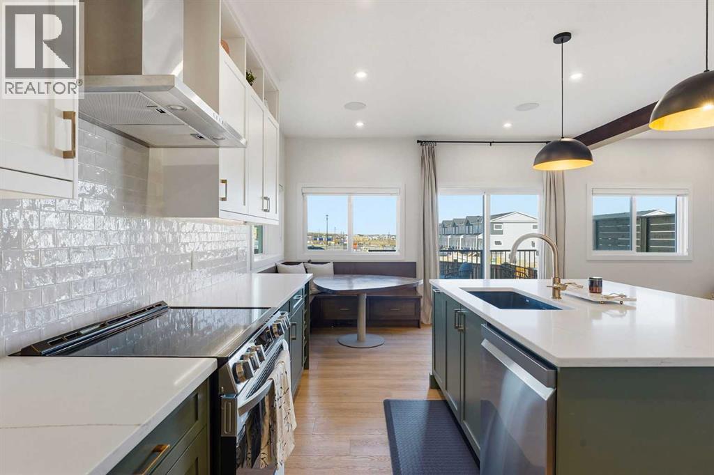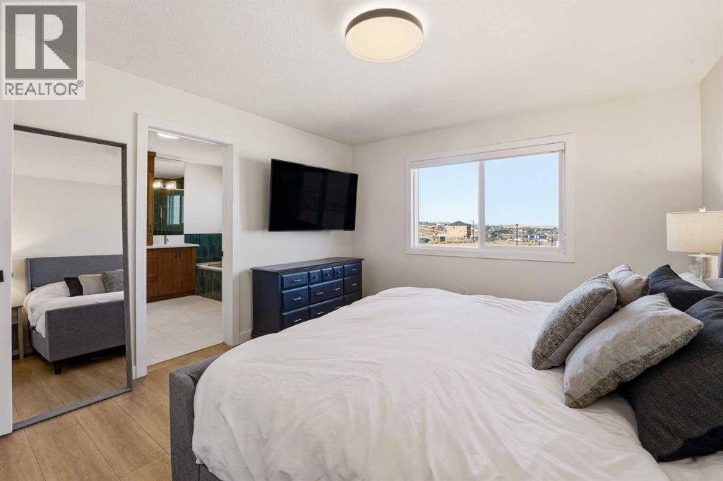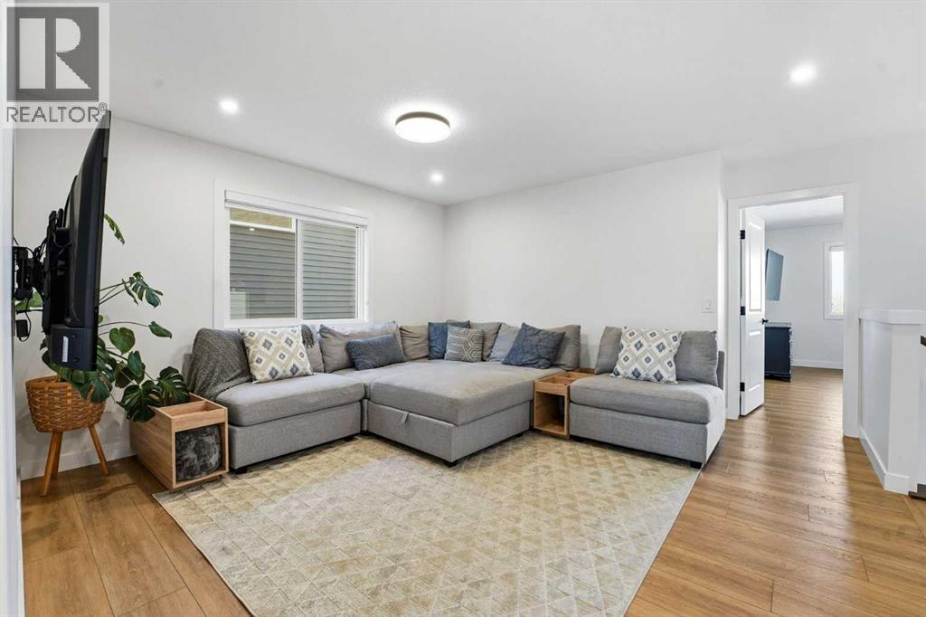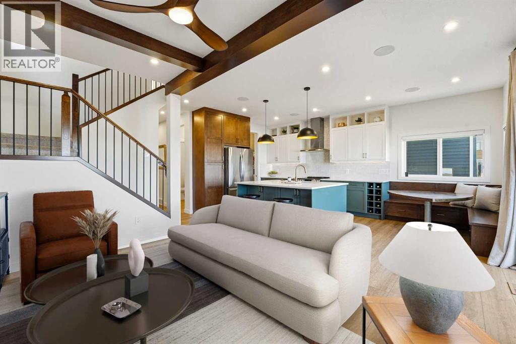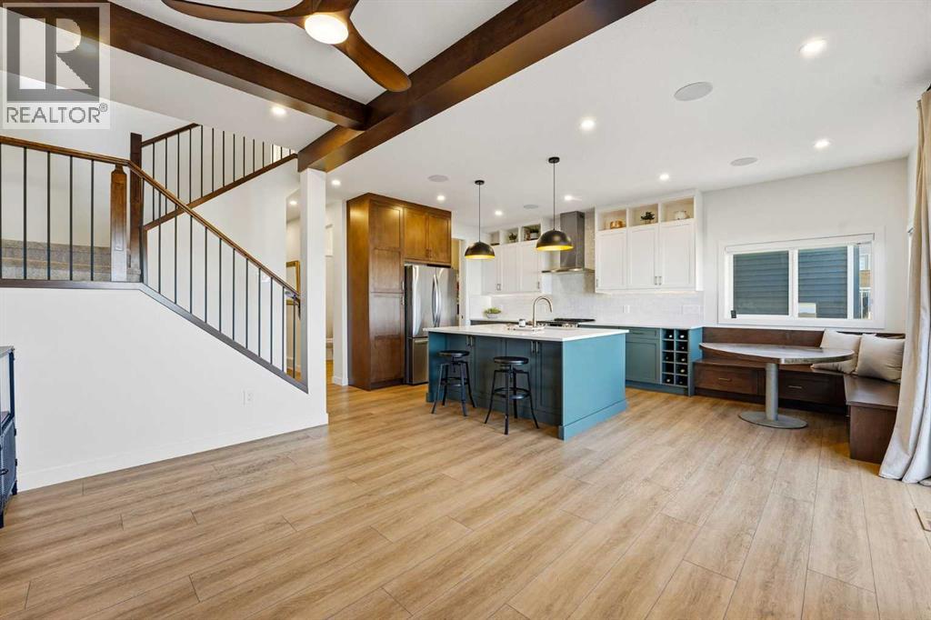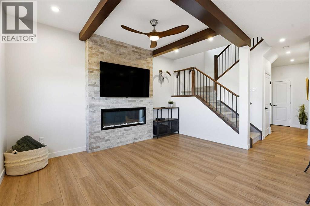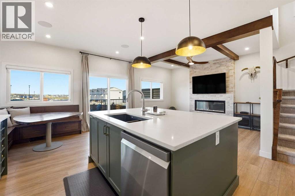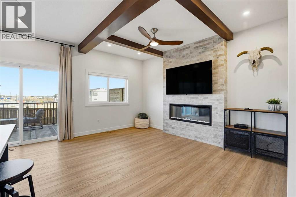 Welcome to 16 Key Cove in the Brand New Community of Key Ranch, Airdrie! Where luxury and functionality come together in perfect harmony. Built in 2024, this stunning home blends high-end design with everyday comfort and trust us, the photos don't do it justice! From the moment you step inside, you'll fall in love with the spacious front entry and rich flooring that flows seamlessly through the main level. The open-concept layout features an inviting living area, highlighted by gorgeous wood-beam ceiling details and a floor-to-ceiling fireplace that makes an incredible statement. The chef-inspired kitchen is a true showstopper, complete with rich cabinetry, upgraded countertops, premium appliances, a custom dining nook, and even a built-in wine rack. The walk-through pantry connects effortlessly to a generous mudroom for added convenience. Step outside to enjoy a fully landscaped backyard, featuring a large deck and new fencing, perfect for relaxing or entertaining guests. Upstairs, a central bonus room provides the ideal space for movie nights or homework sessions. You'll also find upstairs laundry, two spacious secondary bedrooms, and a luxurious primary suite that truly impresses. The spa-inspired 5-piece ensuite offers a walk-in tile shower, soaker tub, dual vanities, and a large walk-in closet. Your private retreat awaits! Additional features include central air conditioning, epoxy-coated garage flooring, and thoughtful upgrades throughout. This home truly has it all: style, comfort, and unbeatable value in one of Airdrie's most exciting new communities. See for yourself why 16 Key Cove should be your next address! (id:53676)