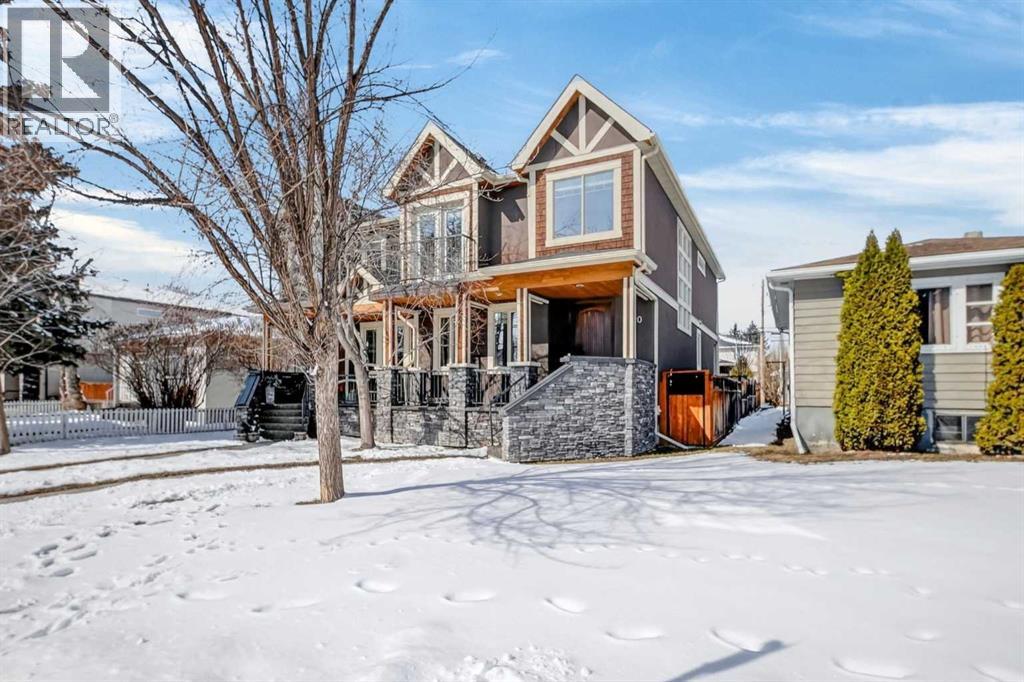 Beautifully designed semi-detached home in Capitol Hill, just minutes to SAIT, Confederation Park, transit, and walking distance to the downtown core. Eye-catching curb appeal with stone, stucco, and cedar, plus a sunny south-facing front porch. The solid wood front door with a 3-point locking system opens to a bright main floor featuring a striking open spiral staircase and a full wall of windows. The open-concept layout is ideal for entertaining, with a spacious kitchen offering a large granite island, premium Jenn-Air appliances including a 6-burner gas range and wall oven, and seamless flow into the living area with a stone gas fireplace. Solid wood rear doors lead to the backyard. The sunken backyard offers added privacy and is beautifully landscaped with patio pavers, a natural gas fire pit, and a hot tub, creating an ideal outdoor space. Upstairs features 8-foot ceilings throughout, a generous primary suite with Juliet doors, built-in storage, and a massive walk-in closet, along with two additional bedrooms, a full bath, and upper laundry. The fully developed basement includes a fourth bedroom, full bathroom, and a large flexible living space. (id:53676)
