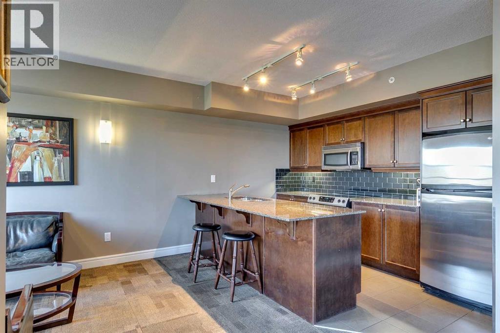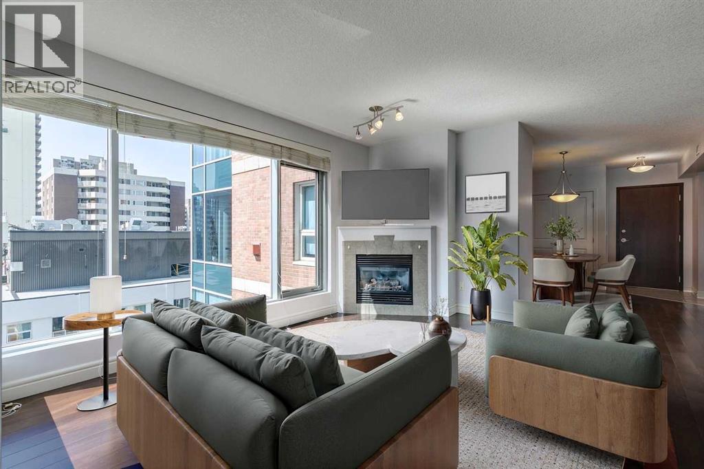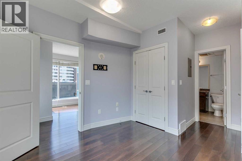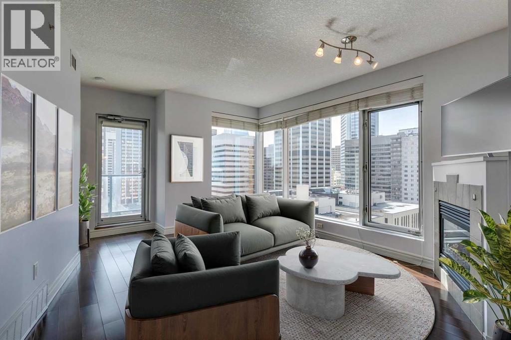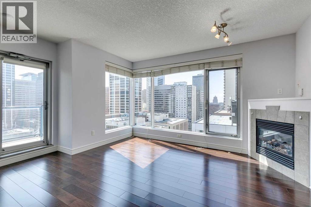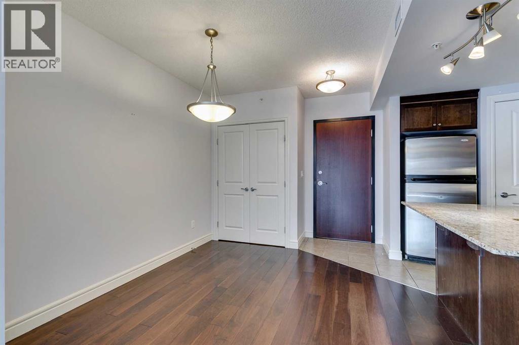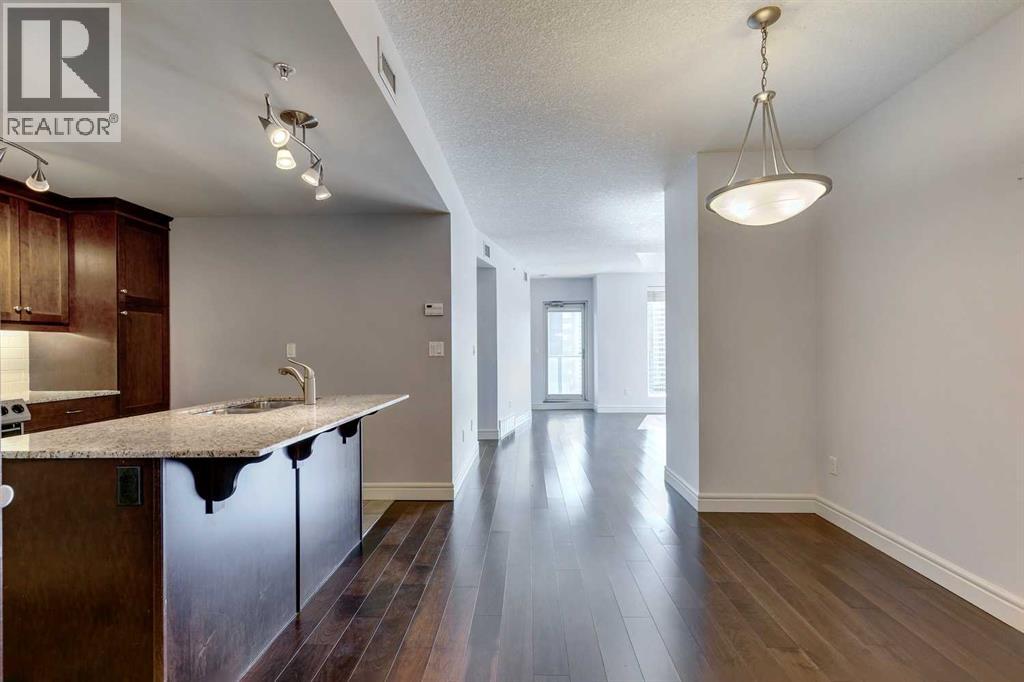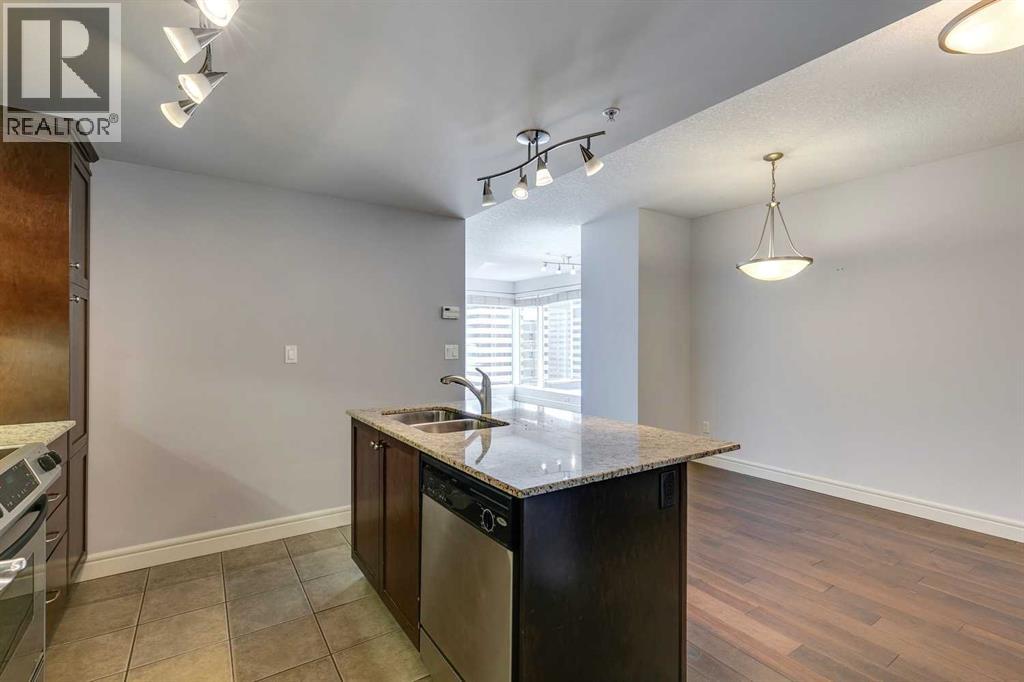 Experience luxury living in the sought after Five West II Tower. Nestled in an unbeatable location in the heart of downtown, this executive 1 bedroom / 1 bathroom condo offers a convenient lifestyle for those wanting to enjoy everything inner city living has to offer. As you step inside, you’ll be captivated by an abundance of natural light, gleaming hardwood floors and a modern open concept floorplan. The elegant kitchen overlooks a spacious dining area (or flex space) and boasts a large island with breakfast bar, stainless steel appliances, granite countertops, and an abundance of storage including a built in pantry. As you enter the living room you can't help but notice the floor to ceiling windows with expansive views of downtown, and a cozy gas fireplace….the perfect place to relax after a long day. The primary bedroom offers plenty of space for a kingsize bed, double closets, and private access to the 4pc bathroom. This unit is fully equipped with insuite laundry, 1 titled underground parking stall and an assigned storage locker. Indulge in the best that Calgary has to offer just steps away, from restaurants, shopping, entertainment districts, Prince’s Island Park, the Bow River Pathway, and beyond. Close to all amenities and easy access to the LRT, bike paths, and more. Five West II is a highly sought after residential complex, offering concierge service, secured underground parking, visitor parking, a complimentary car wash, bicycle storage, residents’ lounge with games area, and a state-of-the-art residents terrace. Don’t miss the opportunity to call this beautiful property home!Please note – some photo’s have been virtually staged. (id:53676)