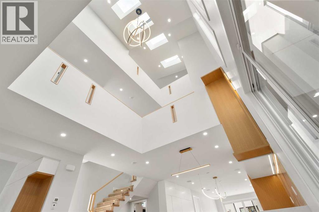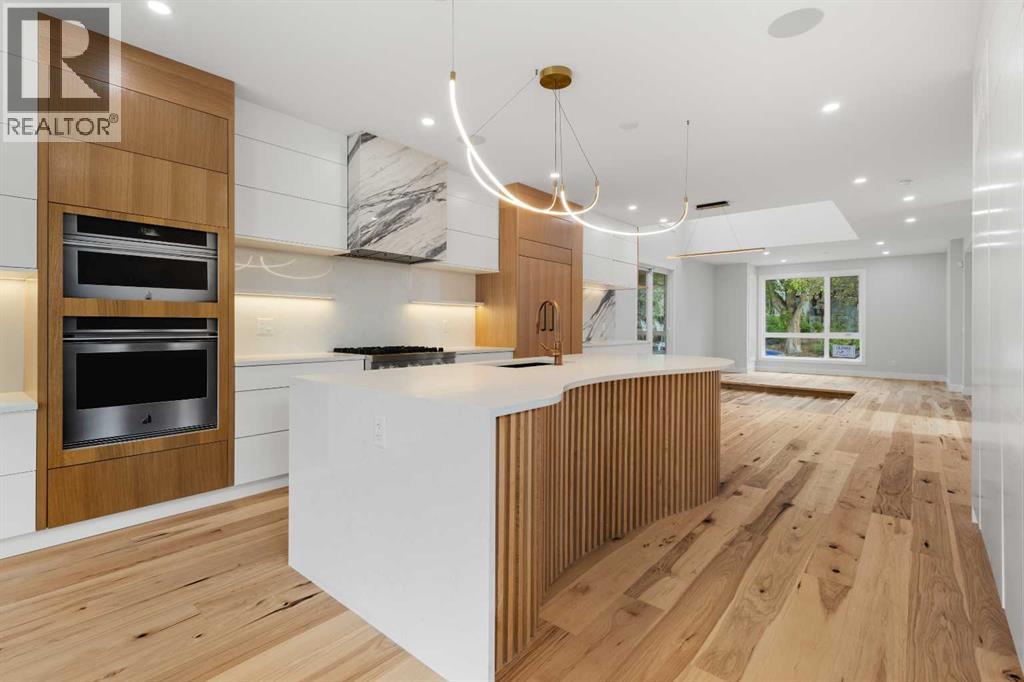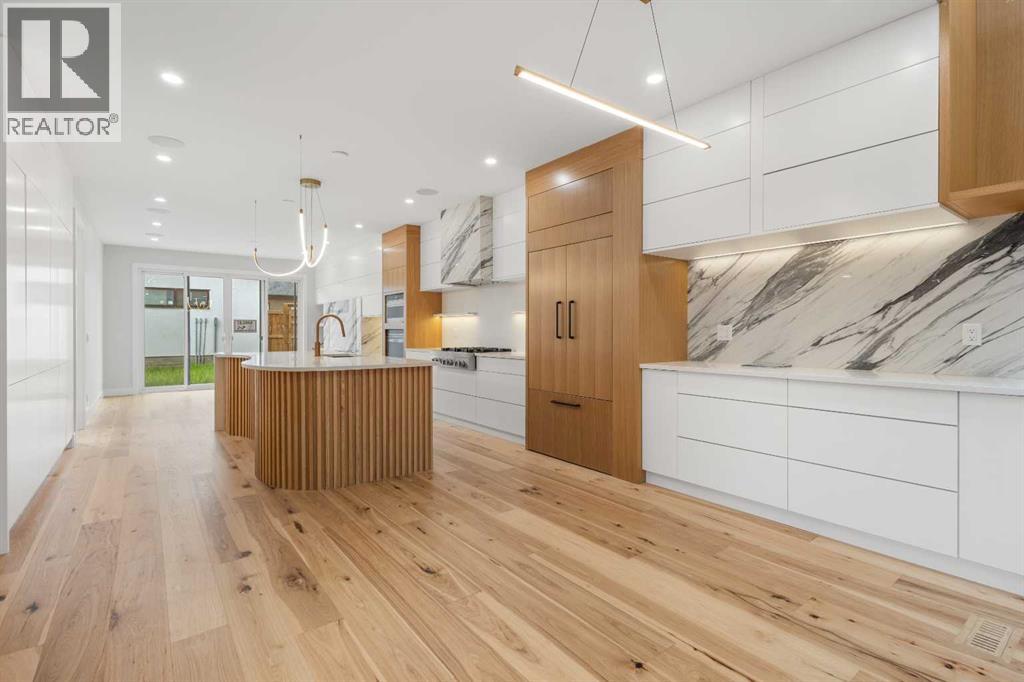 Welcome to an exceptional contemporary residence boasting over 4,000 sq ft of exquisitely designed living space, nestled on a quiet, tree-lined street in the prestigious Capitol Hill community. This architectural gem blends sophisticated style, artistic character, and practical functionality—all just steps from top-rated elementary schools, SAIT, 16th Ave, Nose Hill Park, and a short drive to the University of Calgary, Foothills Hospital, Children’s Hospital, and Downtown Calgary. The one-of-a-kind luxury infill features artistic architecture with open-to-above design. Step inside and experience a warm, inviting ambiance highlighted by rich hardwood flooring throughout. The gourmet kitchen is a showpiece—featuring a curved center island, custom cabinetry, and fully integrated JennAir appliances, including a hidden fridge and dishwasher. This seamless flow continues into the open-concept dining and living areas, where a striking modern gas fireplace is framed with designer tile. Enjoy indoor-outdoor living with sliding patio doors that lead to a sun-soaked south-facing deck, complete with a natural gas line—perfect for summer BBQs. A versatile flex room offers space for a home office or reading lounge, while a contemporary powder room, and a well-organized mudroom with lockers round off the thoughtfully designed main floor. Upstairs, a cozy family lounge and a large laundry room with a sink provide everyday convenience. Each of the three bedrooms on this level comes with its own private ensuite, ensuring comfort and privacy for family or guests. The master bedroom ensuite is a luxurious retreat featuring in-floor heating, dual vanities, a deep soaker tub, and a spa-style glass walk-in shower with multiple showerheads. All bedrooms are equipped with Vanair doors, providing both soundproofing and enhanced air circulation. The top floor features a stunning bonus flex room with a wet bar, full bathroom, and access to two rooftop patios—a south-facing terrace offering pan oramic city skyline views, and a spacious north-facing deck ready for your personal touch. This level is perfect for entertaining or could easily convert into a fourth bedroom or office. The fully developed basement with in-floor heating offers even more flexibility with an expansive recreation room, a second wet bar, a fifth bedroom, and another full bathroom. Don’t miss your chance to make this extraordinary property your own. Book your private showing today. (id:53676)