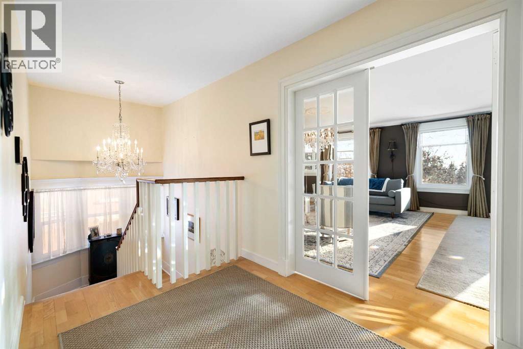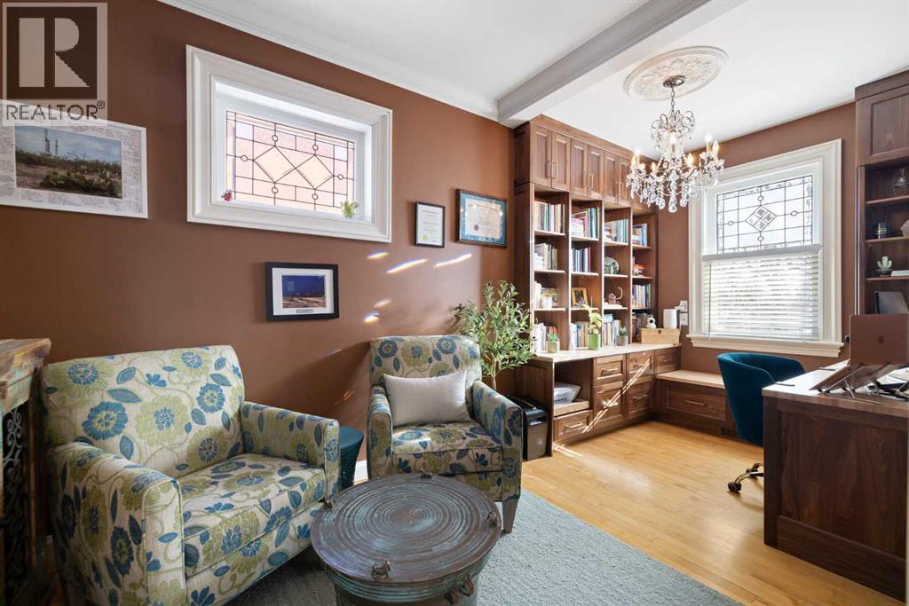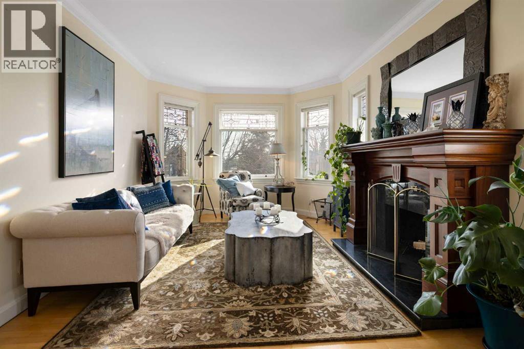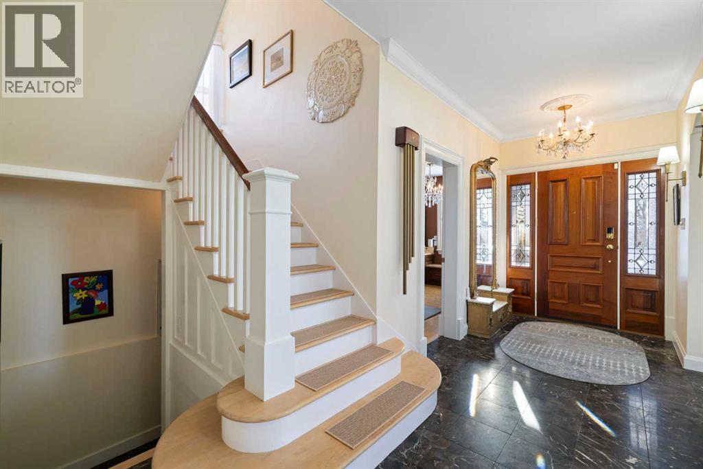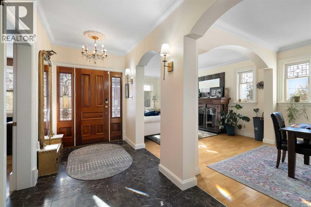 Stepping into this well-maintained 1912 estate in Shaganappi feels like entering a livable piece of art. High ceilings & marble floors set the stage for an interior where historic soul meets modern precision. With over 3,800 sq.ft of curated living space, the layout was designed to host grand events. As you step in, you're welcomed by dual living spaces and two dining features framed by custom mahogany millwork, an executive office with built-ins, and the warmth of a classic wood-burning fireplace. The daily rhythm revolves around light and luxury. The kitchen is anchored by rich mahogany cabinetry, newer Miele appliances, and vast counters scaled for entertaining. Mornings begin in the primary suite, bathed in east-facing sunlight with direct views of the Calgary skyline before stepping into a custom-built ensuite. While heritage homes often lack modern utility, investments in this home ensure comfortable living with dual laundry setups on both the main and upper floors, alongside newly upgraded bathrooms. The lower level maximizes versatility with a separate entrance, a full bathroom, and a dedicated flex space. A third fireplace warms the mahogany-trimmed rec room, but the true highlight is the custom movable bookcase, which seamlessly swings open to reveal hidden storage and a utility room. Outside, the west-facing yard is a private summer oasis featuring a four-zone irrigation system, a stone patio, and a built-in water feature. Inner-city living usually means fighting for parking, but this property redefines urban convenience with a large garage, a parking pad and a long interlocking brick driveway in front, located less than 10 minutes from downtown. You're encouraged to join the Shaganappi community association for access to the private tennis courts, outdoor rink and community events. Make sure to enjoy the surrounding area by visiting either of the two off-leash parks, exploring the Bow River, and discovering all the conveniences along 17th Ave. To finis h it off, take a short 10-minute walk to the C-Train Station where you're only two stops away from Downtown Calgary. (id:53676)