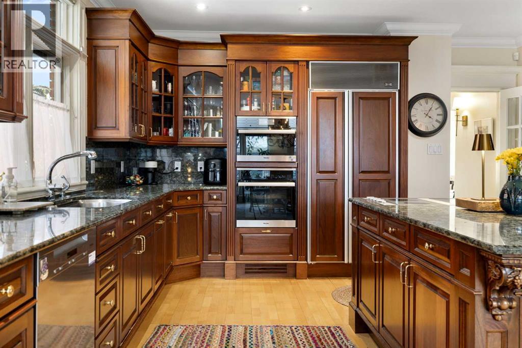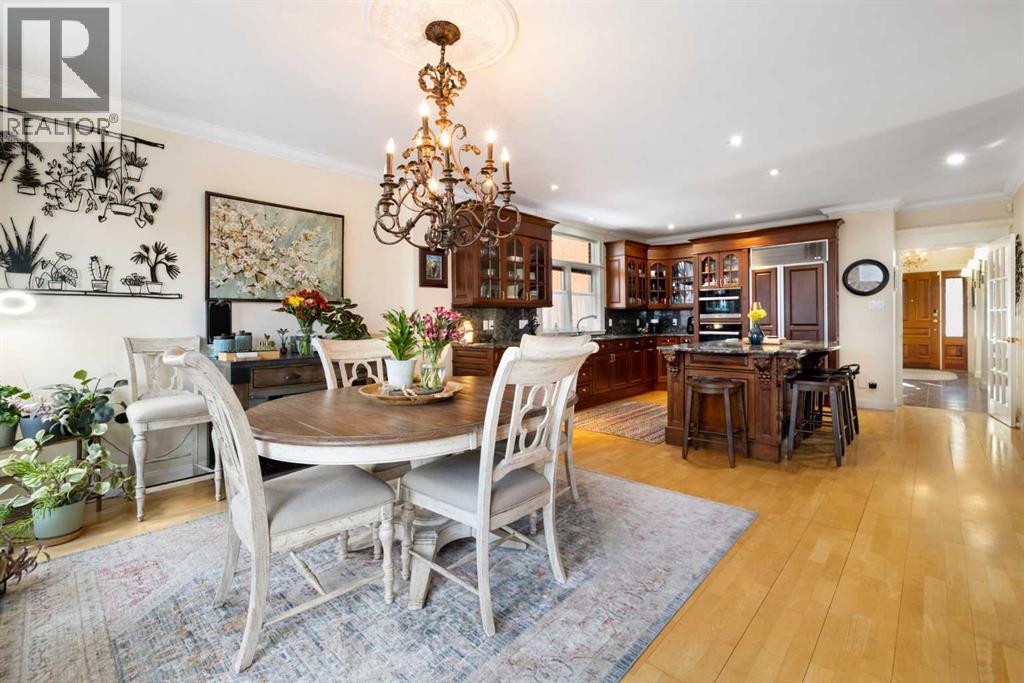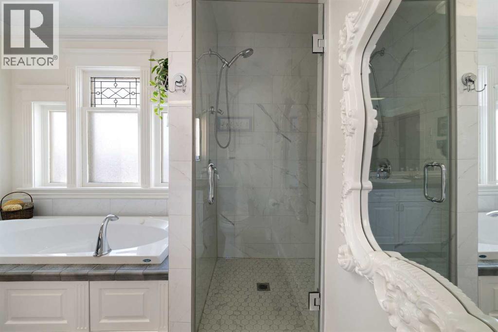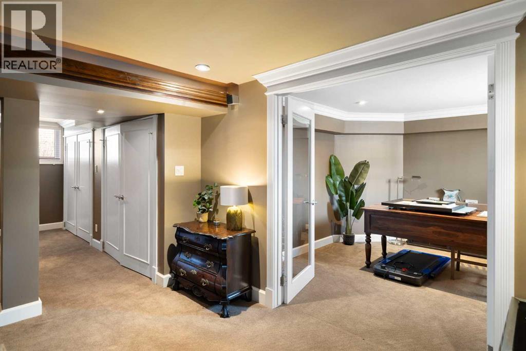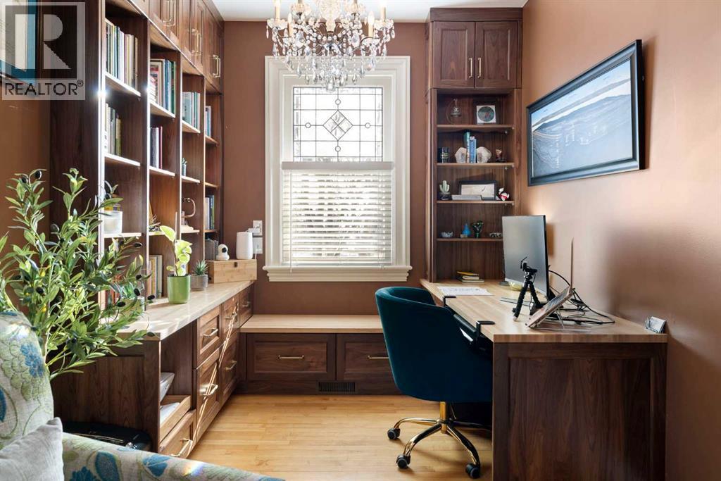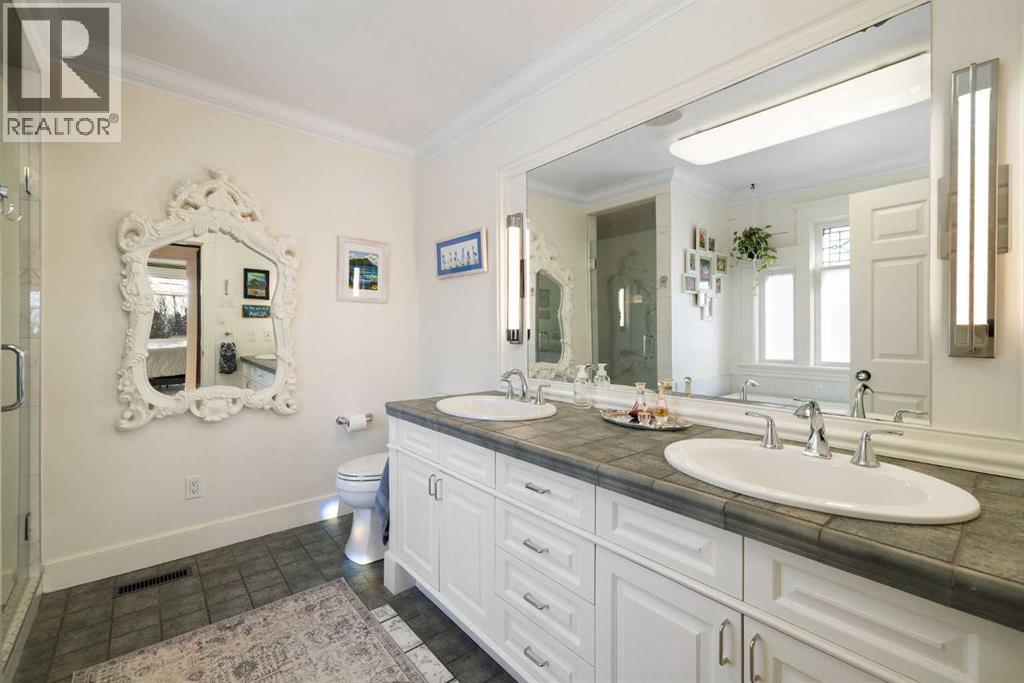 Stepping into this well-maintained 1912 estate in Shaganappi feels like entering a livable piece of art. High ceilings & marble floors set the stage for an interior where historic soul meets modern precision. With over 3,800 sq.ft of curated living space, the layout was designed to host grand events. As you step in, you're welcomed by dual living spaces and two dining features framed by custom mahogany millwork, an executive office with built-ins, and the warmth of a classic wood-burning fireplace. The daily rhythm revolves around light and luxury. The kitchen is anchored by rich mahogany cabinetry, newer Miele appliances, and vast counters scaled for entertaining. Mornings begin in the primary suite, bathed in east-facing sunlight with direct views of the Calgary skyline before stepping into a custom-built ensuite. While heritage homes often lack modern utility, investments in this home ensure comfortable living with dual laundry setups on both the main and upper floors, alongside newly upgraded bathrooms. The lower level maximizes versatility with a separate entrance, a full bathroom, and a dedicated flex space. A third fireplace warms the mahogany-trimmed rec room, but the true highlight is the custom movable bookcase, which seamlessly swings open to reveal hidden storage and a utility room. Outside, the west-facing yard is a private summer oasis featuring a four-zone irrigation system, a stone patio, and a built-in water feature. Inner-city living usually means fighting for parking, but this property redefines urban convenience with a large garage, a parking pad and a long interlocking brick driveway in front, located less than 10 minutes from downtown. You're encouraged to join the Shaganappi community association for access to the private tennis courts, outdoor rink and community events. Make sure to enjoy the surrounding area by visiting either of the two off-leash parks, exploring the Bow River, and discovering all the conveniences along 17th Ave. To finis h it off, take a short 10-minute walk to the C-Train Station where you're only two stops away from Downtown Calgary. (id:53676)