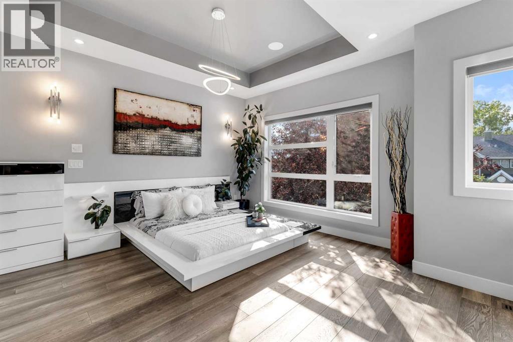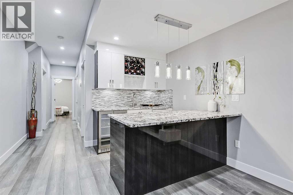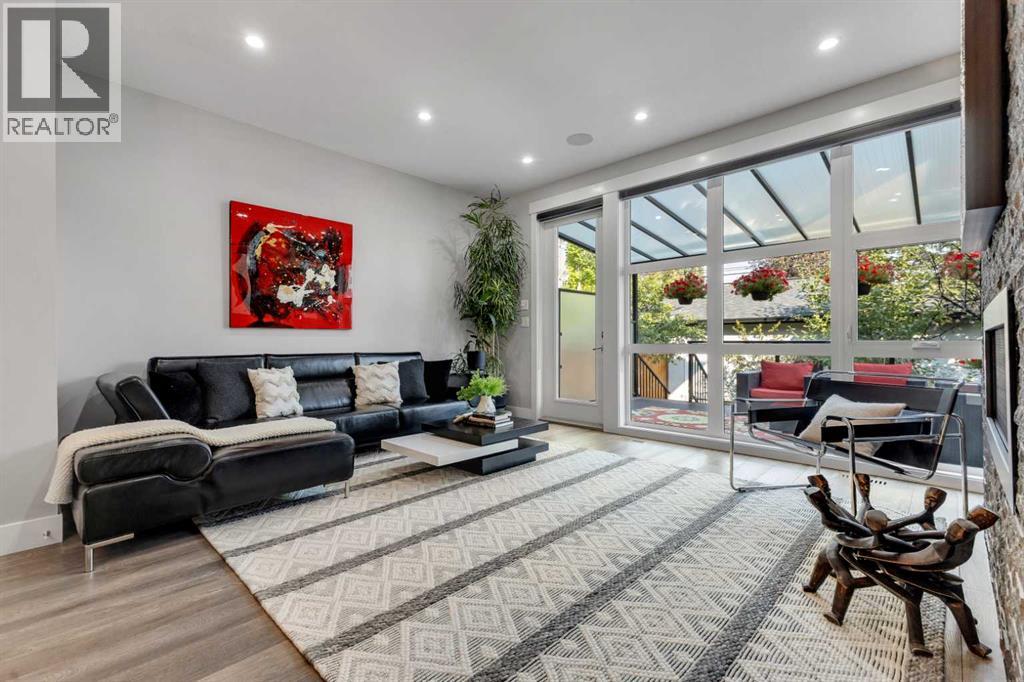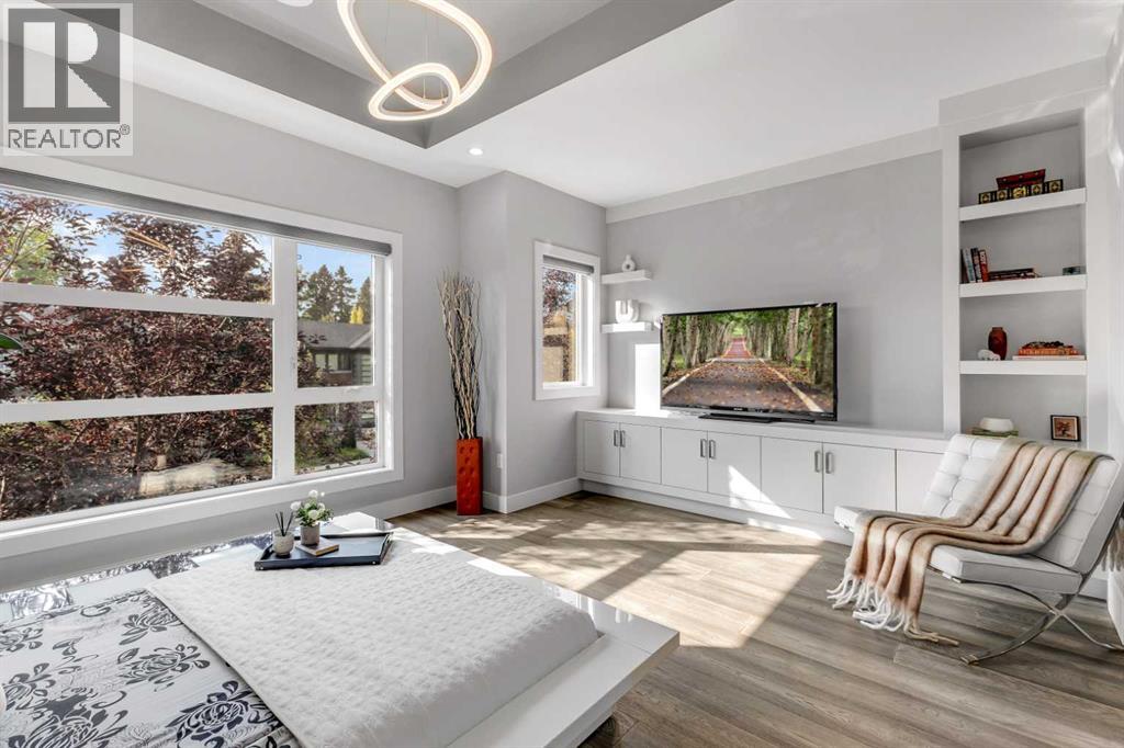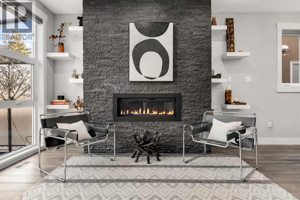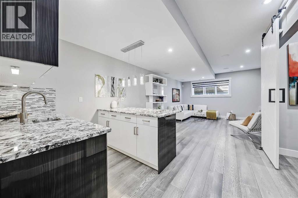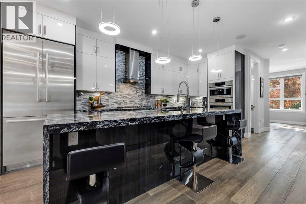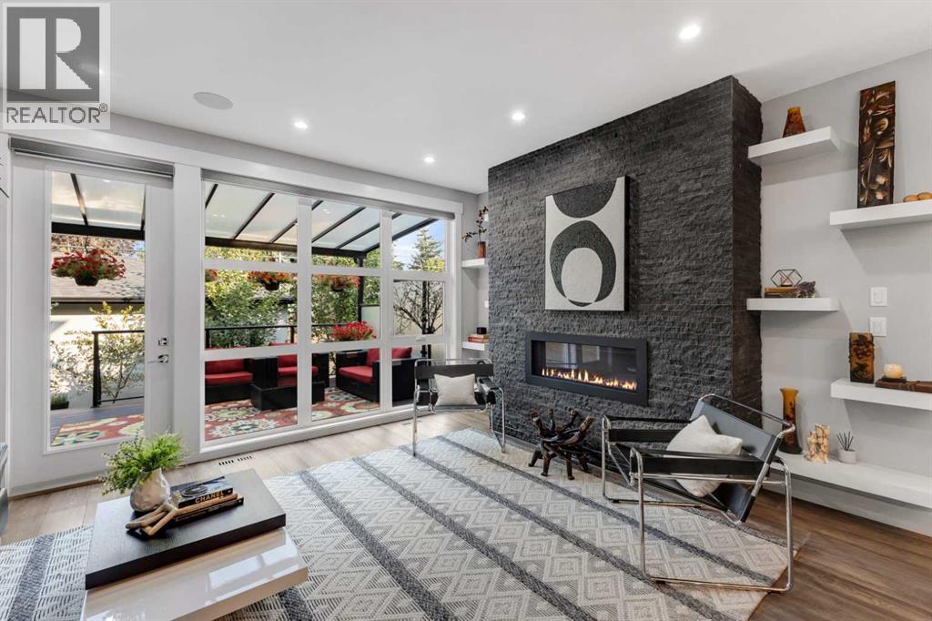 A PERGOLA-COVERED BACKYARD OASIS, a gourmet CHEF’S KITCHEN, and a private, fully finished basement with IN-FLOOR HEATING make this Shaganappi home truly one-of-a-kind. Designed for modern living with timeless style, it blends thoughtful updates with upscale finishes—engineered hardwood across all 3 levels, open riser stairs, a full-height stone fireplace, custom built-ins, and a serene primary retreat—all within steps of parks, schools, and the LRT. The welcoming foyer opens into a versatile front den—ideal as a home office, dining space, or quiet sitting room. Beyond, the kitchen showcases integrated BOSCH appliances: gas cooktop, built-in wall oven & microwave, stunning stainless steel hood fan, french door fridge and dishwasher all highlighted by MODERN high gloss cabinetry, and a waterfall island wrapped in stone. The adjacent living room feels elevated with its floor-to-ceiling stone fireplace and floating shelves, while large windows bring in natural light and frame views of the private yard. Outdoors, the pergola-topped deck transforms the backyard into a year-round retreat. Surrounded by mature trees, a manicured lawn, and finished with a double garage, this is a true extension of the living space. Upstairs, the primary suite impresses with a tray ceiling, expansive windows, and a full wall of custom shelving with media cabinetry. The spa-like ensuite features a freestanding tub, oversized tiled shower, dual vanity, and dedicated makeup desk. Two additional bedrooms, a full bathroom, and a convenient laundry room complete the upper level. The lower level is finished with in-floor heating throughout, offering a spacious family room with a sleek bar and island, and an oversized bedroom with a tray ceiling and ambient lighting that feels like a boutique hotel suite. Elegant barn doors at the stair entry enhance the sense of privacy, creating a sophisticated retreat within the home. Every detail has been considered—GROHE fixtures, custom closets, and an updated LED lighting package—to ensure both comfort and luxury. Set on a quiet street, the location is every bit as desirable as the home itself. Walk to Shaganappi Park with playground, off-leash area, and tennis courts, or enjoy nearby Shaganappi Point Golf Course, ball diamonds, and multiple playgrounds. Families will appreciate schools such as Alexander Ferguson, Sacred Heart, and Connaught, with Mount Royal University only minutes away. Commuting is effortless via the 26 Street LRT Station or major bus routes, and downtown is under 10 minutes by car. For dining, shopping, and lifestyle amenities, 17th Avenue, Westbrook Mall, the Killarney Aquatic Centre, and Westbrook Library are all nearby. With a Bike Score of 98 and Walk Score of 82, this address is as connected as it is charming. (id:53676)