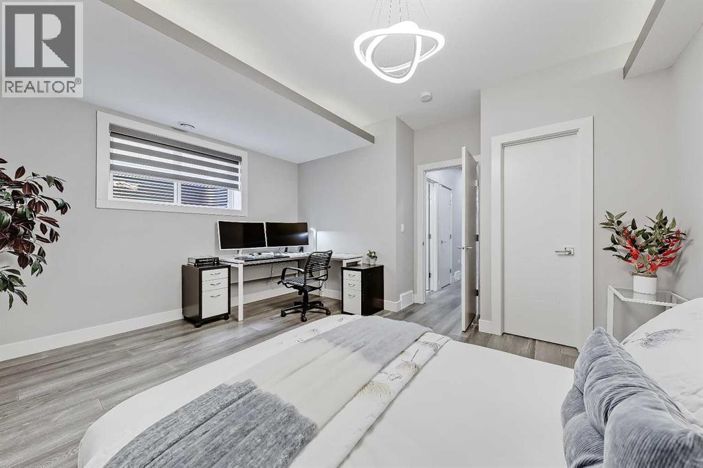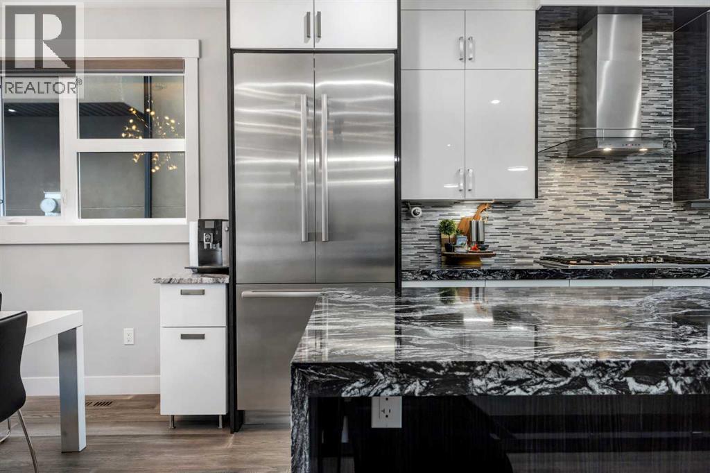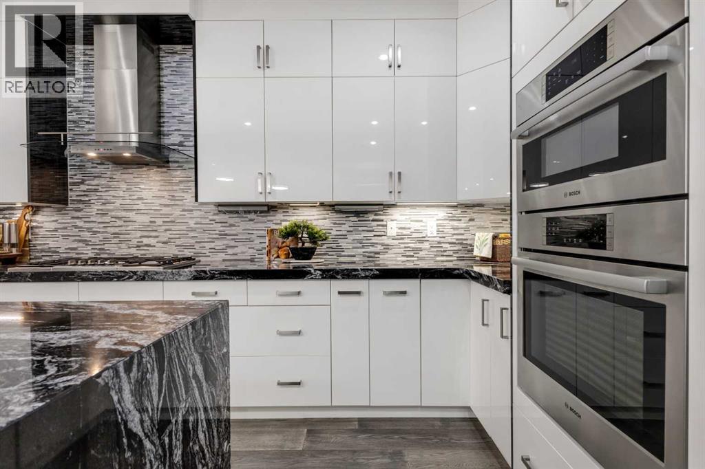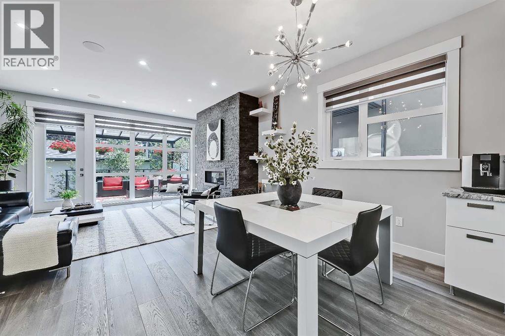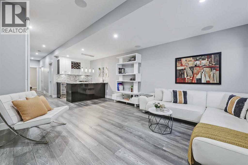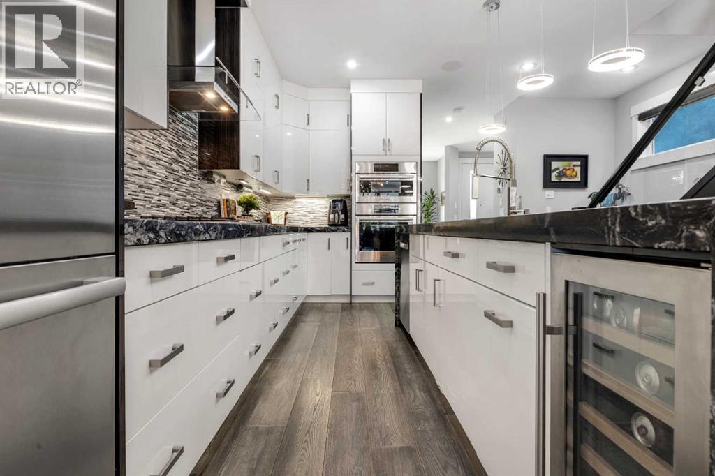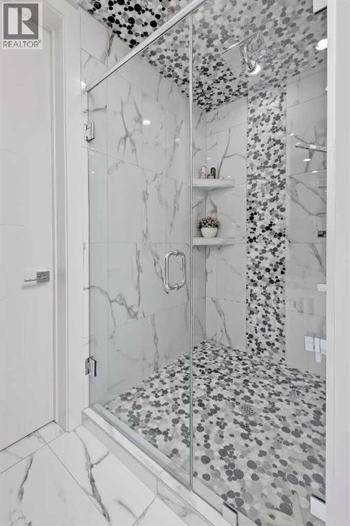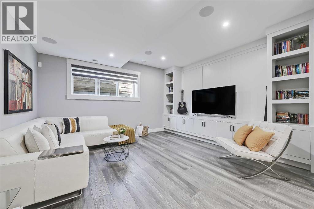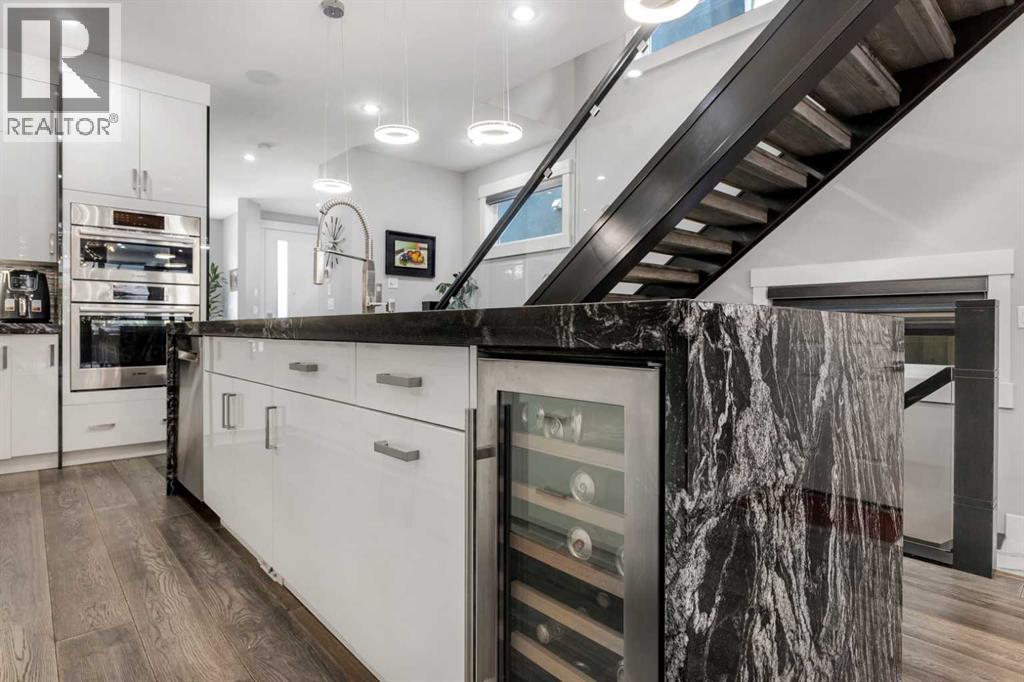 A PERGOLA-COVERED BACKYARD OASIS, a gourmet CHEF’S KITCHEN, and a private, fully finished basement with IN-FLOOR HEATING make this Shaganappi home truly one-of-a-kind. Designed for modern living with timeless style, it blends thoughtful updates with upscale finishes—engineered hardwood across all 3 levels, open riser stairs, a full-height stone fireplace, custom built-ins, and a serene primary retreat—all within steps of parks, schools, and the LRT. The welcoming foyer opens into a versatile front den—ideal as a home office, dining space, or quiet sitting room. Beyond, the kitchen showcases integrated BOSCH appliances: gas cooktop, built-in wall oven & microwave, stunning stainless steel hood fan, french door fridge and dishwasher all highlighted by MODERN high gloss cabinetry, and a waterfall island wrapped in stone. The adjacent living room feels elevated with its floor-to-ceiling stone fireplace and floating shelves, while large windows bring in natural light and frame views of the private yard. Outdoors, the pergola-topped deck transforms the backyard into a year-round retreat. Surrounded by mature trees, a manicured lawn, and finished with a double garage, this is a true extension of the living space. Upstairs, the primary suite impresses with a tray ceiling, expansive windows, and a full wall of custom shelving with media cabinetry. The spa-like ensuite features a freestanding tub, oversized tiled shower, dual vanity, and dedicated makeup desk. Two additional bedrooms, a full bathroom, and a convenient laundry room complete the upper level. The lower level is finished with in-floor heating throughout, offering a spacious family room with a sleek bar and island, and an oversized bedroom with a tray ceiling and ambient lighting that feels like a boutique hotel suite. Elegant barn doors at the stair entry enhance the sense of privacy, creating a sophisticated retreat within the home. Every detail has been considered—GROHE fixtures, custom closets, and an updated LED lighting package—to ensure both comfort and luxury. Set on a quiet street, the location is every bit as desirable as the home itself. Walk to Shaganappi Park with playground, off-leash area, and tennis courts, or enjoy nearby Shaganappi Point Golf Course, ball diamonds, and multiple playgrounds. Families will appreciate schools such as Alexander Ferguson, Sacred Heart, and Connaught, with Mount Royal University only minutes away. Commuting is effortless via the 26 Street LRT Station or major bus routes, and downtown is under 10 minutes by car. For dining, shopping, and lifestyle amenities, 17th Avenue, Westbrook Mall, the Killarney Aquatic Centre, and Westbrook Library are all nearby. With a Bike Score of 98 and Walk Score of 82, this address is as connected as it is charming. (id:53676)