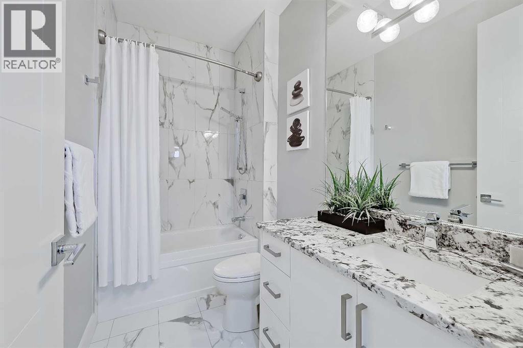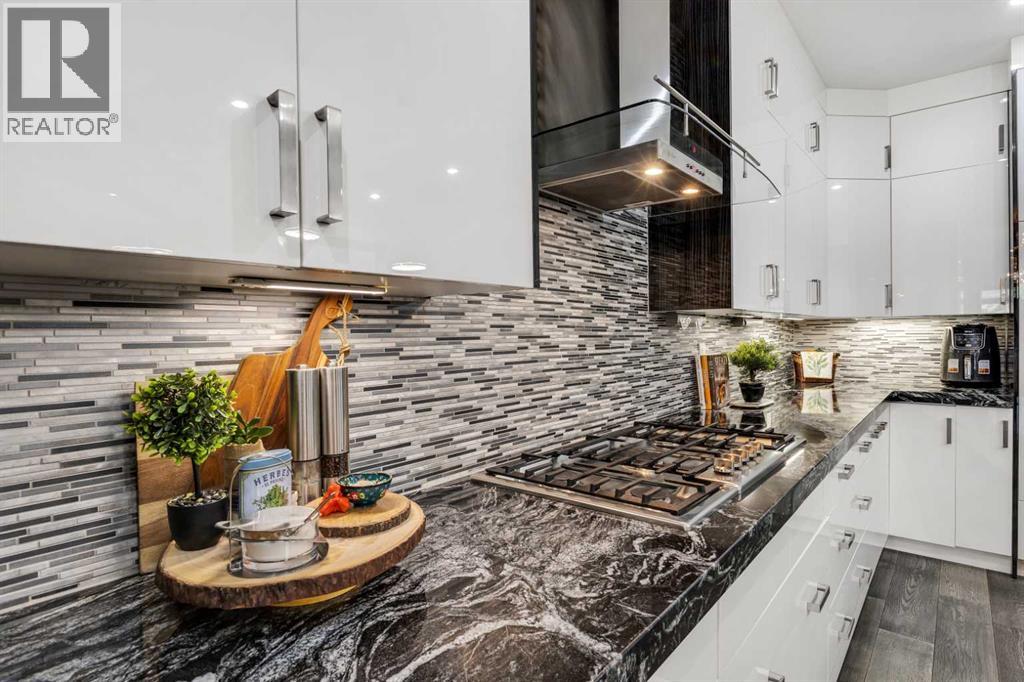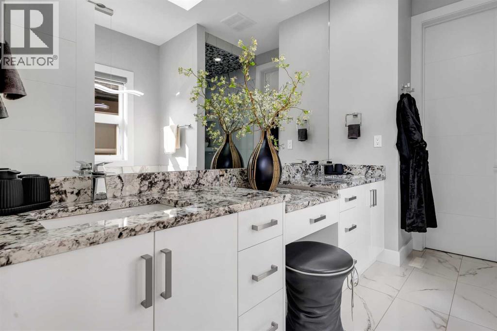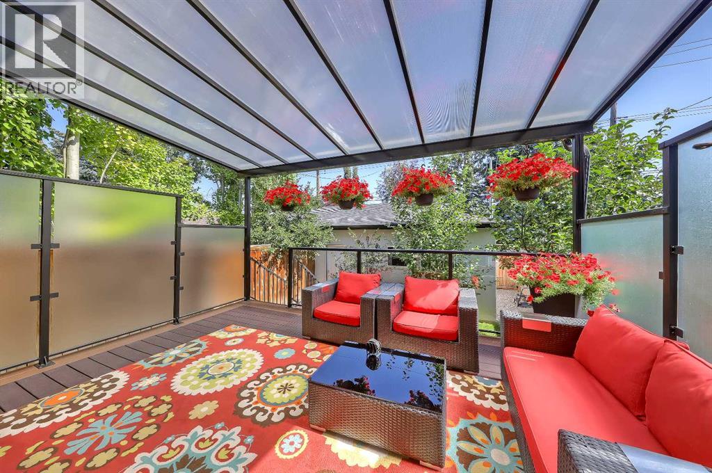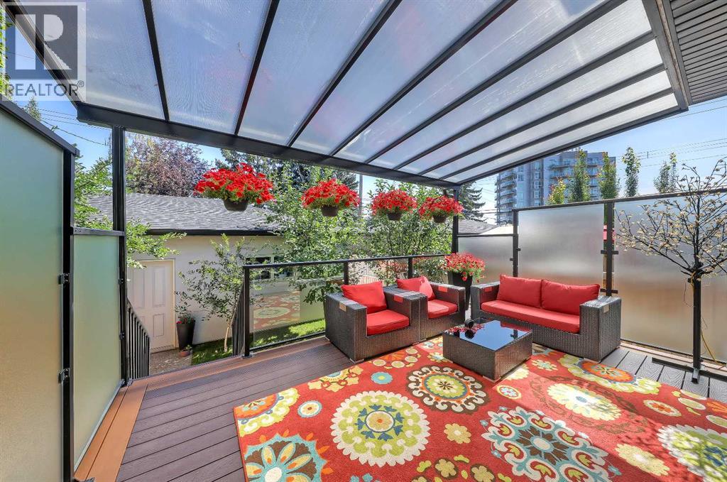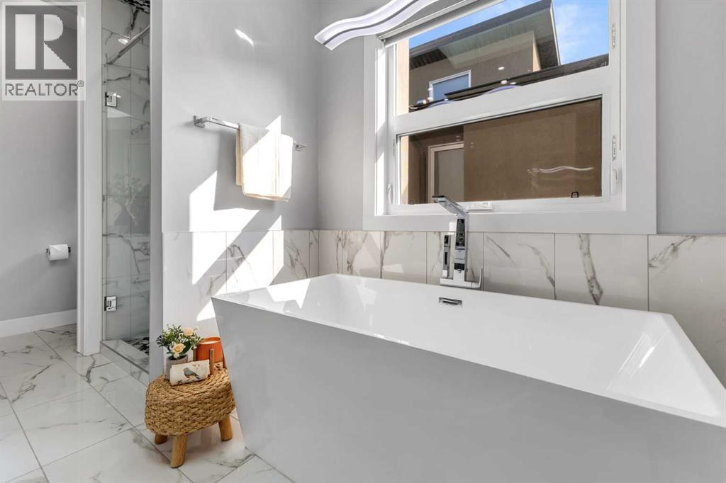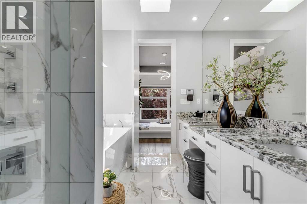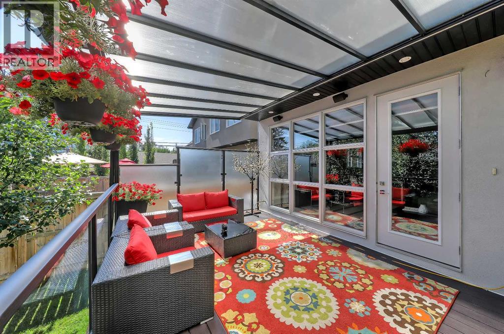 A PERGOLA-COVERED BACKYARD OASIS, a gourmet CHEF’S KITCHEN, and a private, fully finished basement with IN-FLOOR HEATING make this Shaganappi home truly one-of-a-kind. Designed for modern living with timeless style, it blends thoughtful updates with upscale finishes—engineered hardwood across all 3 levels, open riser stairs, a full-height stone fireplace, custom built-ins, and a serene primary retreat—all within steps of parks, schools, and the LRT. The welcoming foyer opens into a versatile front den—ideal as a home office, dining space, or quiet sitting room. Beyond, the kitchen showcases integrated BOSCH appliances: gas cooktop, built-in wall oven & microwave, stunning stainless steel hood fan, french door fridge and dishwasher all highlighted by MODERN high gloss cabinetry, and a waterfall island wrapped in stone. The adjacent living room feels elevated with its floor-to-ceiling stone fireplace and floating shelves, while large windows bring in natural light and frame views of the private yard. Outdoors, the pergola-topped deck transforms the backyard into a year-round retreat. Surrounded by mature trees, a manicured lawn, and finished with a double garage, this is a true extension of the living space. Upstairs, the primary suite impresses with a tray ceiling, expansive windows, and a full wall of custom shelving with media cabinetry. The spa-like ensuite features a freestanding tub, oversized tiled shower, dual vanity, and dedicated makeup desk. Two additional bedrooms, a full bathroom, and a convenient laundry room complete the upper level. The lower level is finished with in-floor heating throughout, offering a spacious family room with a sleek bar and island, and an oversized bedroom with a tray ceiling and ambient lighting that feels like a boutique hotel suite. Elegant barn doors at the stair entry enhance the sense of privacy, creating a sophisticated retreat within the home. Every detail has been considered—GROHE fixtures, custom closets, and an updated LED lighting package—to ensure both comfort and luxury. Set on a quiet street, the location is every bit as desirable as the home itself. Walk to Shaganappi Park with playground, off-leash area, and tennis courts, or enjoy nearby Shaganappi Point Golf Course, ball diamonds, and multiple playgrounds. Families will appreciate schools such as Alexander Ferguson, Sacred Heart, and Connaught, with Mount Royal University only minutes away. Commuting is effortless via the 26 Street LRT Station or major bus routes, and downtown is under 10 minutes by car. For dining, shopping, and lifestyle amenities, 17th Avenue, Westbrook Mall, the Killarney Aquatic Centre, and Westbrook Library are all nearby. With a Bike Score of 98 and Walk Score of 82, this address is as connected as it is charming. (id:53676)