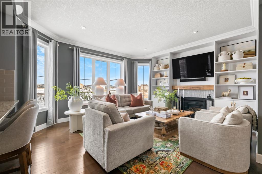 This exceptional executive two-storey walkout home offers over 3,000 sq. ft. of fully developed living space and backs onto a beautiful green space and a scenic pond which provides peaceful views and breathtaking sunsets. A spacious entryway welcomes you inside, where a bright flex room behind French doors creates the perfect home office or reading space. The main level features a sun-filled living room with west-facing windows, a cozy gas fireplace, and custom built-ins.The open-concept kitchen is designed for both everyday living and entertaining, showcasing a large granite island, ceiling-height cabinetry, stainless steel appliances, and recessed lighting. Step onto the oversized upper deck with a gas line for BBQ, perfect for enjoying the tranquil pond views. Upstairs you’ll find a spacious bonus room, upper-level laundry with a linen closet, and three generous bedrooms. The primary suite offers a walk-in closet and a spa-inspired ensuite with double vanities, a soaker tub, and a steam shower. Two additional bedrooms and a full bathroom complete the upper floor. The fully developed walkout basement adds incredible living space with a large recreation area and wet bar, an additional bedroom, full bathroom, and a bright sunroom with hot tub. There is direct access to walking paths along the pond and green space.Additional highlights include solar panels, air conditioning, a heated garage, irrigation system, permanent Govee exterior lighting, and concrete side stairs for convenient access. Ideally located close to parks, walking paths, a skate park, and pickleball courts. This home offers the perfect blend of space, comfort, and lifestyle. (id:53676)