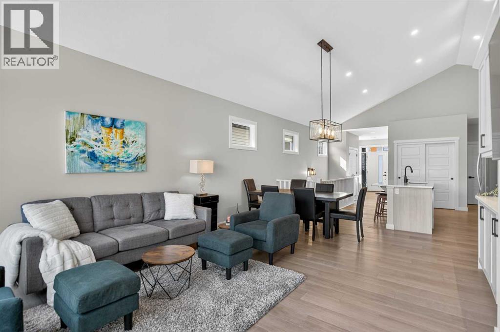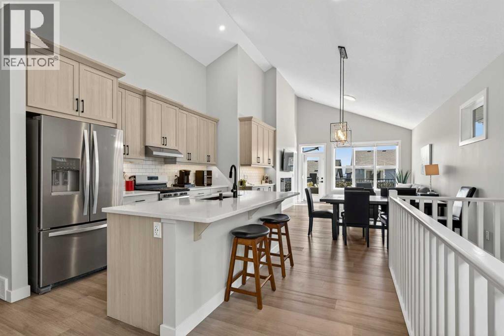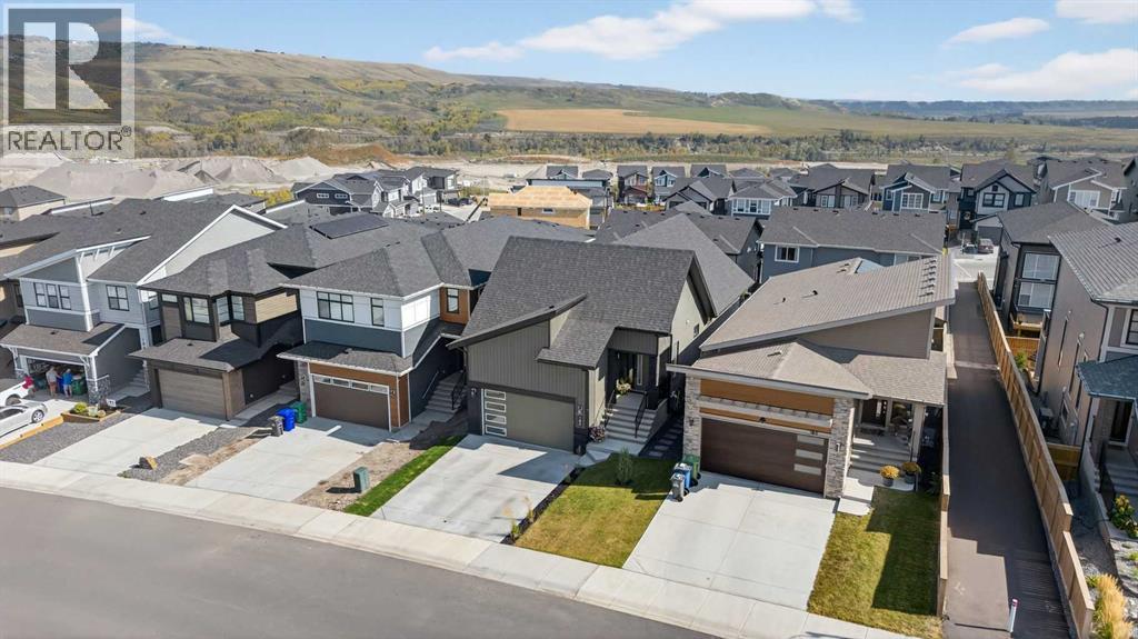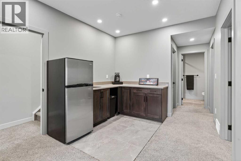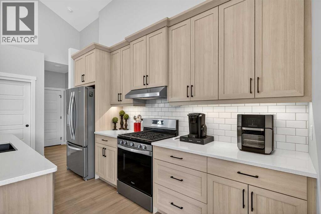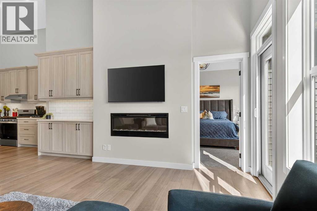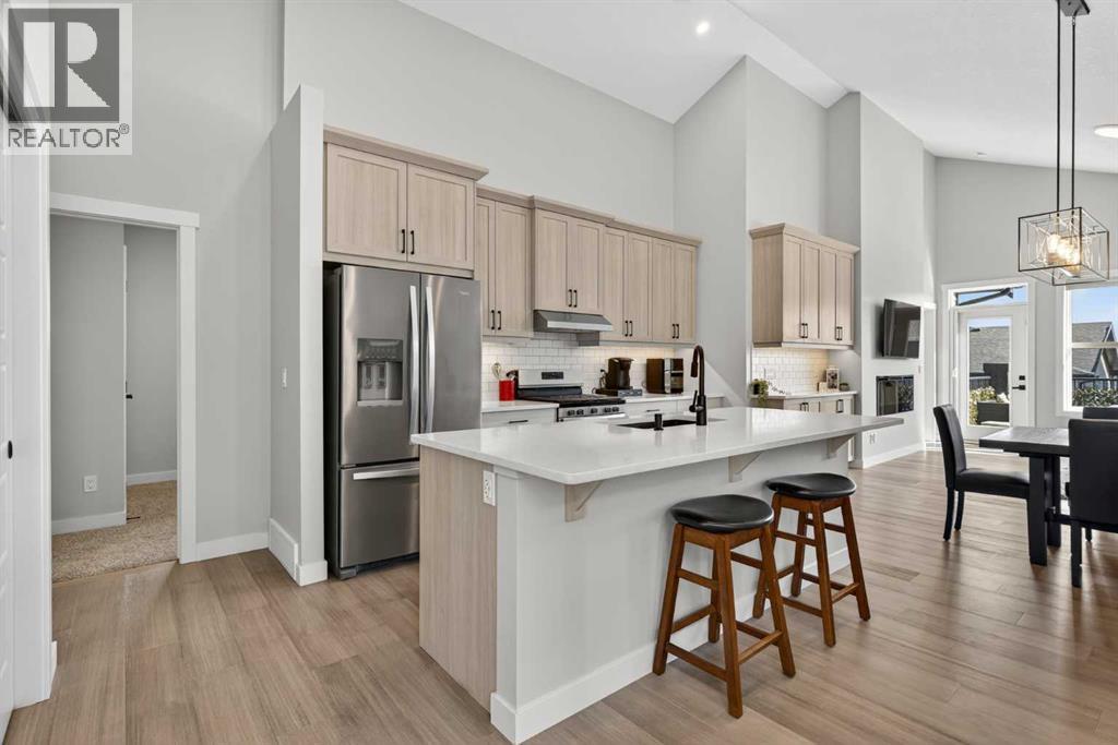 Your NEW HOME awaits.... Stunning 2024 Trico Homes Wynwood 28 Vaulted Ceiling Bungalow with finished Walkout Basement Development by Basement Builders in Scenic Precedence area. This beautifully designed bungalow combines comfort, style, and breathtaking views in one exceptional package. As you step through the front door, you are WELCOMED into the heart of the HOME greeted by soaring VAULTED CEILINGS and an open, light-filled floor plan. The kitchen is a delight to cook in with a large island, gas range, and tall cabinetry with quartz countertops, and pantry. Continuing on the main level is the dining area, and living room with electric fireplace and flatscreen TV making this the perfect space for both everyday living and entertaining. Finishing off this level is the Vaulted Primary Bedroom with 5 piece ensuite with SPECTACULAR walk in shower, walk in closet, second bedroom/office, main bathroom, and laundry room. Another added bonus off the living room is the 10 by 14 deck with gas BBQ hook-up which overlooks the landscaped backyard and North East views of the Cochrane Hills, PLUS a double attached garage with high ceilings.Head downstairs to the beautifully fully finished walkout basement offering even more living space that has been thoughtfully designed for relaxation, entertainment or a man cave. A massive family room centres around a striking floor-to-ceiling stone gas fireplace with mantle, and 75 inch big screen TV with SURROUND SOUND. There are so many added BONUSES including a large BAR area making this level perfect for hosting gatherings. Finishing off the basement you will find two additional bedrooms and 4 piece bathroom plus utility room. The walkout door leads to a covered patio with beautifully landscaped yard, extending the living space outdoors, plus electric hook up for a future hot tub area.This HOME BLENDS a thoughtful layout with high-end finishes and stunning surroundings, making this bungalow the best of both worlds! A retreat lik e setting with easy access to Cochrane’s amenities, schools, and scenic trails. Whether you are entertaining friends or enjoying quiet evenings on the deck, this home truly has it all. DO NOT WAIT... make this HOME yours TODAY! (id:53676)