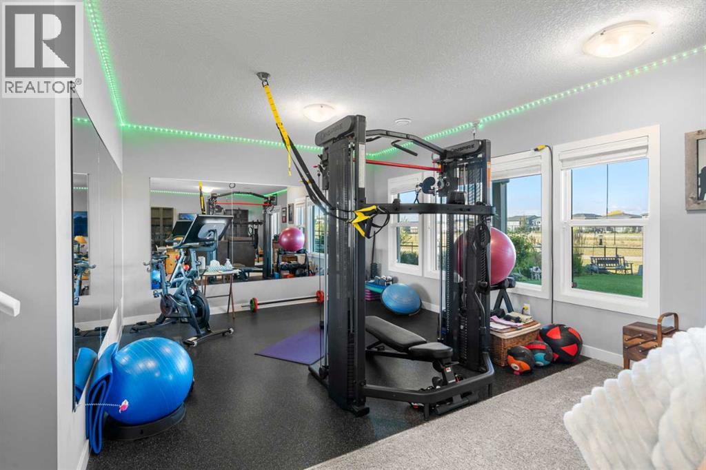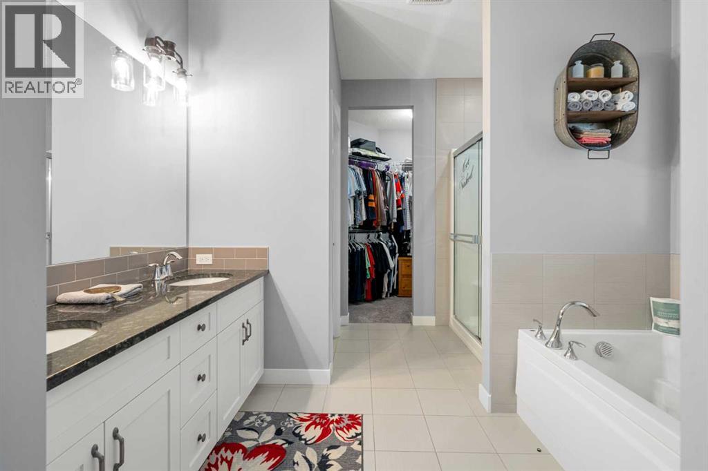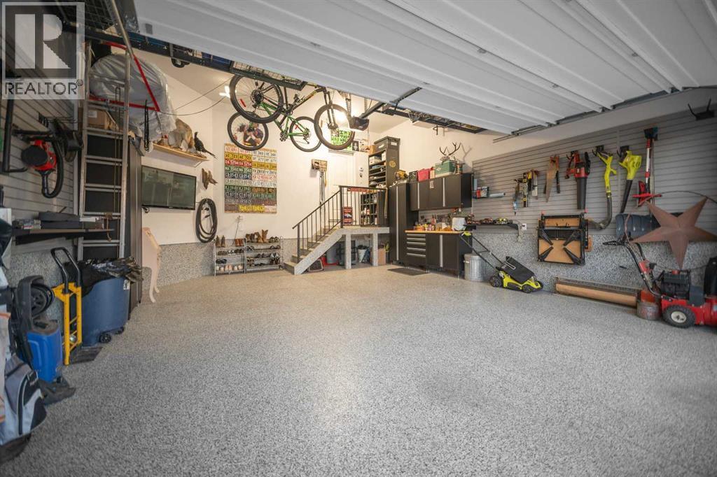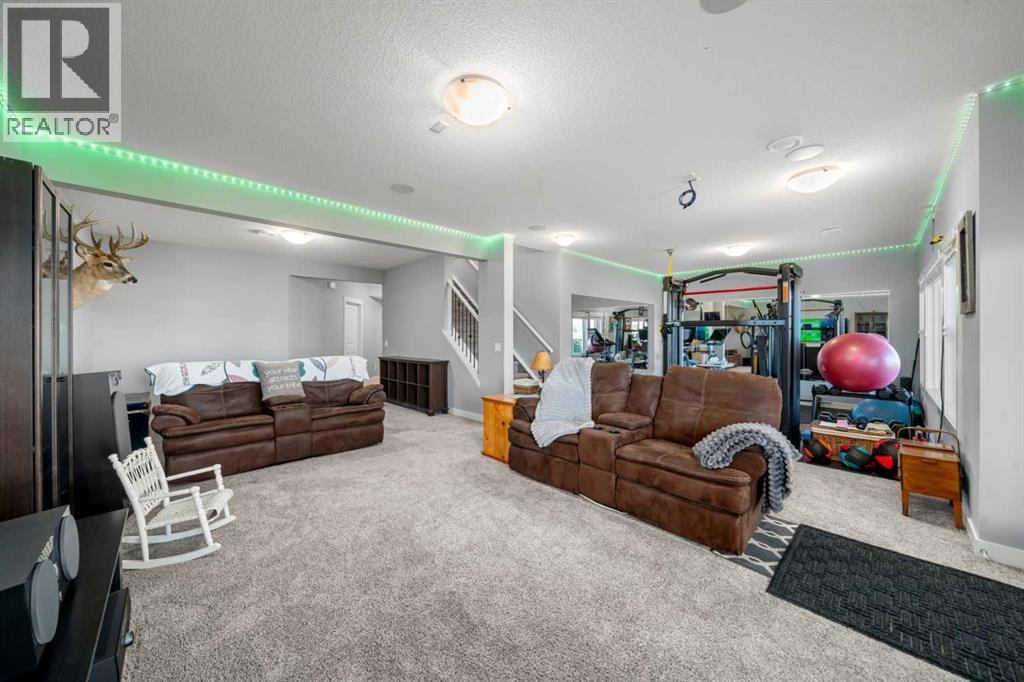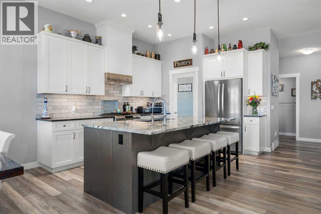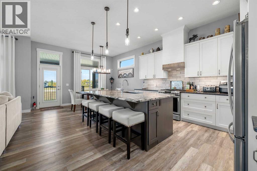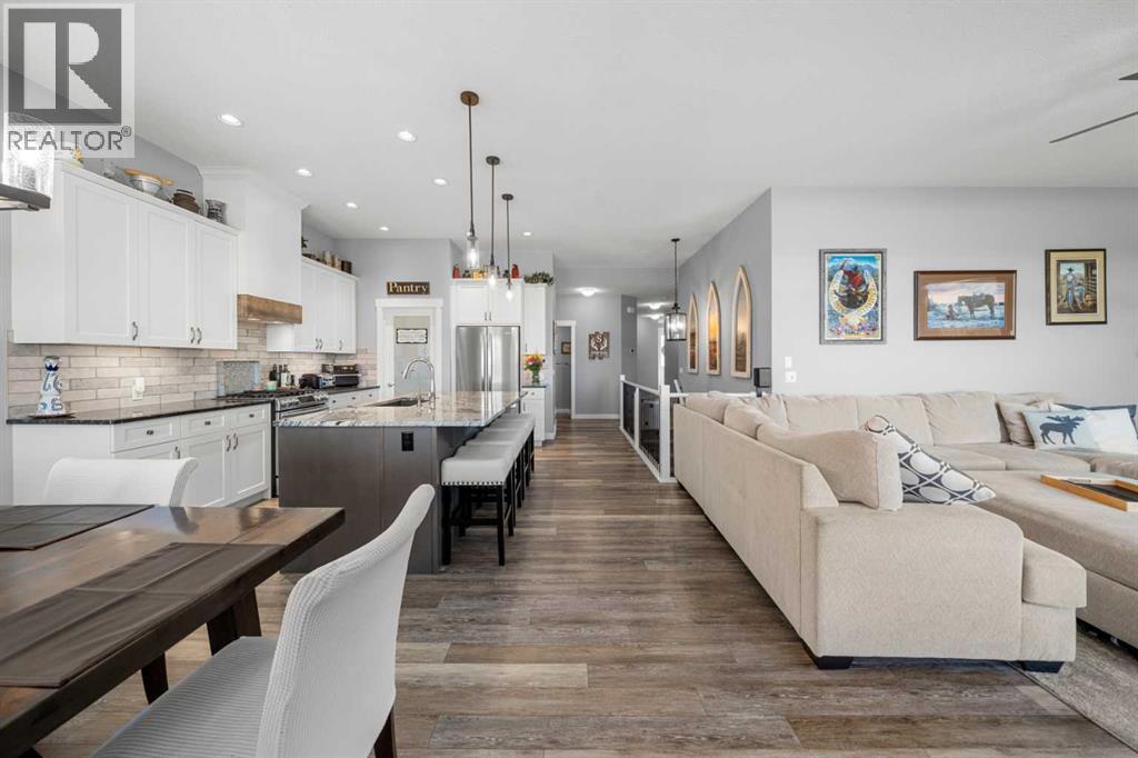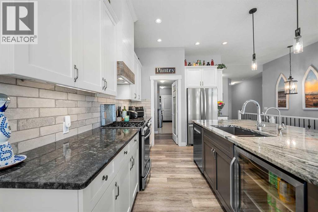 Gorgeous upgraded walkout 3 bedroom bungalow backing onto greenspace with great mountain views. This beautiful home has central air conditioning, epoxy flooring in a heated oversized garage, underground sprinklers, amazing landscaping, a full width deck with a gazebo and remote control screens, gemstone lighting and many other upgrades. As you drive up to the property you will love the low maintenance front yard and the great curb appeal on this home. Inside you will find beautiful LVP flooring, high ceilings and a fabulous layout. This home was designed to take full advantage of the west facing views, featuring huge windows throughout the back of the property, providing tons of natural light and allowing you a great view of our awesome sunsets. The spacious living room has a gas fireplace - making it a great place to relax after a long day! Entertain in the large dining room or step out side onto the massive deck and then you can choose whether to sit in the covered, screened area or be out in the open enjoying your BBQ! The kitchen is stunning and features a huge granite island with room for 4 bar stools, stainless steel appliances, including a gas stove, extended height white cabinets and a walkthrough pantry. The laundry room has a lovely barn wood counter above the washer and dryer, a sink with granite counter, drink fridge and a useful built in storage bench. The spacious master bedroom has a walk in closet and features a beautiful barn wood door leading to the 5 piece ensuite with large shower, soaker tub and dual sinks with granite counter. Completing this level is a half bathroom. In the fully finished walkout basement there is a large family/games room with built in speakers and lots of natural light from the large windows. There is a gym area with rubber flooring and mirrors - perfect for the fitness enthusiast or for a children's play area. There are 2 large bedrooms both with great sized closets and a 3 piece bathroom with a large shower. The furnace ro om has lots of storage with built in shelving. Did I mention this home has a water softener, a reverse osmosis system for your drinking water and gemstone lights both front and back? The yard has beautiful landscaping and includes a large concrete pad outside of the walkout basement, a paved patio area, a gravel firepit area, underground sprinklers and beautiful flower beds and trees. The 22x24ft heated garage features high ceilings, epoxy flooring, slat walls, tire rack and a bicycle pulley system - a garage to be proud of! This home is stunning and should be viewed to be appreciated! View 3D tour/Multi Media/virtual tour. (id:53676)