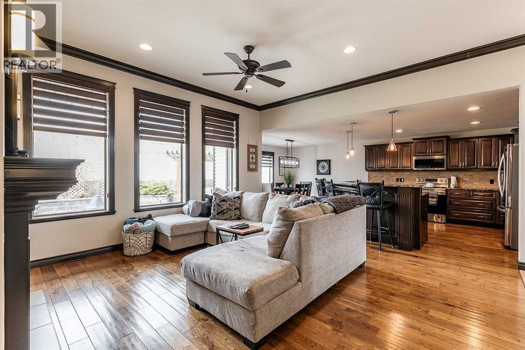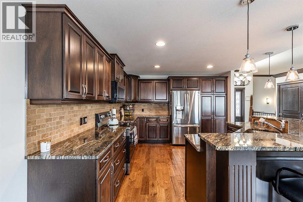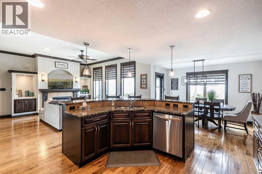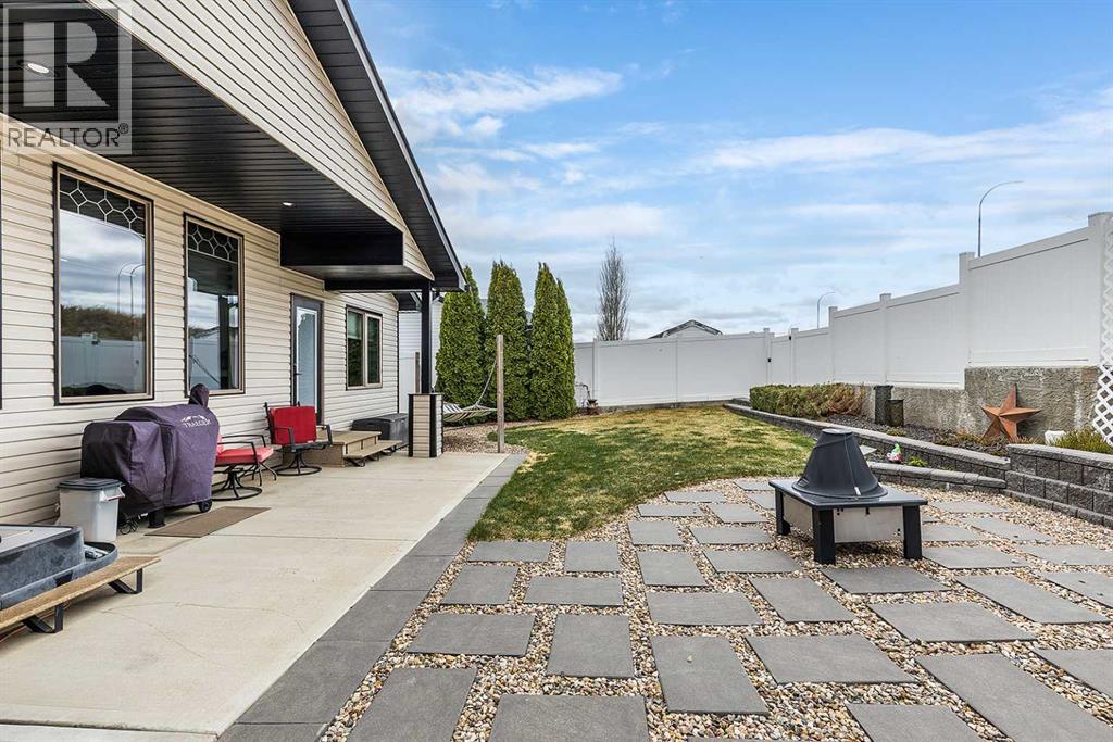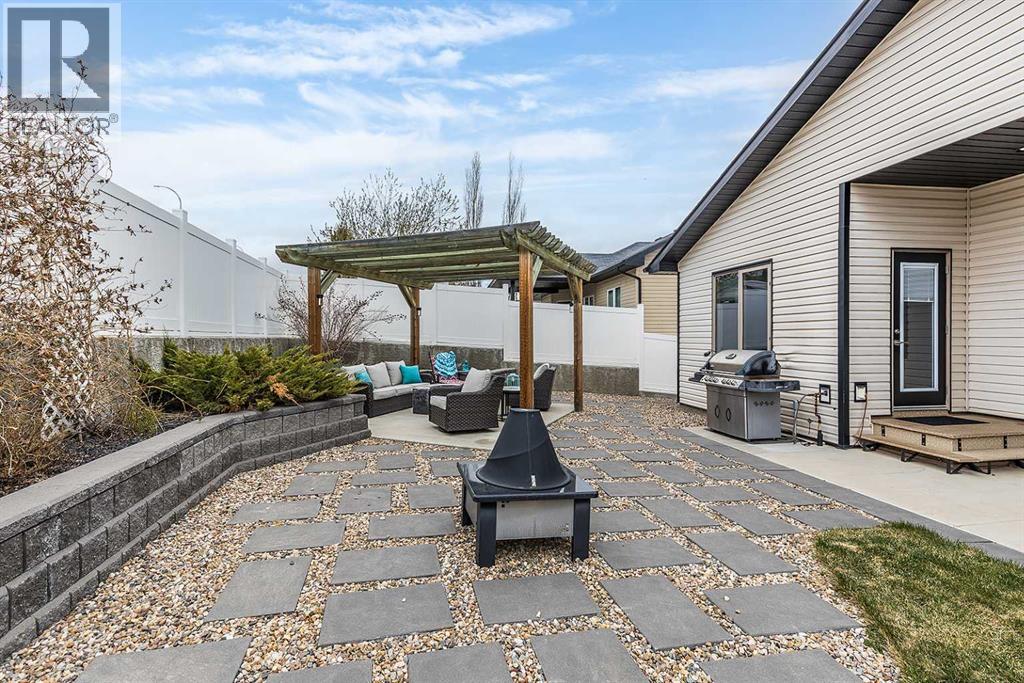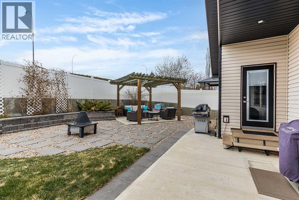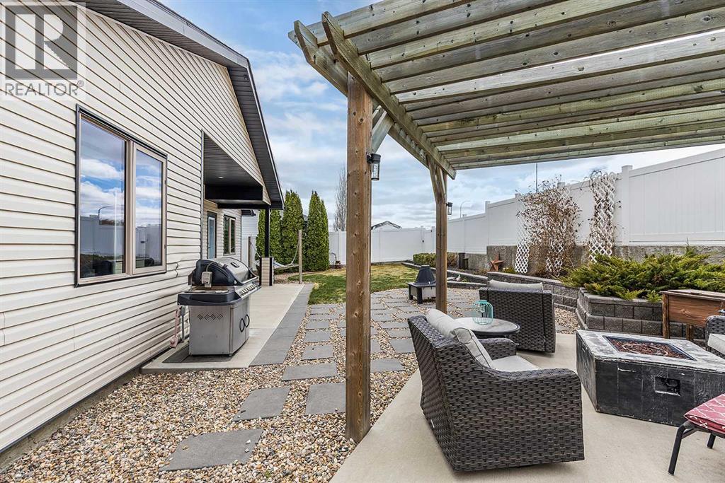 Welcome to this beautifully appointed executive bungalow showing true pride of ownership and quality throughout tucked away in the beautiful Ranchlands neighbourhood. With no neighbours behind there is exceptional privacy, and a peaceful yard to enjoy year-round. The main floor features a bright, open-concept layout with hardwood floors, large windows, a cozy gas fireplace, coved ceilings and an abundance of natural light. The spacious kitchen has loads of cabinets with granite countertops-it flows seamlessly into the dining and living areas, offering direct access to the outdoor living space. Also on the main level- a private primary suite with 3pce ensuite with a 5' shower and a walk-in closet, a second bedroom or dedicated office/den, laundry, a 4pce main bathroom. The fully developed lower level features a large recreation room with 3 generous bedrooms (two with walk-in closets), a full 4 pc bathroom. This home offers exceptional space, storage and flexibility for families or guests. Professionally landscaped yard is a dream with a gas line for BBQ, fire-pit (gas fed), pergola, and backing onto walking paths with a tall vinyl fence and concrete curbing giving great privacy. The over sized garage is finished and heated with cabinets. Surrounded by attractive custom homes, this is a rare opportunity to enjoy executive living in one of Medicine Hat’s most scenic settings. (id:53676)