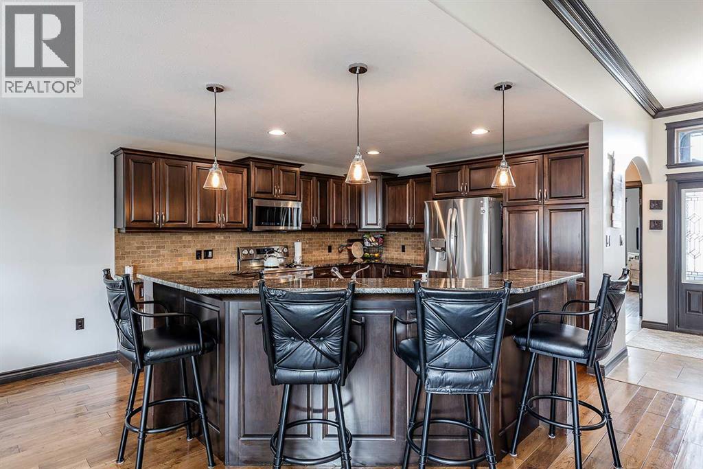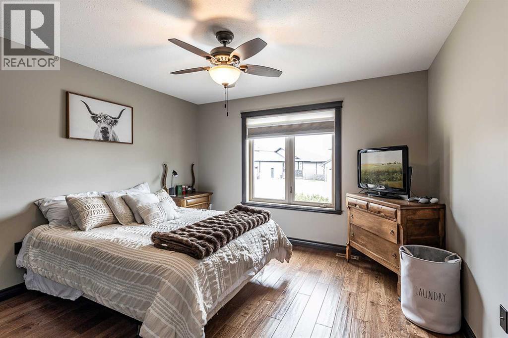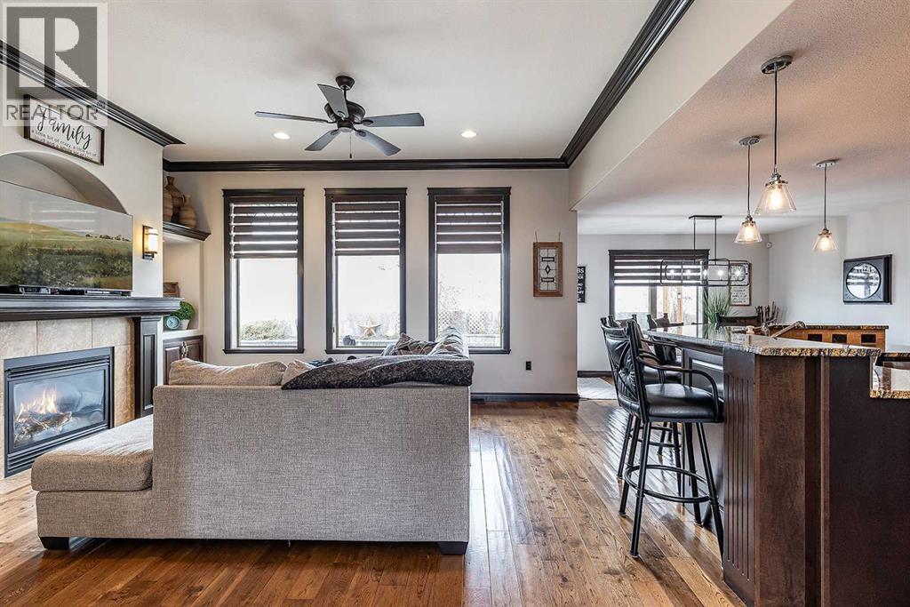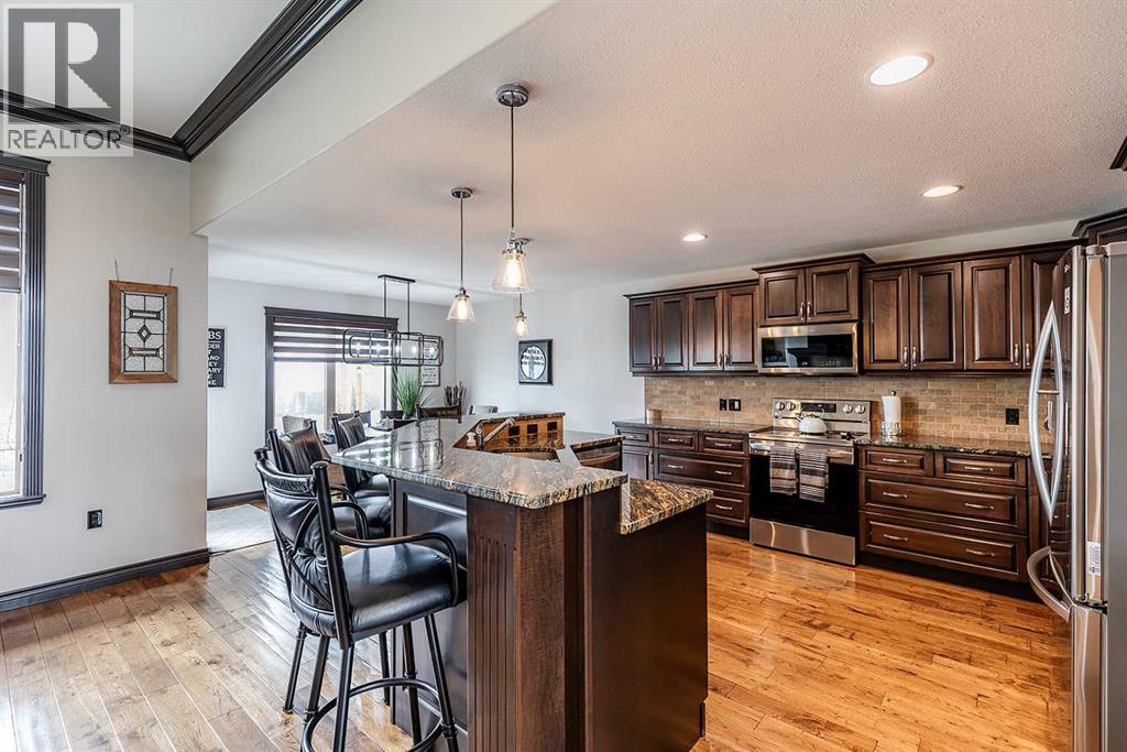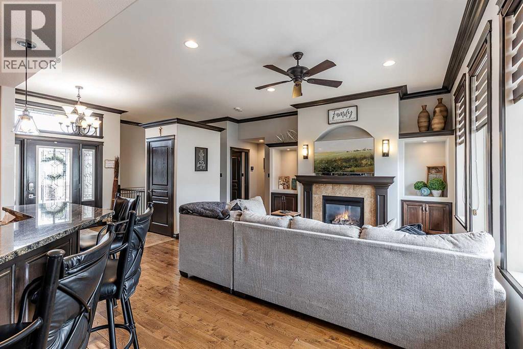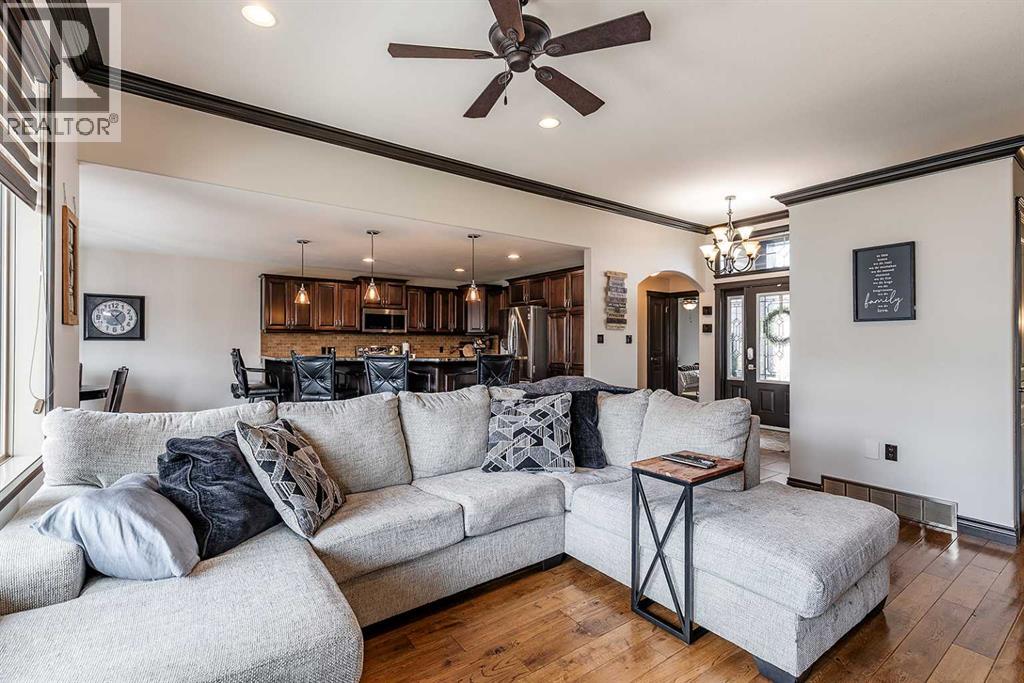 Welcome to this beautifully appointed executive bungalow showing true pride of ownership and quality throughout tucked away in the beautiful Ranchlands neighbourhood. With no neighbours behind there is exceptional privacy, and a peaceful yard to enjoy year-round. The main floor features a bright, open-concept layout with hardwood floors, large windows, a cozy gas fireplace, coved ceilings and an abundance of natural light. The spacious kitchen has loads of cabinets with granite countertops-it flows seamlessly into the dining and living areas, offering direct access to the outdoor living space. Also on the main level- a private primary suite with 3pce ensuite with a 5' shower and a walk-in closet, a second bedroom or dedicated office/den, laundry, a 4pce main bathroom. The fully developed lower level features a large recreation room with 3 generous bedrooms (two with walk-in closets), a full 4 pc bathroom. This home offers exceptional space, storage and flexibility for families or guests. Professionally landscaped yard is a dream with a gas line for BBQ, fire-pit (gas fed), pergola, and backing onto walking paths with a tall vinyl fence and concrete curbing giving great privacy. The over sized garage is finished and heated with cabinets. Surrounded by attractive custom homes, this is a rare opportunity to enjoy executive living in one of Medicine Hat’s most scenic settings. (id:53676)
