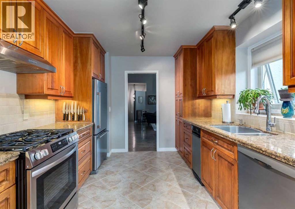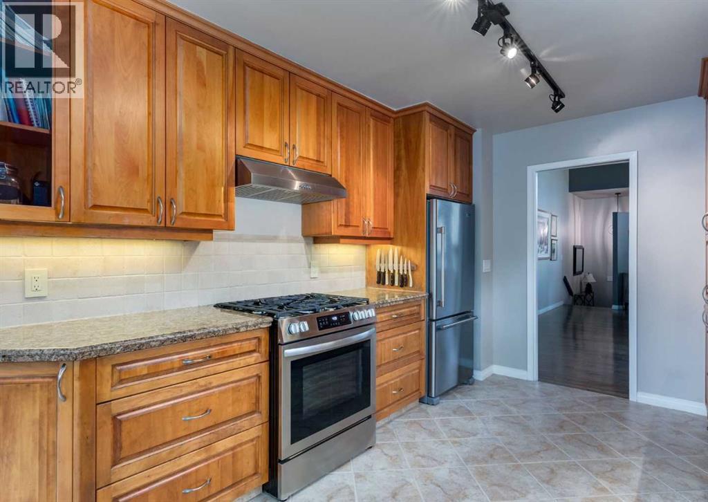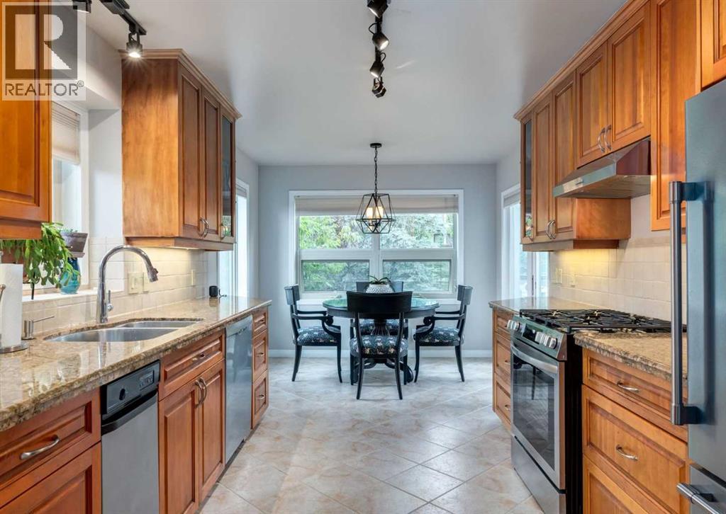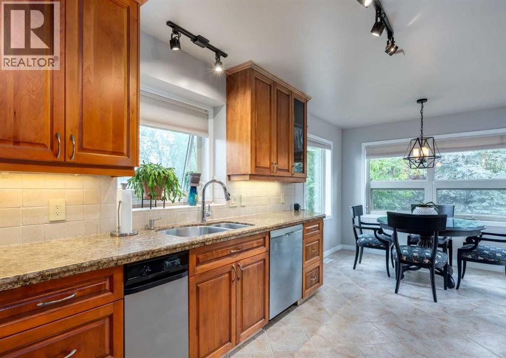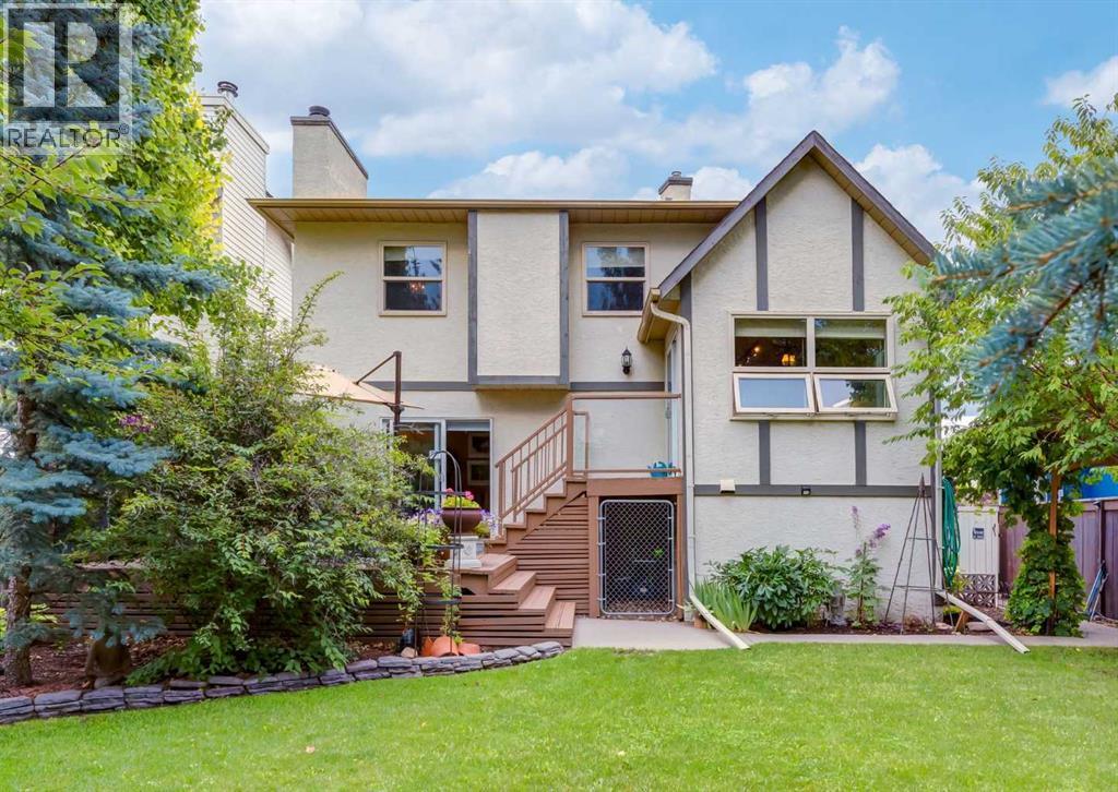 Welcome to this exceptional 2-storey split character home, ideally located on a quiet street in the heart of Strathcona Park. Backing directly onto a beautiful park with mature trees and established landscaping, this lovingly maintained property offers the perfect balance of privacy, elegance, and everyday comfort—close to top-rated public and private schools. From the moment you arrive, you’ll be captivated by the stunning curb appeal and the meticulously landscaped, southwest-facing backyard oasis—perfect for families, entertaining, or simply enjoying the outdoors. Step inside the spacious foyer and up into the expansive living room where soaring vaulted ceilings with elegant decorative mouldings and floor-to-ceiling windows fill the space with natural light. This open-concept great room with hardwood flooring offers both a warm living area and a generous dining space—ideal for family dinners or special celebrations. The beautifully updated kitchen features rich cabinetry, gleaming granite countertops, newer stainless steel appliances, and tile floors. Adjacent to the kitchen is a sun-soaked breakfast nook surrounded by windows overlooking the private backyard and the park beyond. From here, step out onto a large two-tiered deck, creating a seamless indoor-outdoor living experience. Just a few steps down, the cozy family room invites you to relax with a wood burning fireplace nestled between custom built-in entertainment units and patio doors with direct access to the lower deck. This level also includes an updated 2-piece powder room, a convenient laundry area, and access to the double attached garage. Upstairs, the oversized primary suite is a true retreat, featuring a bay window, barn door to a walk-in closet, and a beautifully renovated ensuite with dual sinks, quartz vanity, tile flooring, and a separate shower. Two additional bedrooms and a full 4-piece bath complete the upper level. The lower level offers fantastic extra space for the whole family, includin g a large recreational room/games room/media and a spacious storage/utility room with walk-up access to the backyard. This home has been extensively updated with windows replaced and all Poly-B plumbing removed, ensuring peace of mind and long-term value. Pride of ownership shines throughout. Located in one of Calgary’s most desirable west-side communities, Strathcona Park offers excellent access to schools, playgrounds, shopping, the LRT, Westside Rec Centre, and a quick escape to the mountains. A rare opportunity to own a truly unique and beautifully maintained family home in a picture-perfect setting. Click on media for the video and book your private viewing today! (id:53676)