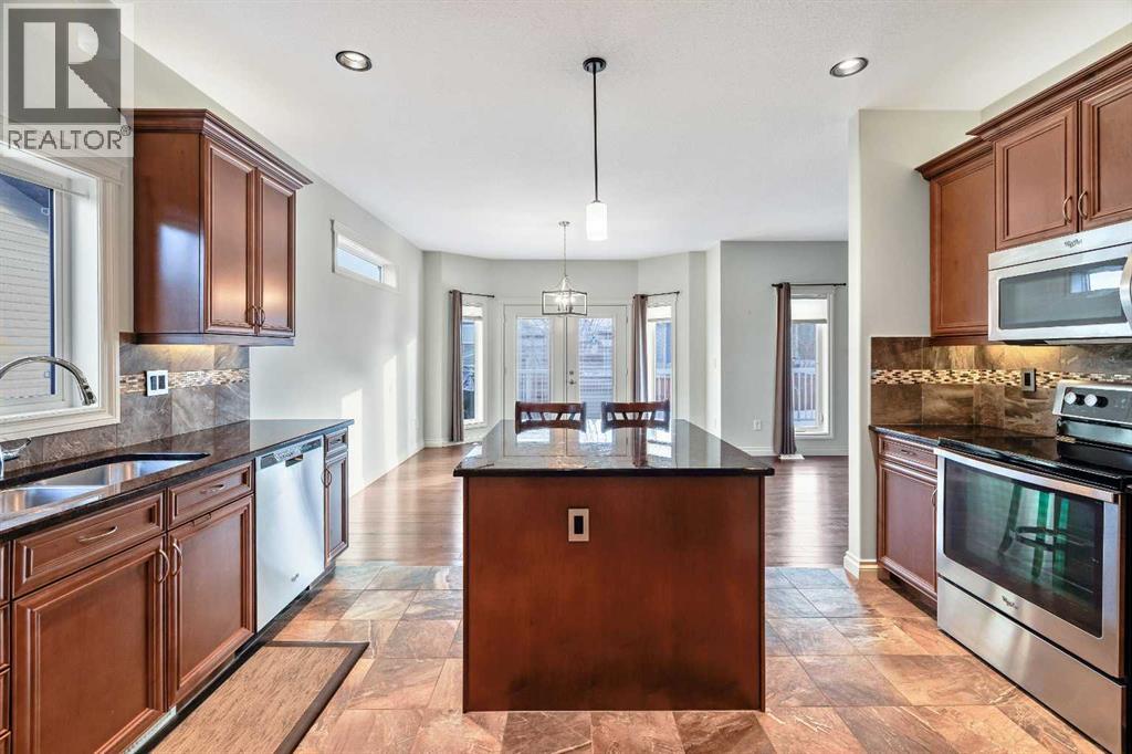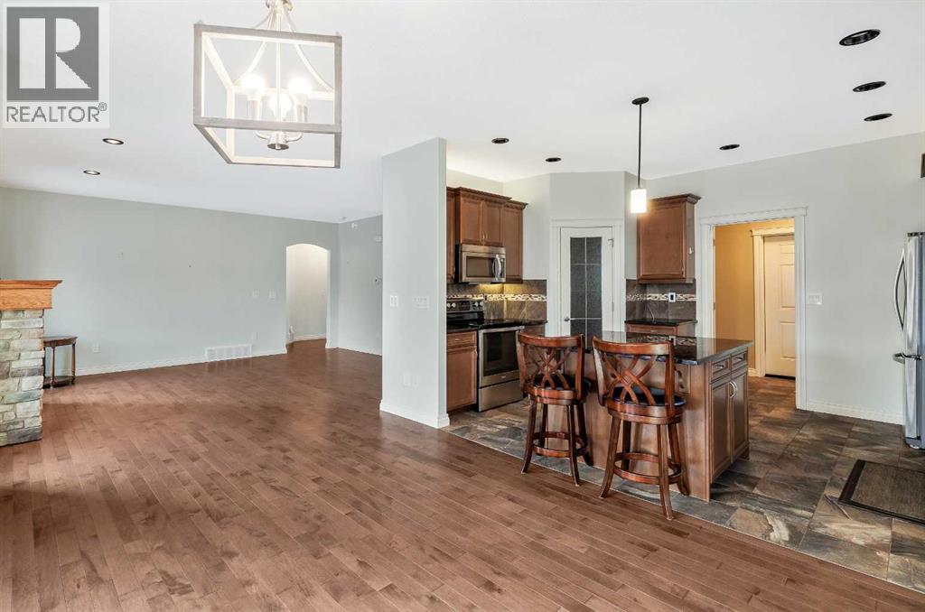 PRICE REDUCED- Step in to this warm and welcoming raised bungalow featuring an open concept main floor designed for modern living' spacious living room showcases a stunning stone faced natural gas fireplace and gleaming hardwood flooring , flowing in to a large kitchen complete with granite countertops abundant cabinetry including pot drawers, walk in pantry, and an island perfect for gathering. The adjacent dining area easily accommodates a large family table. Garden doors lead to an east facing deck, professionally landscaped and fenced backyard-ideal for entertaining or relaxing outdoors. The primary bedroom is generously sized for a king bed and offers a walk in closet and a 3 piece ensuite with large walk in shower. A second west facing bedroom , 4 piece guest bathroom , main floor laundry with direct access to the garage complete the main level. The fully developed lower level provides an expansive family and games area. Bright comfortable, and made extra cozy thanks to the in floor heating system. Two additional bedrooms (one with a walk in closet) and 3 piece bath offers plenty of space for family or guests. Loads of storage under the steps and in the mechanical room. Car enthusiasts or hobbyists will love the oversized insulated double car garage with in floor heat and high ceilings plus hot and cold water taps. Outside enjoy the front deck the perfect spot to enjoy an Alberta sunset. Additional features on this home include central air conditioning, permanent outdoor lighting along the eaves, (that can be controlled with your smart phone, new (2025) on demand hot water and gas outlet on back deck for your BBQ. This home is move in ready. Book your showing today. (id:53676)