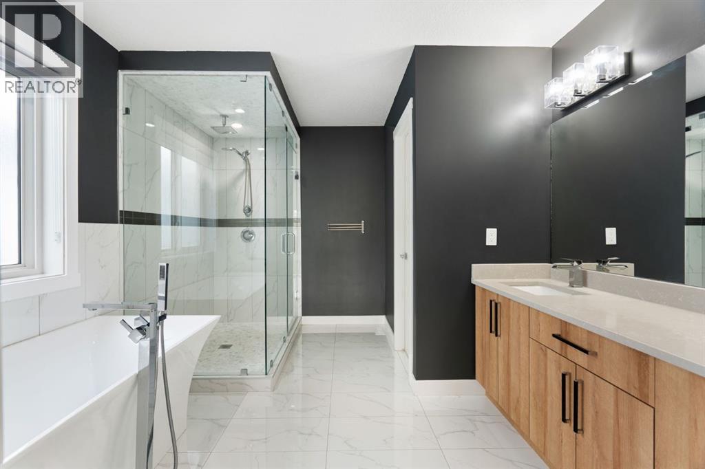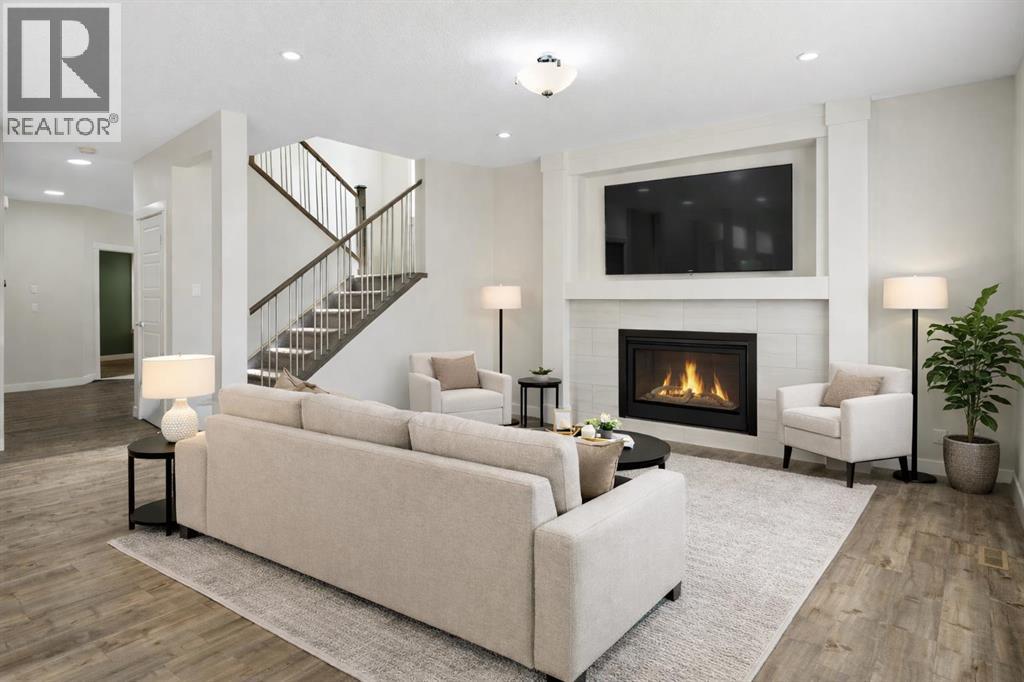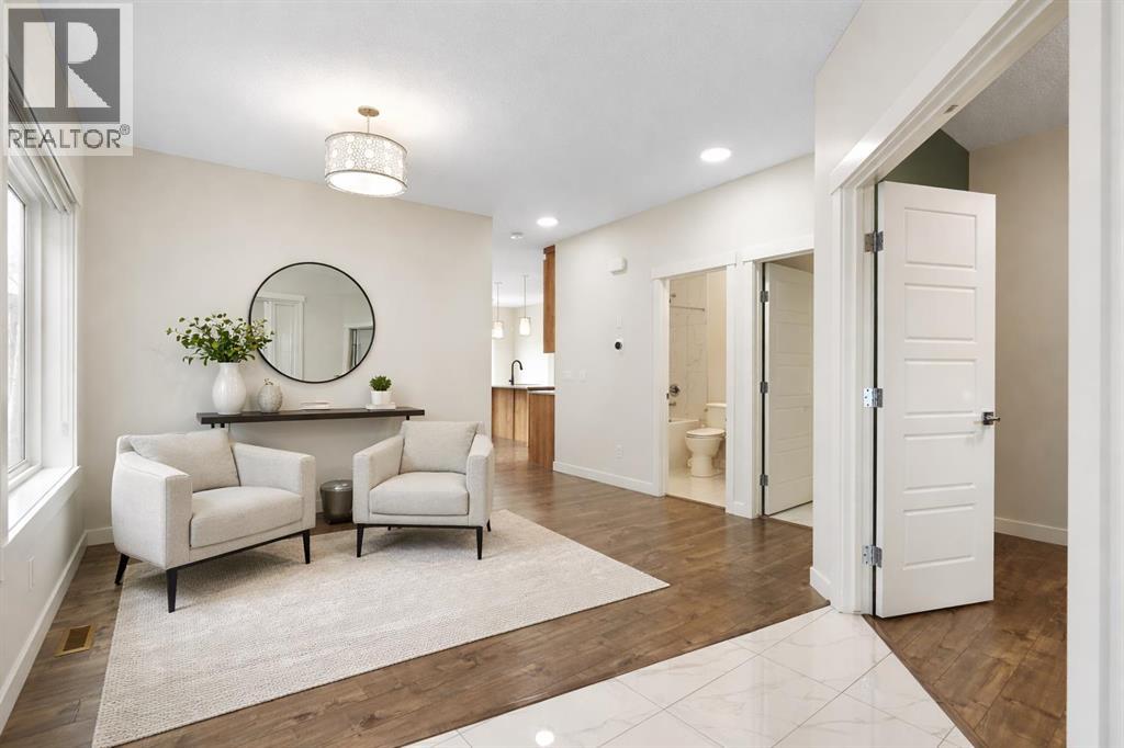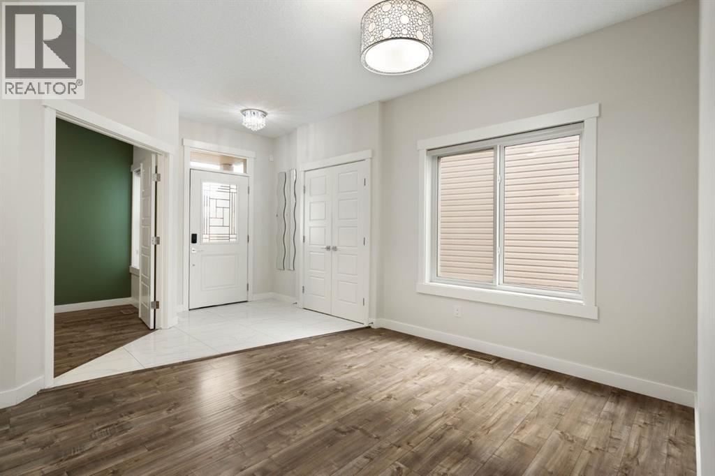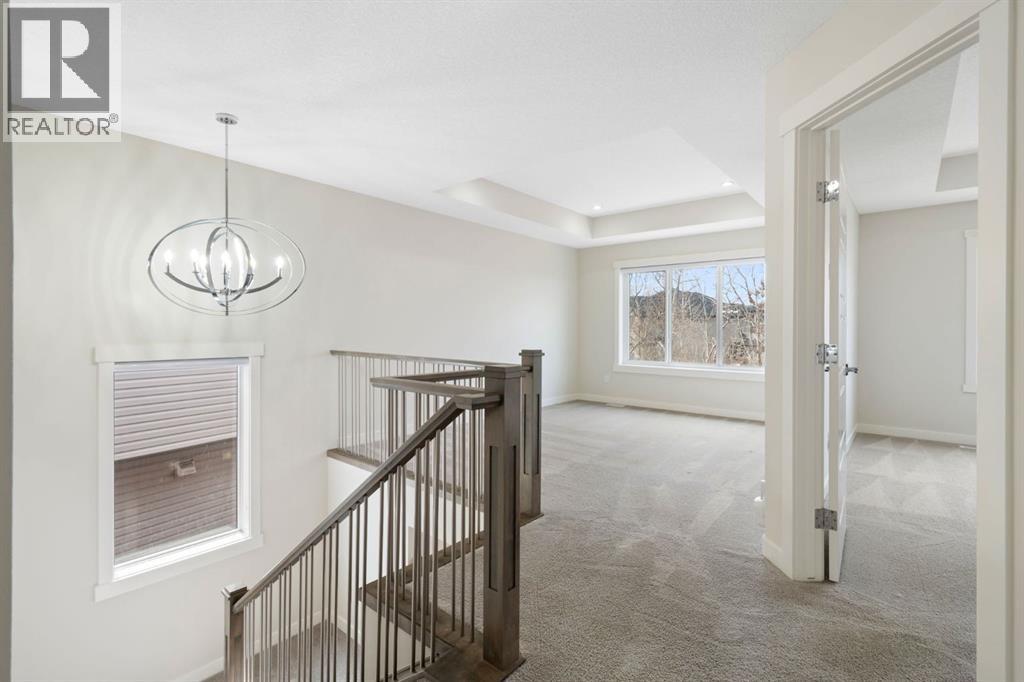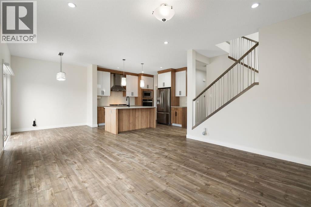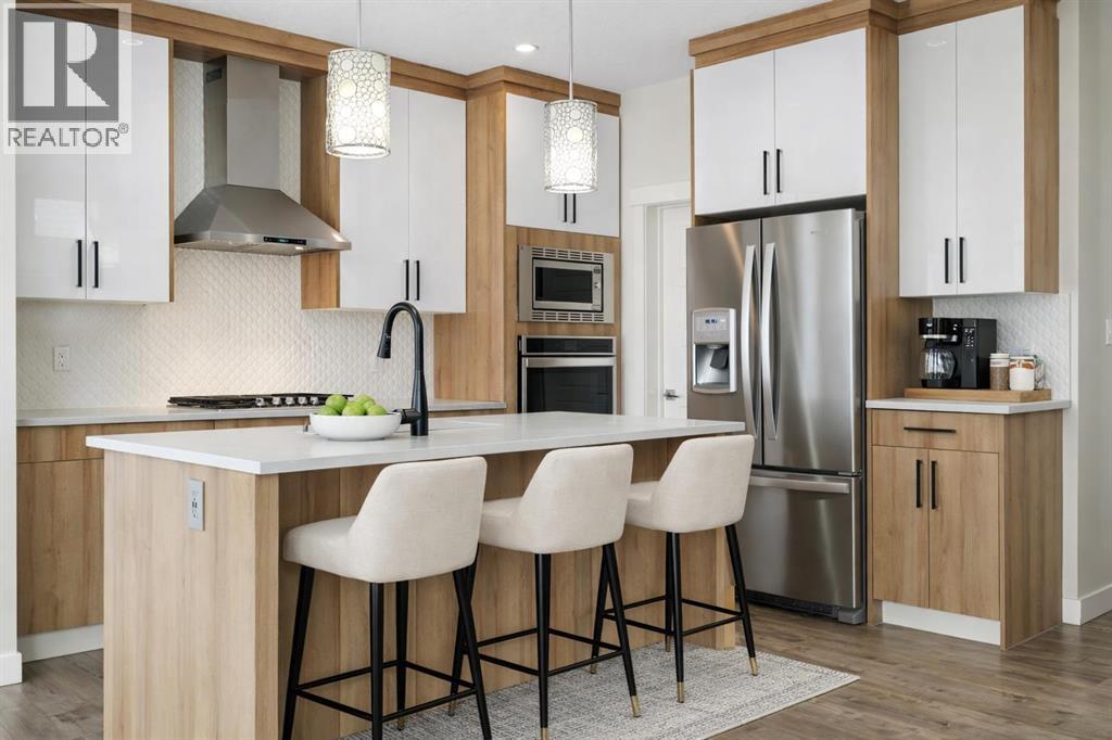 Backing onto a private treed reserve with a west-facing backyard, this Walden home delivers the rare combination of natural privacy and expansive interior space that families are often forced to choose between. Offering over 2,500 sq ft above grade, this thoughtfully designed home includes five bedrooms, a bonus room, and a walkout basement with a separate entrance—ideal for growing families who need both function and flexibility.The main floor makes an immediate impression with a welcoming foyer and built-in sitting area. A main floor bedroom and full bathroom provide excellent versatility for guests, multi-generational living, or a dedicated home office. Everyday convenience is elevated with a mudroom featuring custom lockers and a walk-through pantry with MDF shelving, seamlessly connecting to the kitchen. The double attached garage ensures ample space for vehicles, storage, and all your gear.At the heart of the home, the kitchen is both stylish and highly functional, featuring a gas cooktop, chimney-style hood fan, wall-mount oven, quartz countertops, and a geometric tile backsplash. The design is completed with Scandinavian-inspired flat-panel cabinetry accented with warm wood tones and modern pendant lighting over the island. The adjacent living room is anchored by a gas fireplace, while the dining area leads directly to a rear deck with a gas line, perfect for outdoor entertaining. The fully landscaped and fenced yard backs directly onto trees, offering both privacy and a peaceful view.Upstairs, four generously sized bedrooms provide comfortable space for every family member. The bonus room showcases a stunning tray ceiling, and wrought iron railings enhance the open feel while allowing natural light to flow through. Both the bonus room and the primary bedroom overlook the treed reserve, adding to the home’s serene setting.The primary suite is a true retreat, featuring a tray ceiling, walk-through closet with built-in MDF shelving, and a spa-inspired ensuite complete with dual sinks, a standalone soaker tub, and a custom tile shower with both rain and handheld showerheads enclosed in full-height 10-mil glass. One of the secondary bedrooms includes its own private ensuite with a deep tub and tile surround, while the main bathroom also features a deep soaker tub with tile shower.A dedicated upper laundry room adds convenience with a sink, cabinetry, and top-loading washer.The walkout basement offers incredible future potential with its separate entrance, rough-in plumbing, and bright open layout, making it ideal for a future legal suite (subject to City approval), multi-generational living, or additional family space.Additional highlights include central air conditioning, Gemstone exterior lighting, professional cleaning throughout, and true move-in ready condition.This is a home designed not just for today—but for the way your family grows into the future. (id:53676)