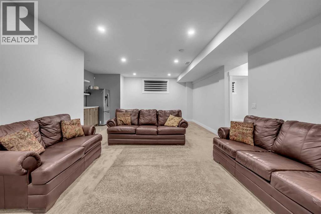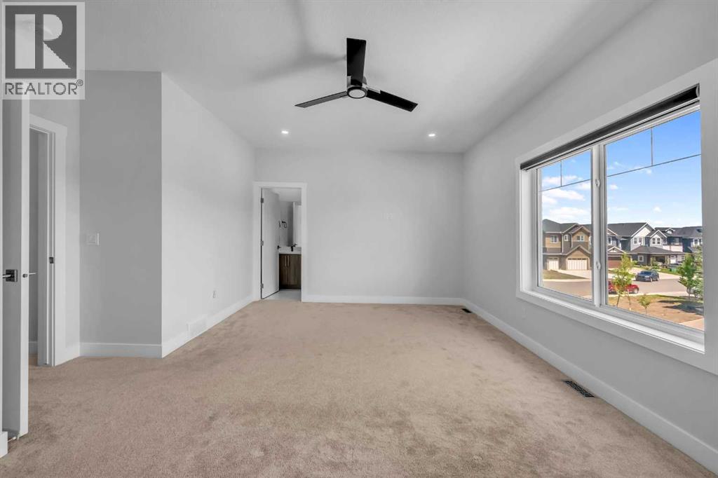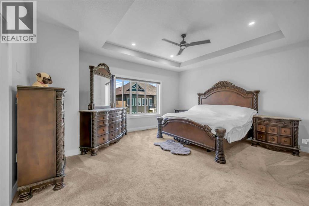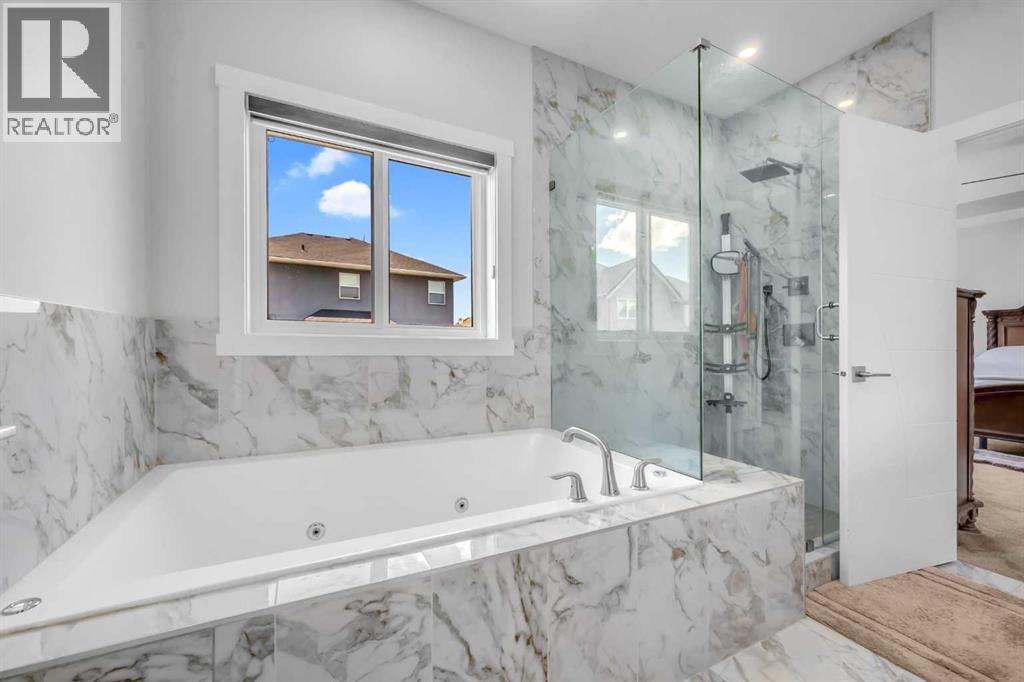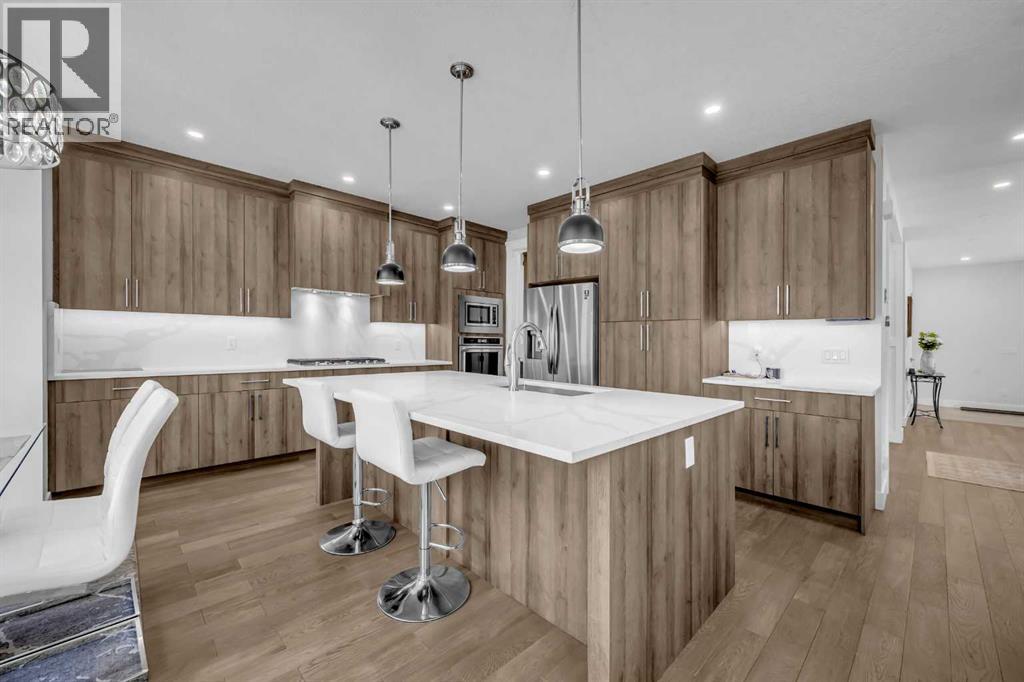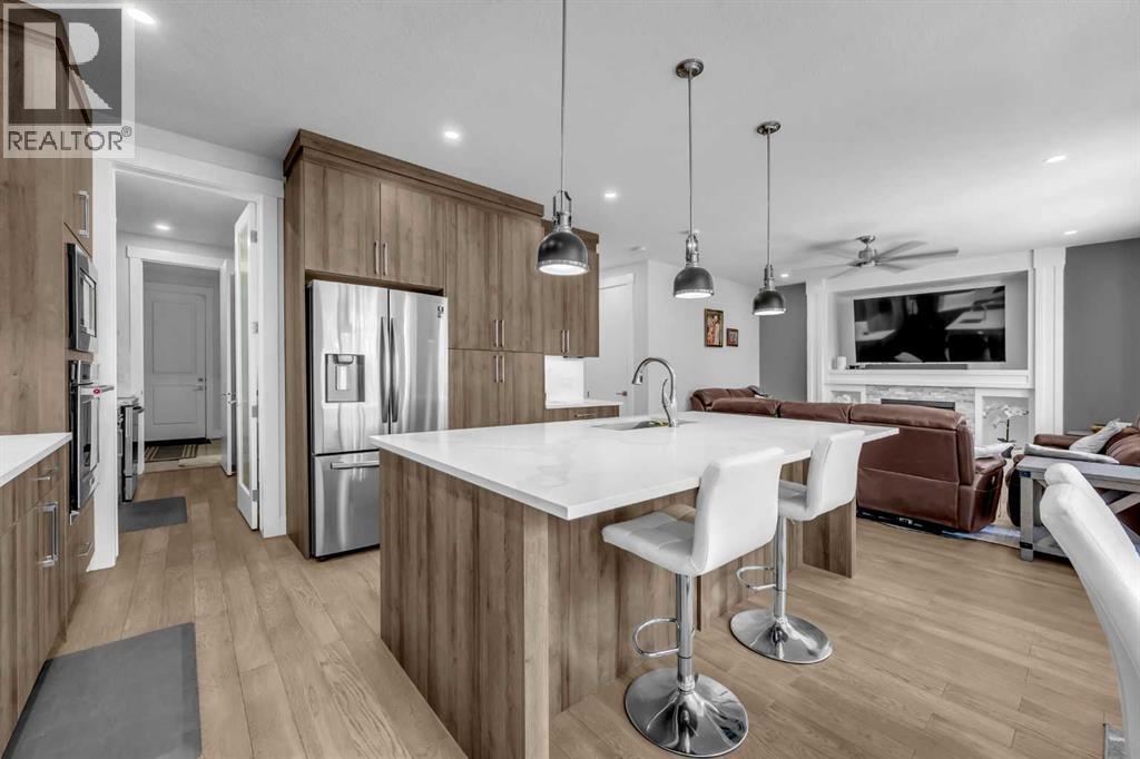 Welcome to this exceptional luxury estate nestled in the highly sought-after Kinniburgh community of Chestermere. This meticulously crafted home offers the perfect blend of sophistication, comfort, and modern convenience, making it the ideal retreat for discerning buyers. With 9ft ceilings on every floor, this home exudes a sense of spaciousness throughout. From the moment you arrive, you'll be captivated by the striking stucco exterior that exudes timeless elegance. The attached triple garage provides ample space for vehicles and additional storage. The property is fully landscaped both front and back, creating an inviting and picturesque setting. The backyard is a true oasis, featuring an exposed concrete patio, perfect for outdoor entertaining, barbecues, or simply enjoying the tranquility of your private retreat. Step through the grand entrance and be greeted by a spacious living room, enhanced by the soaring 9ft ceilings. The seamless flow takes you into the formal dining room, an ideal space for hosting family gatherings and dinner parties. The heart of the home is the expansive family room, where a beautifully centered fireplace serves as the focal point, flanked by custom-made shelving. The gourmet kitchen is a chef’s dream, featuring cabinetry that extends to the ceiling, offering abundant storage space. High-end built-in appliances, including a gas stove, ensure that cooking is both a pleasure and an art. Adjacent to the main kitchen is a fully equipped spice kitchen, perfect for preparing more aromatic or intricate dishes. The spice kitchen leads directly into the mudroom, providing a practical transition space when coming in from the garage. For added convenience, the main level includes a well-appointed 2-piece bathroom. However, if desired, this space can easily be converted into a 3-piece bathroom by extending into the mudroom. Upper level you’ll find four generously sized bedrooms, each thoughtfully designed to provide a peaceful retreat. The 9ft ce ilings continue on this level, enhancing the sense of openness and luxury. The bonus room offers additional living space, perfect for a play area, home office, or media room. Two of the bedrooms are exquisite primary suites, each offering its own private ensuite bathroom. The larger of the two primary suites is a true sanctuary, featuring a spa-like 5-piece ensuite with a luxurious jetted tub, a glass-enclosed standing shower, and dual vanities, creating the perfect setting for relaxation. The second primary suite is equally impressive, offering a 3-piece ensuite with a sleek glass shower. The fully finished basement offers even more living space for your family and guests. With 9ft ceilings, the basement feels open and airy, creating a welcoming environment. Separate side entrance the basement includes a vast recreation room, perfect for hosting gatherings, movie nights, or a home gym.The wet bar adds a touch of luxury, making entertaining a breeze. Additionally features two spacious bedrooms and 4pc. (id:53676)