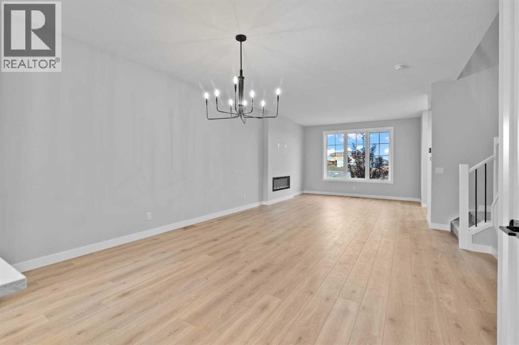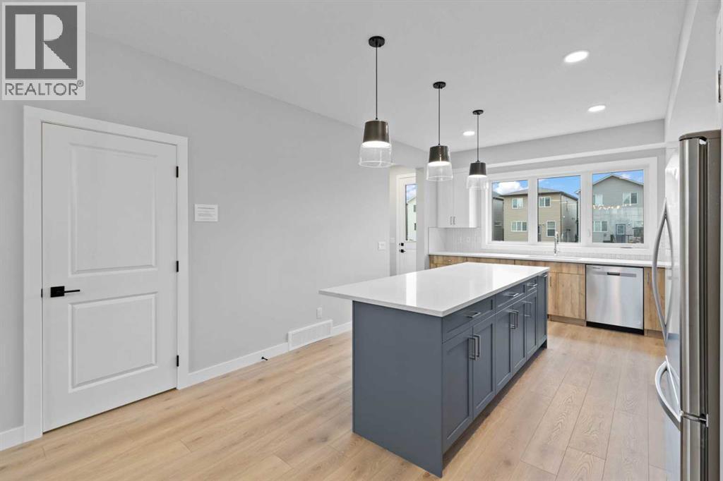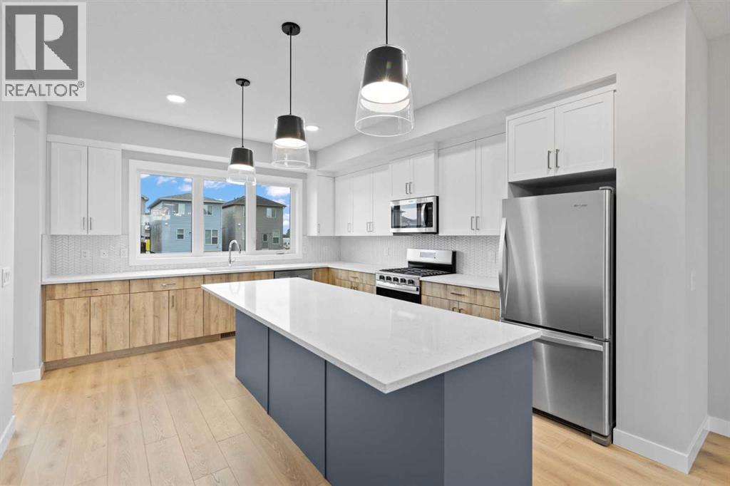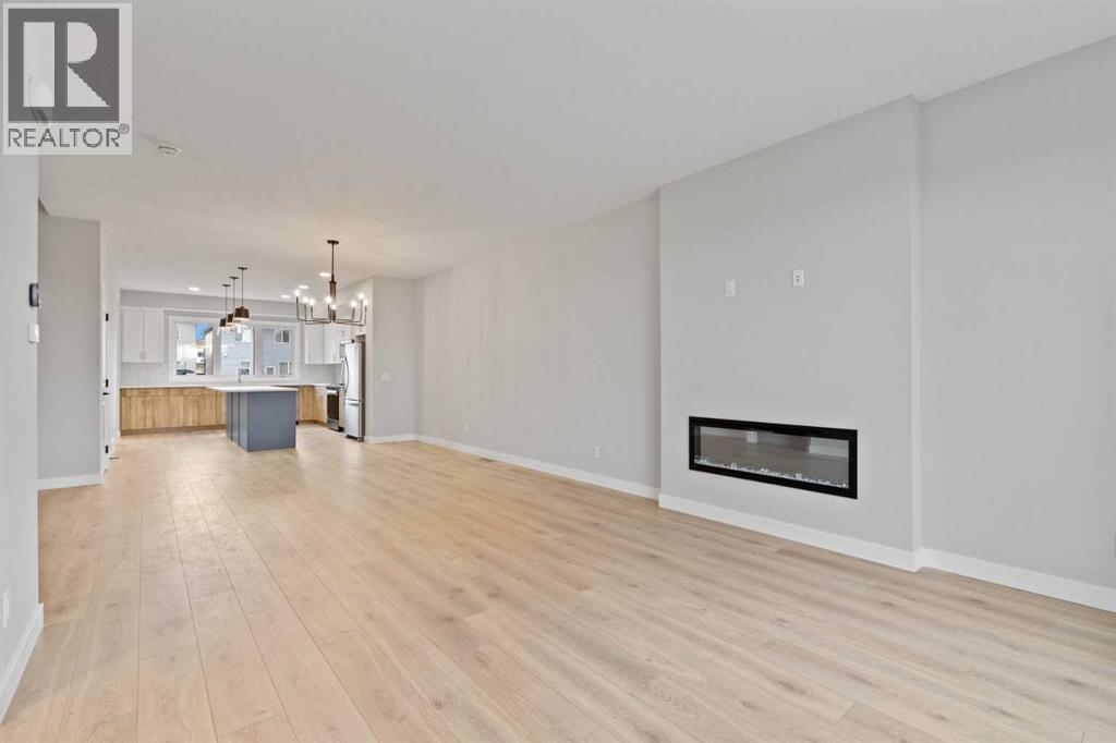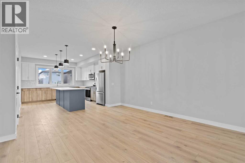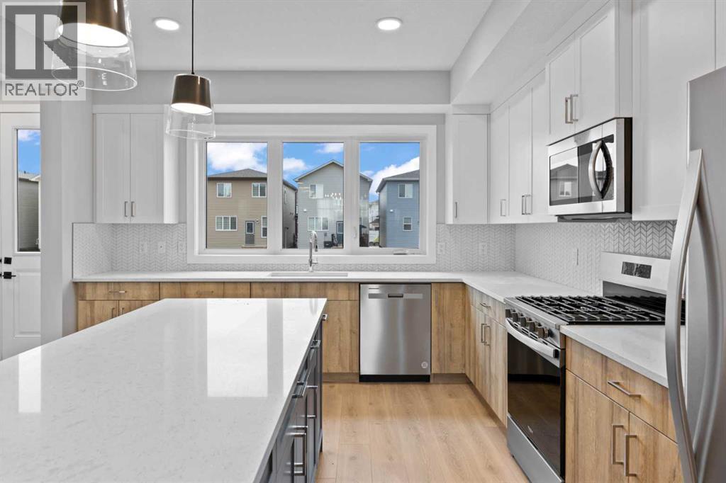 IMMEDIATE POSSESSION | 1,804 SQ.FT. | 3-BED | 2.5-BATH | SEPARATE SIDE ENTRANCE | 9' BASEMENT | UPGRADED KITCHEN | FRONT LANDSCAPING | This stylish NEW HOME by Crystal Creek Homes offers an OPEN MAIN FLOOR with 9-foot ceilings and a stunning rear kitchen designed for everyday function and entertaining. Full-height cabinets, quartz countertops, a GAS RANGE, and a large island provide plenty of space for cooking and storage. The great room, complete with an electric FIREPLACE, feels bright and welcoming. Upstairs are three bedrooms, a main bath, and an extra LARGE LAUNDRY ROOM. The primary bedroom includes a modern ensuite with thoughtful finishes. The 9' BASEMENT and separate SIDE ENTRANCE allow for future legal suite potential (subject to City approval and permitting). Set on a quiet street near a future school and soccer field, this home features durable HARDIE BOARD SIDING and quick access to Stoney Trail, East Hills shopping, and downtown Calgary. Book your showing today or visit the Crystal Creek sales centre at 272 Belvedere Drive SE, open Monday to Thursday 2–8 pm and weekends and holidays 12–5 pm. (id:53676)