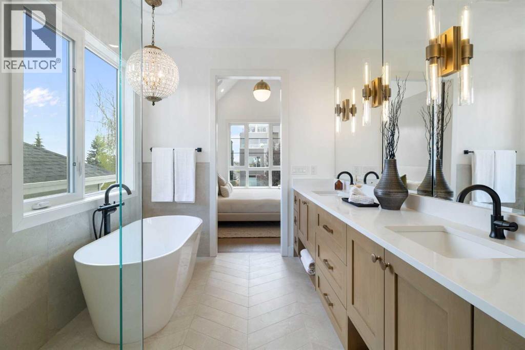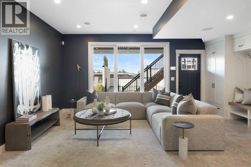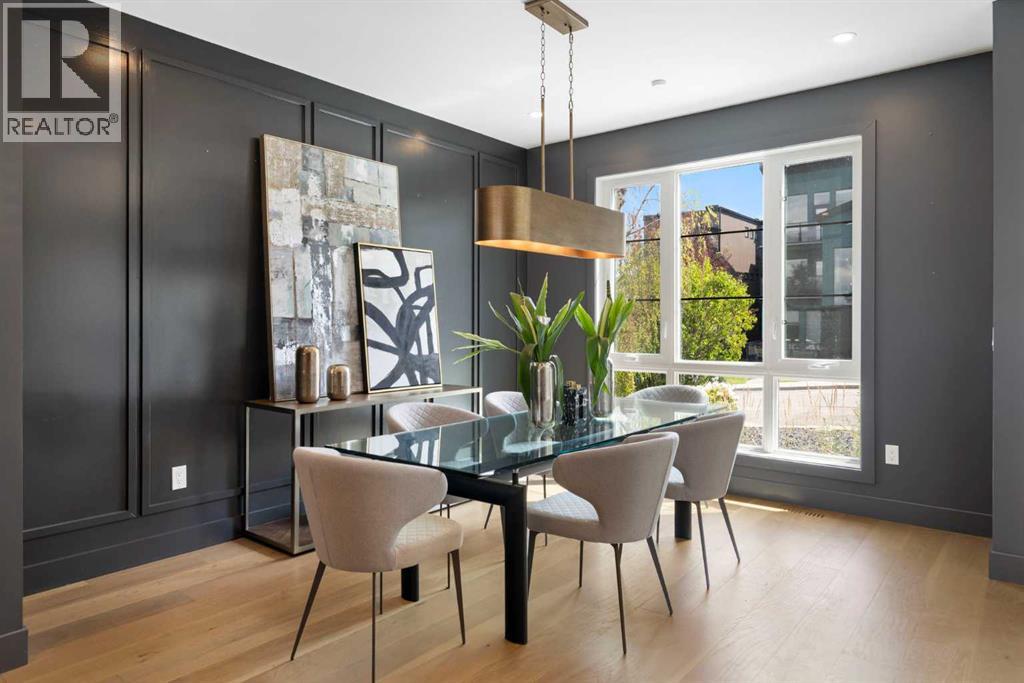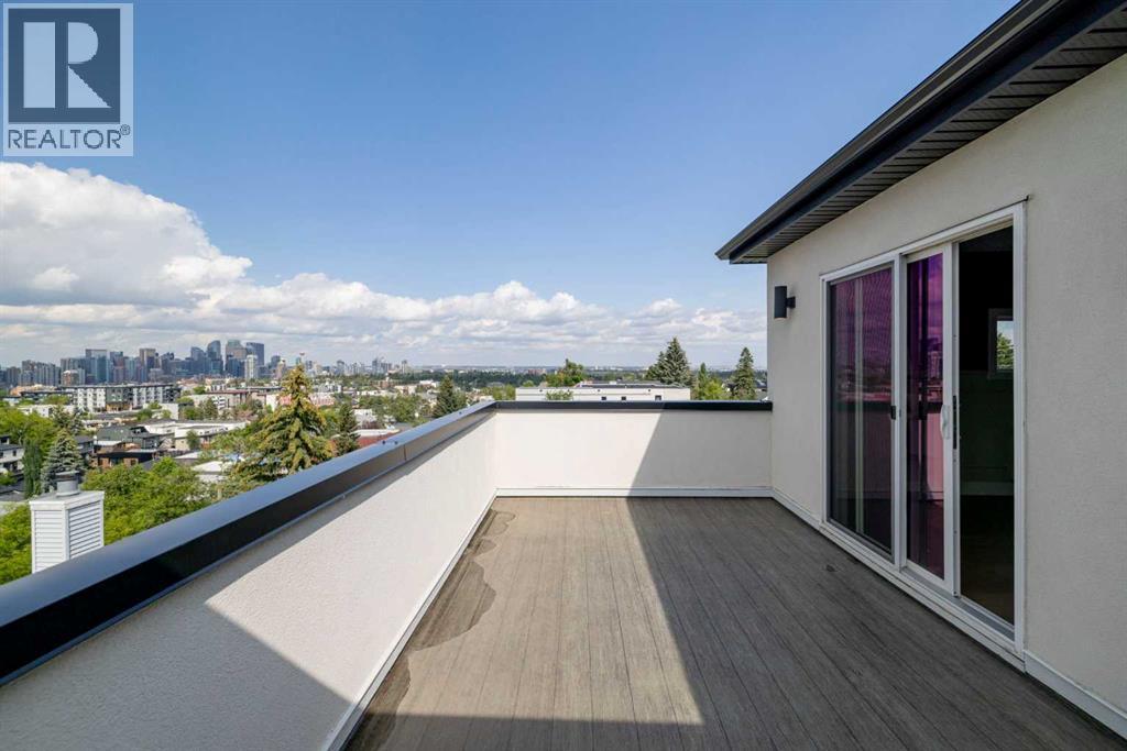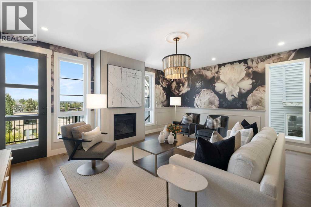 Welcome to this architecturally stunning, contemporary home perched on one of Calgary’s most coveted streets, 29th Avenue SW which offers breathtaking panoramic views of the downtown skyline. This elegant semi-detached residence delivers over 3,200 sq ft of sophisticated living across four beautifully finished levels. Upon arrival, you're greeted by fantastic curb appeal, professional landscaping front and back, and an inviting street-level main floor entry that transitions seamlessly to a sun-filled rear deck complete with gas BBQ hookup. The open-concept main floor is an entertainer’s dream: wide-plank hardwood floors, soaring ceilings, and abundant natural light set the stage for elegant gatherings. The formal dining room flows effortlessly into a chef’s kitchen appointed with a high-end Bertazzoni gas range, double Even-Temp fridge, Braun dishwasher, two wine fridges, quartz countertops, large island with eating bar, pantry, and premium fixtures. The spacious living room with gas fireplace creates an inviting atmosphere, and a stylish powder room completes this level. Upstairs, the second level features three spacious bedrooms and a convenient laundry room with sink. The luxurious primary retreat impresses with vaulted ceilings, a generous walk-in closet with organizers, and a spa-like 5-piece ensuite with heated floors, oversized glass shower (roughed-in for steam), and a freestanding soaker tub — all designed for ultimate relaxation. The third level loft is a standout highlight, perfect for entertaining with a wet bar, full bathroom, and an expansive terrace where you can take in the sweeping 270-degree city views — ideal for summer evenings and sunset cocktails. The fully finished walk-out basement enhances the living space with a large family/media room with custom built-ins, a second wet bar, fourth bedroom, full bathroom, mudroom, and a walkout patio that extends the living area outdoors. Enjoy comfort year-round with in-floor heating (basement), forced-ai r heating, and a recently added 2-zone air conditioning system. The detached double garage is insulated, heated, plumbed for vacuflow, features an electric car charger, and provides ample space for storage and parking. Additional thoughtful touches include 9’ ceilings, designer lighting, custom millwork, upgraded garage door opener, security system with cameras, ceiling speakers throughout, and energy-efficient mechanicals. Located in vibrant South Calgary, this home is walking distance to Marda Loop’s boutique shops, restaurants, wine bars, breweries, parks, playgrounds, dog park, bike tracks, community garden, outdoor pool, excellent schools including Richmond School, Rundle College, Montessori programs, and transit routes including 14th Street and close proximity to the Ring Road. A rare opportunity to own a turn-key urban luxury home with unbeatable views in an unbeatable location — this home truly has it all! (id:53676)