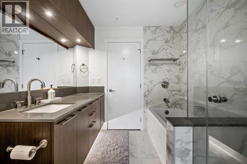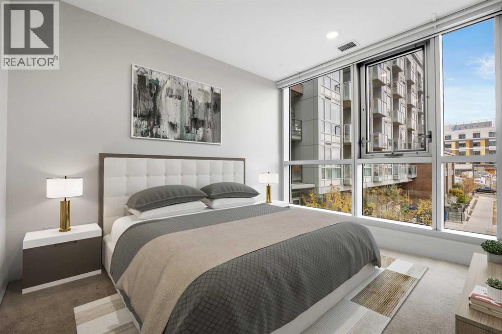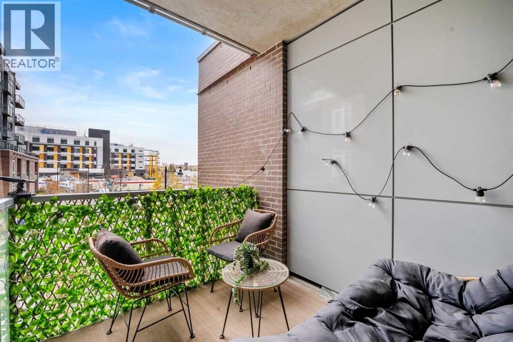 ***OPEN HOUSE Sunday Nov 9th 1-3pm***Experience modern urban living without compromise in this like-new suite featuring HIGH CEILINGS with a knockdown finish and an OPEN CONCEPT floor plan. The KITCHEN is equipped with high-end STAINLESS STEEL APPLIANCES, including a BOSCH GAS STOVE, FISHER & PAYKEL FRIDGE, double sinks, dishwasher, QUARTZ COUNTERTOPS, and seating for three at the peninsula. Enjoy EXTRA TALL CABINETS, SOFT-CLOSE HARDWARE, UNDER-COUNTER LED LIGHTING, and a MICROWAVE HOOD FAN.The LIVING ROOM flows seamlessly to a BALCONY overlooking a GREEN BELT. The PRIMARY BEDROOM features FLOOR-TO-CEILING WINDOWS and a WALK-THROUGH CLOSET leading to a CHEATER ENSUITE with a SOAKER TUB, glass shower, EXTRA CABINETRY FOR STORAGE, QUARTZ COUNTERTOP, and LED LIGHTING. Additional highlights include a STACKED WASHER/DRYER (WHIRLPOOL) and a SPACIOUS ENTRY AREA with room for a DESK OR HOME OFFICE.Residents enjoy AMENITIES GALORE, including TWO GYMS, a PET SALON, a FANTASTIC ROOFTOP PATIO, SPIN ROOM, YOGA ROOM, STORAGE LOCKER, BIKE ROOM, TUNE-UP ROOM for bikes, skis, or snowboards, and a CAR WASH.All this is located in a LEED-CERTIFIED BUILDING, just steps from PARKS, SHOPPING, DOWNTOWN, and RESTAURANTS in the vibrant community of BRIDGELAND. Enjoy a CAREFREE URBAN LIFESTYLE or take advantage of the EXCELLENT INVESTMENT POTENTIAL as a landlord. (id:53676)