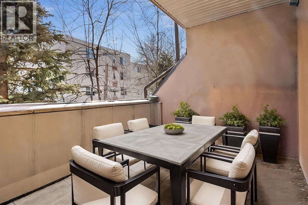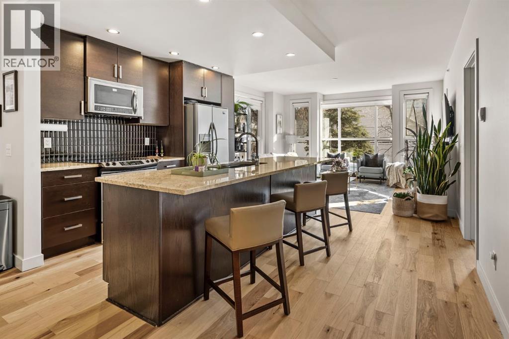 Welcome to unit #203 in the stylish Tweed building. This concrete-built low rise residence is tucked away on a quiet street between Calgary’s buzzing 17th Avenue and the coveted Mission neighbourhoods. Here, you are steps from the city’s best dining, cafés, boutiques, and nightlife, yet surrounded by the charm of mature trees and a neighbourly atmosphere.This second floor corner unit invites you in with an airy, open-concept design bathed in morning light from floor-to-ceiling east-facing windows. Recently updated, light wood flooring, tall ceilings, and a sleek gas fireplace create a welcoming, yet modern tone. The kitchen blends beauty and function with a large stone-topped island, stainless steel appliances, and flat-panel wood cabinetry, while the dining space sets the stage for everything from lively dinner parties to quiet meals at home.The primary suite is a personal retreat with statement wallpaper, both a walk-in and walk-up closet, and a spacious ensuite featuring double vanities, a large shower, and linen storage. The second bedroom has its own ensuite, ideal for guests, roommates, or a dedicated home office.Step outside to your private, tree-shielded patio with a gas hookup for barbecue, perfect for unwinding after the day. Additional perks include in-suite laundry, window coverings, a titled underground parking stall, and an assigned storage locker. Concrete construction ensures quiet, private living, while the building’s intimate scale—two elevators serving only four storeys—adds to its boutique appeal.With a well-managed condo board, healthy reserve fund, and strong owner occupancy, this move-in-ready home delivers on style, location, and lifestyle. Whether it’s your first home, a sophisticated upgrade, or an investment in one of Calgary’s most walkable communities, unit 203 in the Tweed offers the perfect blend of city energy and retreat-like comfort. (id:53676)