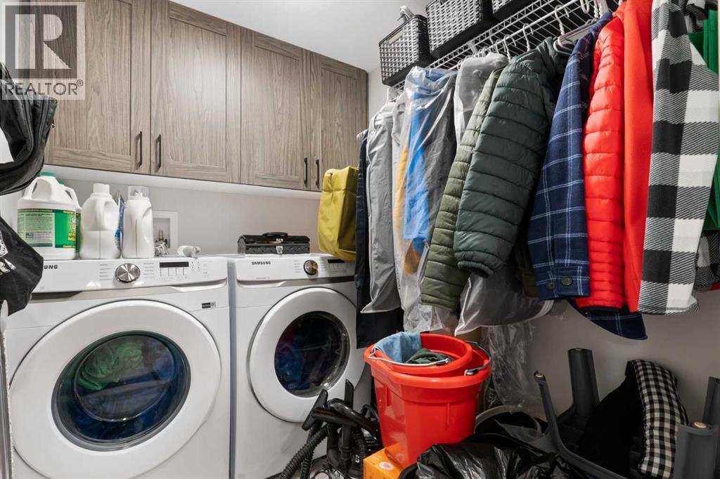 Step into comfort, style, and elevated living in this beautiful 2-bed, 2-bath condo in The Rise at The Parks of Harvest Hills. Built by Cedarglen Homes, and lovingly maintained by its original owners, this home stands out with premium upgrades and central AC for year-round comfort. From the moment you arrive, pride of ownership is evident. The welcoming entry leads into a bright, modern kitchen that makes both everyday cooking and hosting feel special. Featuring a large island with seating, quartz countertops, stainless steel appliances, and a stylish chevron tile backsplash that create a high-end look and feel. Plenty of cabinetry and a pantry give you the storage every homeowner wants without sacrificing clean, contemporary design. Luxury vinyl plank flooring runs throughout the main living spaces for durability and a modern finish. In the dining area, the builder-upgraded built-in adds character and practical storage, making entertaining effortless. The spacious living room has the perfect layout for relaxing, movie nights, or hosting game night with friends. Slide open the patio doors to your oversized private balcony. With room to lounge or dine, built-in exterior lighting, and a BBQ gas line ready to go, this becomes an outdoor extension of your home that you will love from morning coffee to summer evenings. The primary bedroom is tucked away on its own side of the home for privacy and peace. There is plenty of space for a king-sized bed and additional furniture, while the walk-in closet features custom built-ins designed to keep life organized. The 4-piece ensuite is bright, fresh, and calming. It feels like your own personal retreat at the end of a long day. Across the unit, the second bedroom offers flexibility for guests, a roommate, a nursery, or the perfect work-from-home office. The adjacent 3-piece bathroom includes a full-size walk-in shower with upgraded fixtures for a sleek and modern finish. Back near the entry, the laundry room truly sets this hom e apart. Builder-installed upper cabinets and extra shelving ensure everything has a place and stays clutter-free. A luxury rarely found in condo living. This space also doubles as your front closet with plenty of room for shoes and jackets. Your titled underground parking stall is conveniently just steps from the elevator, making grocery runs effortless. An assigned storage locker and secure bike storage are also included on the same lower level, giving you even more room for the things you love. You are perfectly positioned here. Minutes from the airport, close to Deerfoot and Stoney Trail, and a short stroll to restaurants, local shops, Landmark Cinemas, parks, tennis courts, and schools. Convenience and comfort come together seamlessly. Whether you are downsizing, investing, or purchasing your first home, this upgraded condo offers a level of quality and lifestyle that truly stands out.Welcome home to The Rise at The Parks of Harvest Hills. (id:53676)