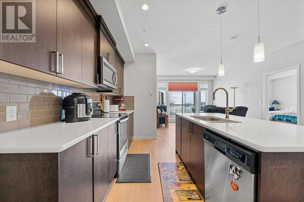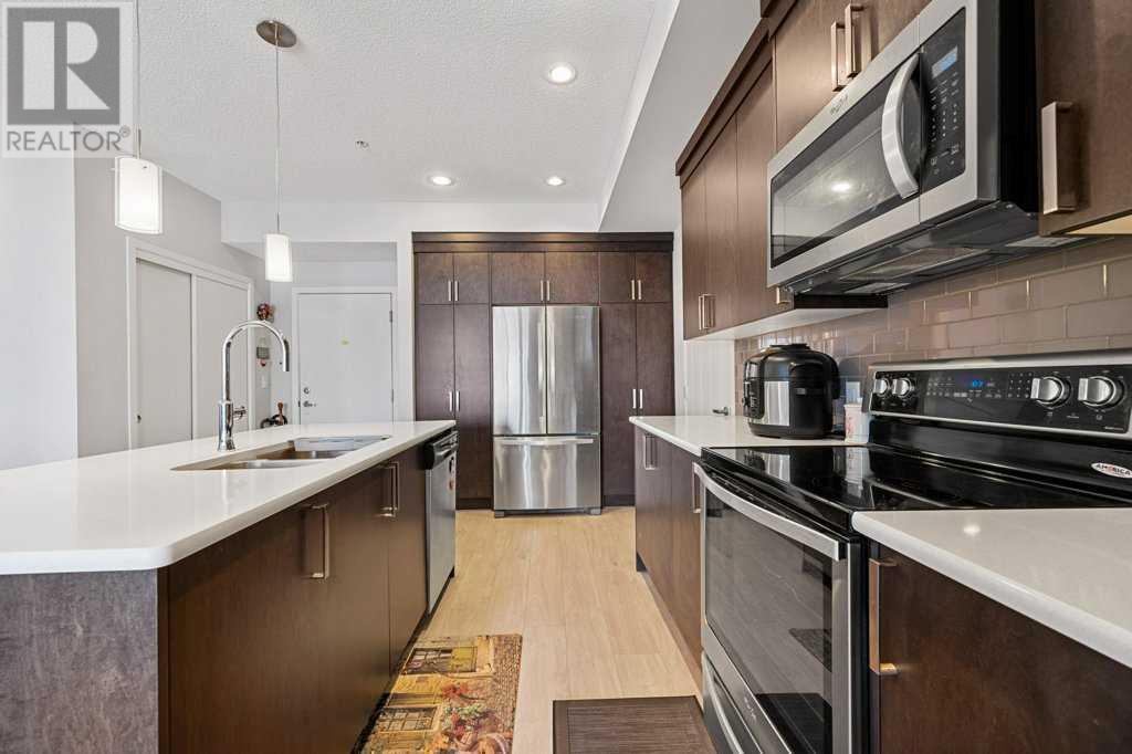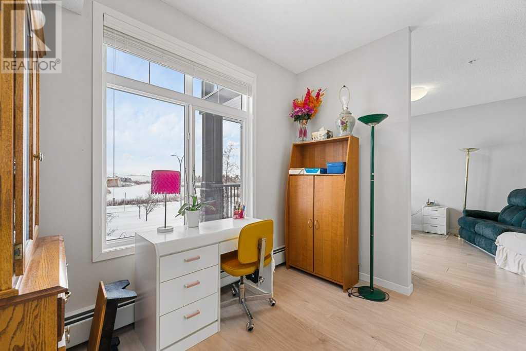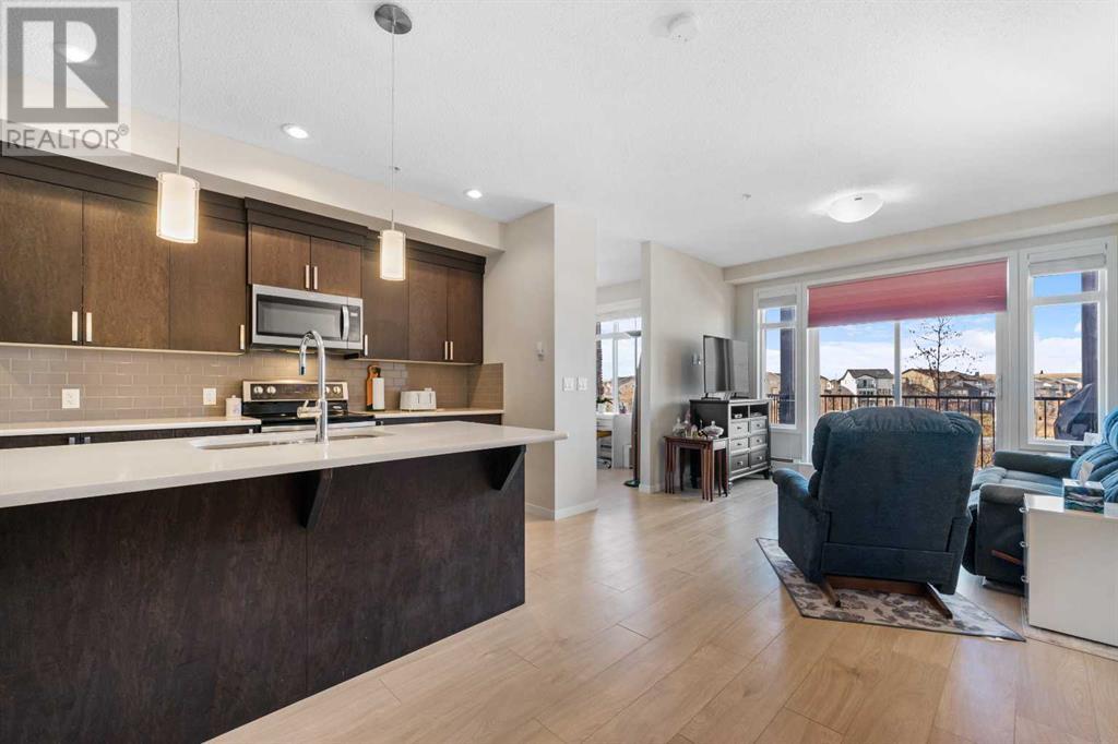 Welcome to “The Elements” a popular Cedarglen built, low maintenance lifestyle development in the amenity rich community of New Brighton. Community Centre, water park, winter ice skating, play parks etc. Close to the Hospital, shopping, restaurants, schools & Fish Creek Park. Express bus to City Centre. This unit has a fabulous location with views from every principal room & the spacious balcony of a beautiful wetlands park with paved pathways to stroll through nature & enjoy picturesque views. Inside you will discover an open, airy plan featuring 9-foot-high ceilings & loads of light flooding in thru numerous large windows. Enjoy low maintenance vinyl plank flooring. 2 spacious bedrooms plus a den, 2 full baths, in unit laundry & storage room. The massive kitchen offers a plethora of modern cabinets, quartz countertops, stainless steel appliances & a large island with sit up breakfast bar. The spacious kitchen is open to the dining & great rooms creating the perfect space for entertaining. This is the 3rd largest floorplan in the development plus it comes with two parking stalls & storage cage, very rare to get! (id:53676)