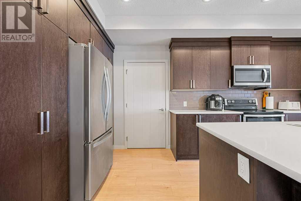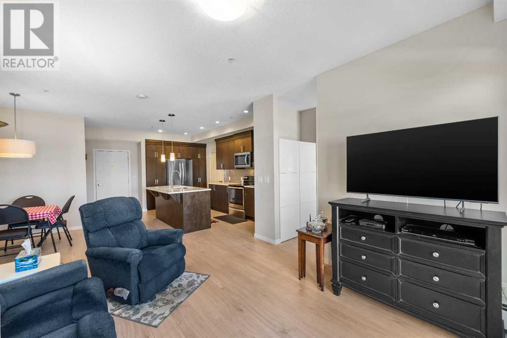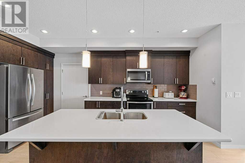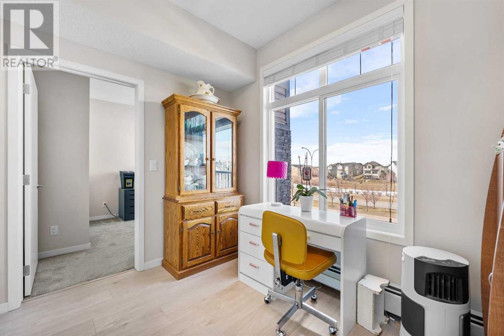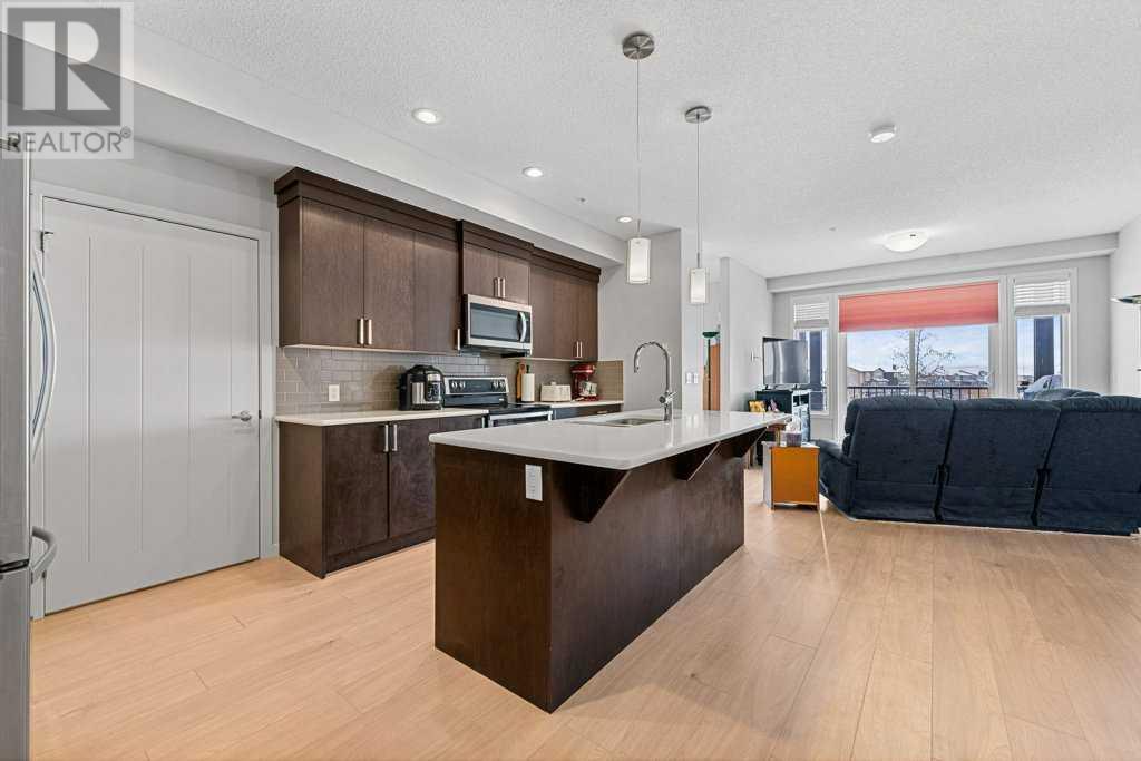 Welcome to “The Elements” a popular Cedarglen built, low maintenance lifestyle development in the amenity rich community of New Brighton. Community Centre, water park, winter ice skating, play parks etc. Close to the Hospital, shopping, restaurants, schools & Fish Creek Park. Express bus to City Centre. This unit has a fabulous location with views from every principal room & the spacious balcony of a beautiful wetlands park with paved pathways to stroll through nature & enjoy picturesque views. Inside you will discover an open, airy plan featuring 9-foot-high ceilings & loads of light flooding in thru numerous large windows. Enjoy low maintenance vinyl plank flooring. 2 spacious bedrooms plus a den, 2 full baths, in unit laundry & storage room. The massive kitchen offers a plethora of modern cabinets, quartz countertops, stainless steel appliances & a large island with sit up breakfast bar. The spacious kitchen is open to the dining & great rooms creating the perfect space for entertaining. This is the 3rd largest floorplan in the development plus it comes with two parking stalls & storage cage, very rare to get! (id:53676)