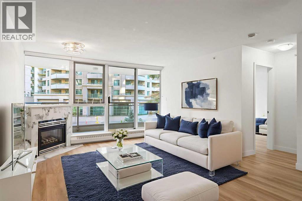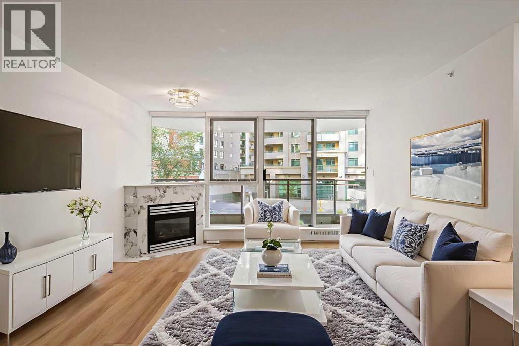 Ideally located in the quiet west end of downtown, this renovated 2-bedroom, 2-bathroom unit in The Marquis offers nearly 1,000 sq ft of bright, open-concept living space. Just steps from the Bow River pathways and only 2 minutes to the C-Train (within the free fare zone). Features include granite countertops, new stainless steel appliances, vinyl plank flooring, a gas fireplace, and a south-facing, tree-lined balcony. The oversized primary bedroom includes a full ensuite and direct balcony access. The second bedroom is situated near the second full bathroom, ideal for guests or roommates. Additional conveniences include quick stair access (bypassing elevator wait times) and close proximity to the titled underground parking stall. Building amenities include a fitness center, yoga studio, party room, landscaped courtyard, secure bike storage, and visitor parking. Pet-friendly building (with board approval; under 20 lbs). Walkable location close to Kensington, river trails, cafes, restaurants, and downtown amenities. (id:53676)